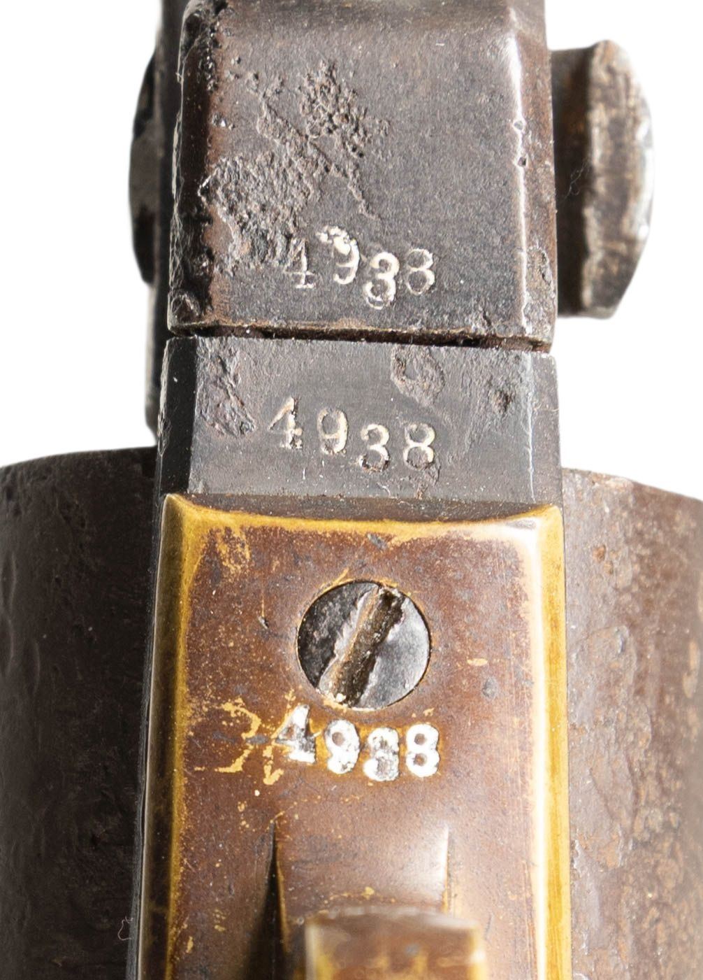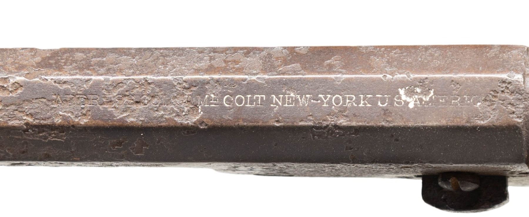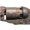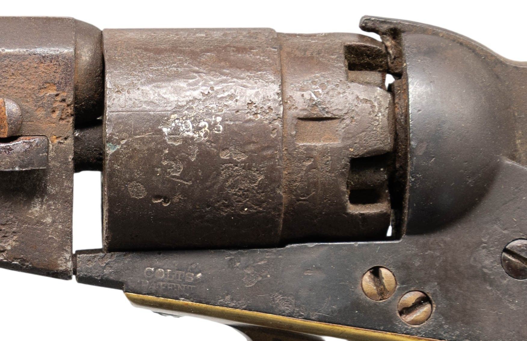 REVOLVER. Cal. 36. S# 4938. Standard configuration made in 1861, 6.5" octagonal barrel with 1-line NEW YORK US AMERICA address, small "COLT'S / PATENT" on frame. Brass trigger guard and backstrap hold varnished walnut grips. Roger's card states purchased from Harold Herglotz and gun was picked up on battlefield and returned to his home in Demopolis where it remained. UNATTACHED ACCESSORIES: hand drawn colored collection card by Roger Ballard, his first gun #1, bought in 1980s. CONDITION: good overall, all matching and complete, heavily pitted, address is still mostly discernibleMechanically fine, good rifled bore, grips retain traces of their original factory varnish, hand worn patina. PROVENANCE: Roger Ballard Estate Collection. (01-28702/JS). ANTIQUE. $800-1,200.