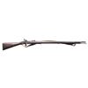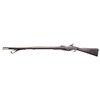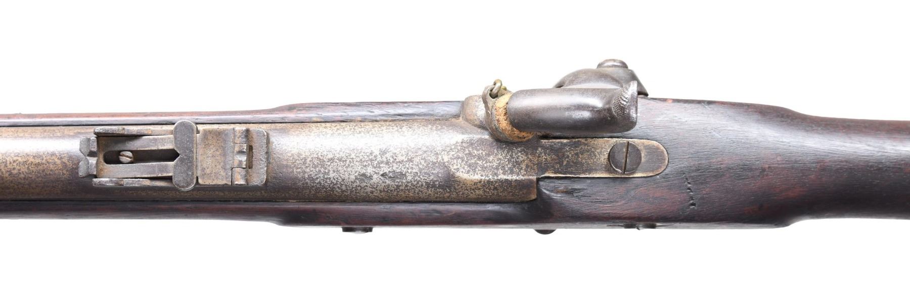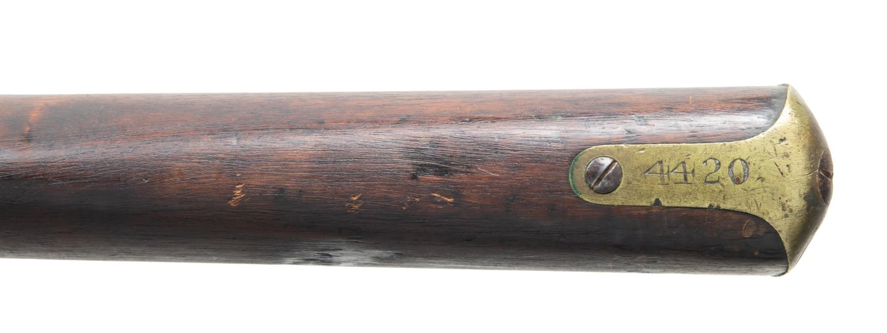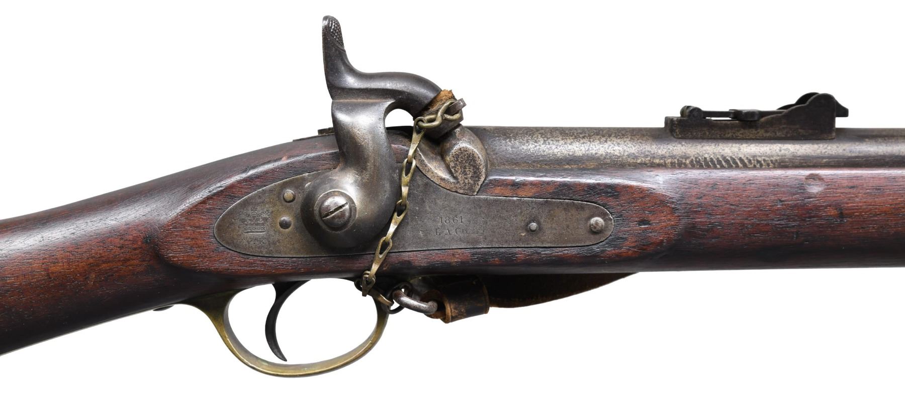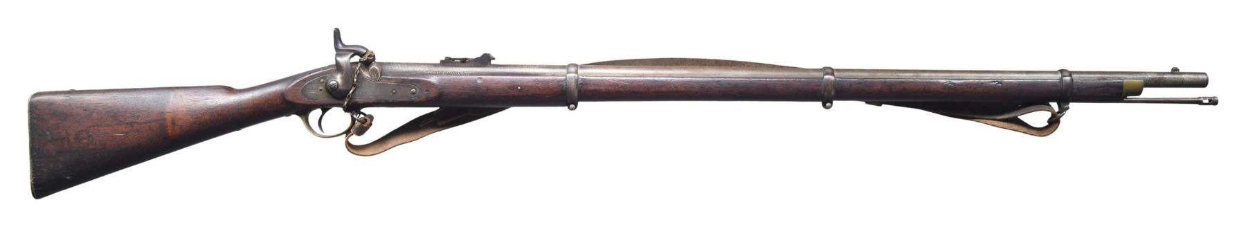ENFIELD RIFLED MUSKET. Cal. 577. S# 4420. Standard pattern 1853 Enfield rifled musket, the most prolific longarm weapon of the Confederate infantryman during the Civil War. Lock marked: "1861 / L. A. Co." forward of hammer, and rear of hammer with a crown and "VR". Stock has round cartouche which reads "London Armory Company / 1861". "4420" engraved on buttplate tang. Accompanied by period brown leather sling and chained original nipple protector. CONDITION: good to very good overall, appears complete & original including sling swivels & rear sight which are often missing. Stock has erosion, makers cartouche is visible in outline only. Mechanics fine, clear smooth bore with worn rifling. (01-26902/JS). ANTIQUE. $3,000-4,000.
