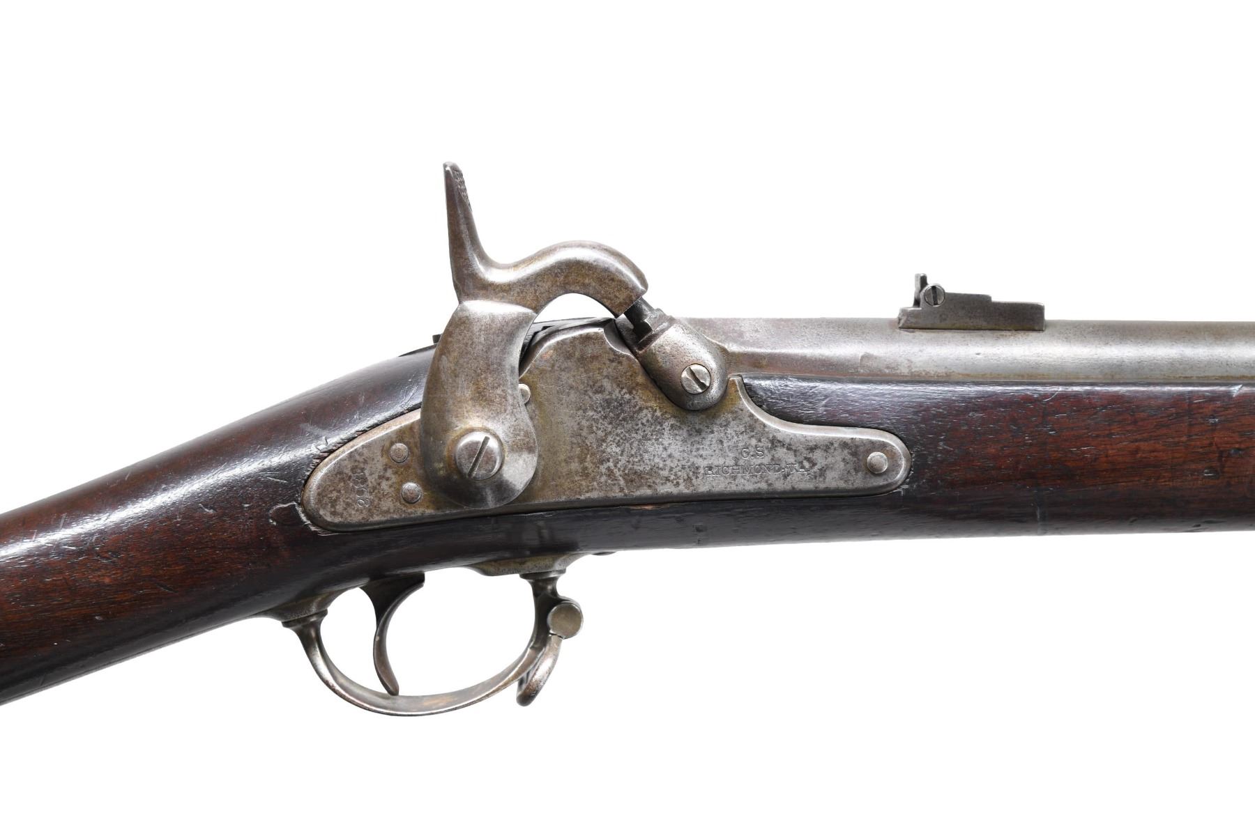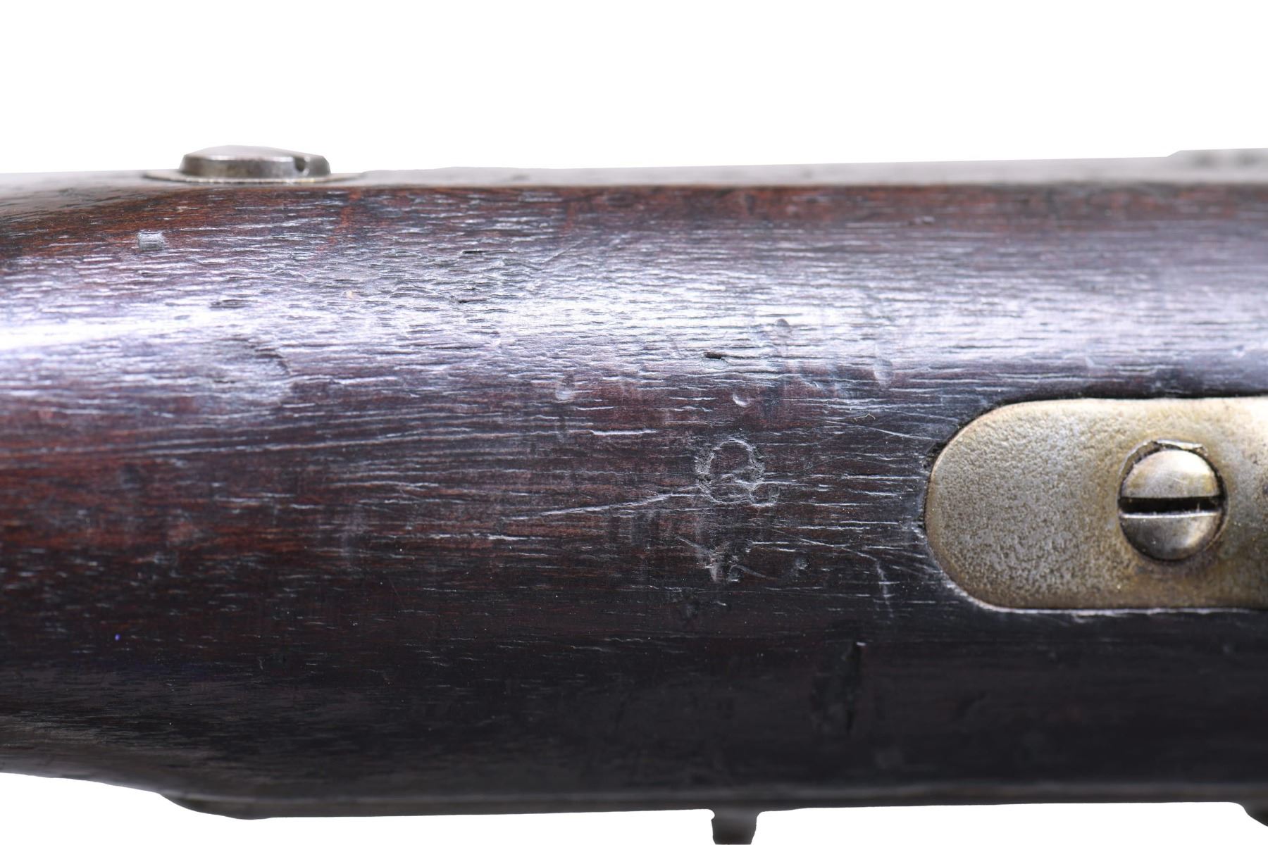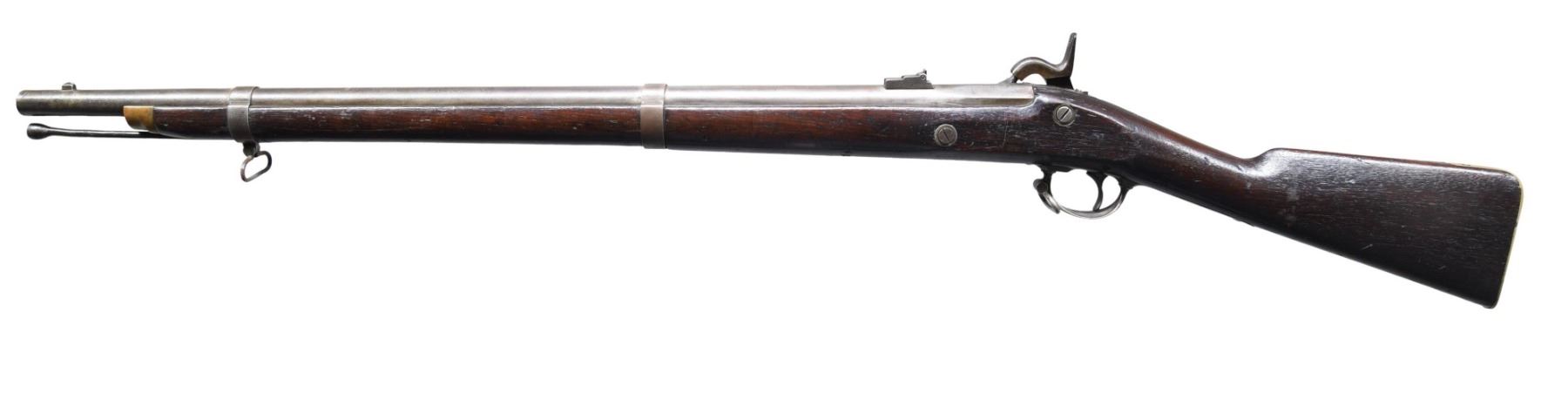 Cal. 60. NSN. This is an interesting original configuration on altered 1855 Harpers Ferry stock slenderized on butt with small 3-screw brass butt plate and screwed brass nose cap, 26.5" smoothbore barrel with only "V" proof visible, Richmond/Harpers Ferry rear sight, and Richmond barrel bands with large "U"s struck towards center. Lock is early 1862 dated Richmond. Ramrod is 27.5" straight Richmond type. Internally, barrel has Harpers Ferry proofs on back of barrel and below bolster. Added Confederate C&R proofs are observed on back of barrel and replaced/repaired breech plug and bottom of barrel. "Q" "Cleaned and Repaired" proof stamped on stock forward of triggerguard. This is among the most unusual, complete, original, and unaltered Confederate short rifle or musketoon I have encountered. (01-26905/JS). ANTIQUE. $4,000-6,000.