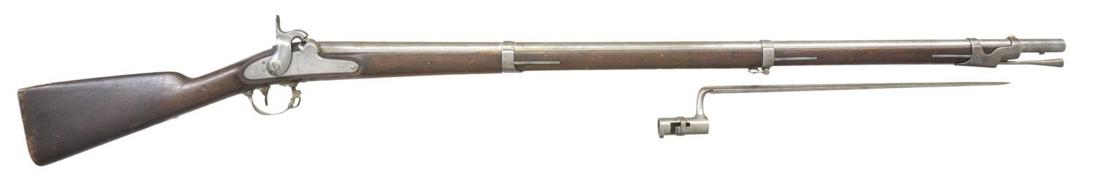 1842 MUSKET. Cal. 69. NSN. Standard configuration model 1842 Springfield musket dated 1848 and was among the thousands of longarms captured during Lee’s Overland campaign. Steve Knott brings to light in depth research in his text “Captured & Collected” Confederate Reissued Firearms”. These long arms for many years were always a curiosity with the various stamped letters on bottom of stocks of many Union and Confederate long arms. We now understand that various Confederate armories repurposed the many thousands of arms captured. Several letter stamps are found that designate these reissued arms. The “Q” stamped forward of trigger guard is one of the two most common letters found and Knott believes it refers to Richmond armory. Many of these reissued guns have mixed parts, from several guns to make one functional gun, many were just rusted on the battlefield when found & only needed cleaning & polishing. This musket has had lock and barrel proofs polished out which is commonly seen on arms that had been recovered on battlefield as heavy rust had to be removed and put back to armory bright. The “C&R” departments went though many hundreds of pounds of crocus and emery powder used for polishing metal. Some old descriptions of minty condition Civil War muskets use the term “weakly struck” when actually C&R. CONDITION: very good overall, barrel & lock marking mostly polished out,“Q” CS inspection crisp and deeply struck. There is a suspect small “US” in oval stamped behind triggerguard. Mechanically fine with clear smooth bore. Well fit bayonet is very good, stamped “M 8” over partially removed “US”. PROVENANCE: From the Lifelong Collection of Glen E. Mattox. (01-22479/JS). $2,000-3,000.