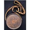 ROLLER BUCKLE HEAVY CANVAS SLING. "As found" attic condition classic wood canteen with 2 iron bands & 3 sling loops still attached with original heavy Confederate canvas sling with roller buckle. These slings are very rare. Wood has fine smooth hand worn surface. Once in the collection of Confederate authority Steve Mullinax who had among the finest Confederate canteen collection ever assembled. 7.25" diameter, 2.25" height, about 5 ft sling. This is a fine beautiful survivor.