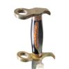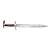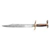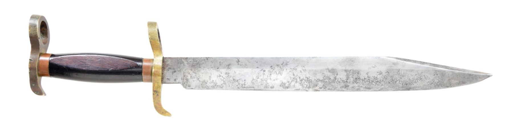 17" overall, 12" clip point blade. This is a fine example of a classic Confederate bowie made with unfinished brass muzzle rings, well finished & varnished rosewood grip. Norm Flayderman in his monumental text "The Bowie Knife", states "the only mention of the term 'Bowie-Bayonet' in literature leading up to the Civil War is made by U.S. Admiral John Dahlgren who coined the term for his knife used on a navy rifle". His lesser-known brother Confederate General Charles Dahlgren notes in early war telegrams that he wishes "Bowie knives put on guns, Cook in New Orleans can do it" & in a second telegram a few days later he wishes the bowie knives not get put on guns. This explains the reason for such variation in the "muzzle rings" or lack of muzzle rings plus filed muzzle rings. Rosewood is rare & almost never seen on Confederate weapons; the exception are these bowies. New Orleans is well known for the use of rosewood on antebellum bowies & surgical tools. UNATTACHED ACCESSORIES: copy of article concerning Cook and Brother's manufacture of these Bowie bayonets. CONDITION: very good overall, gray blade, old sharpening, nick in cutting edge. (02-22911/JS). NON-GUN. $2,000-2,500.