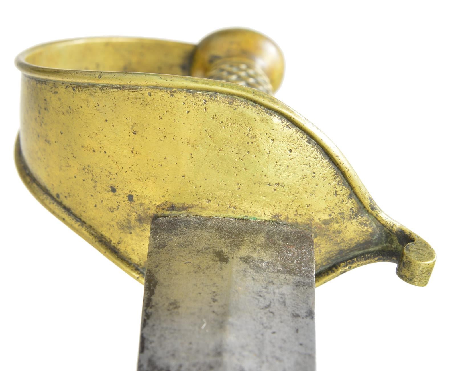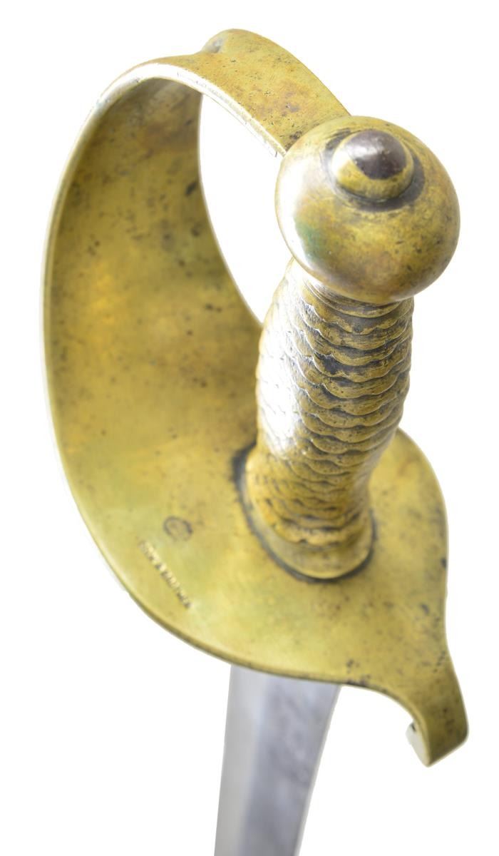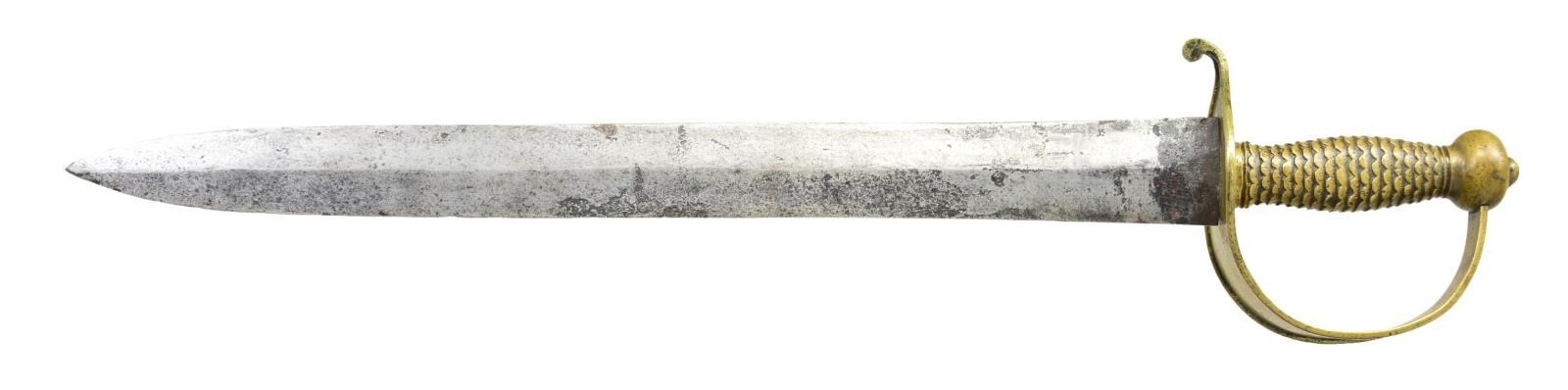 CUTLASS. 26" Overall, 20.75" heavy double edged blade with medial ridge. "COOK & BROTHER" stamped on top of large cast guard, feathered handle. These scarce cutlasses were made in New Orleans late 1861 & early 1862 before Union capture. CONDITION: very good overall, mottled gray stained & pitted iron patina, brass patina to guard, crisp makers mark. (02-19097/JS). $2,500-3,500.