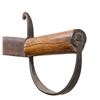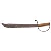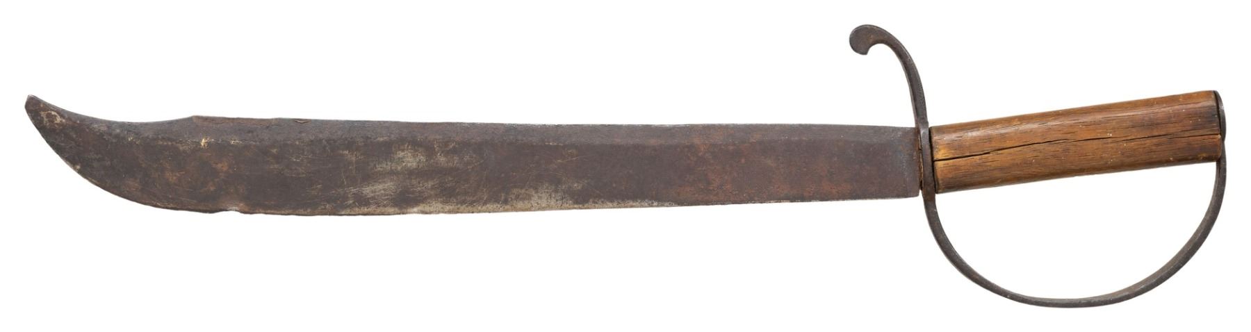 18" overall, meaty 13" upswept cocked clip point blade, .35" thick at ricasso, wide beveled top edge, turned wood grip, sculptured tapered D-guard with teardrop shaped quillon. CONDITION: very good overall, "as found" iron patina, sharpening, nicks in cutting edge, hairline cracks in hand worn patinaed handle. PROVENANCE: ex-Tommy Knox collection. (02-25900/JS). NON-GUN. $2,000-3,000.