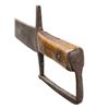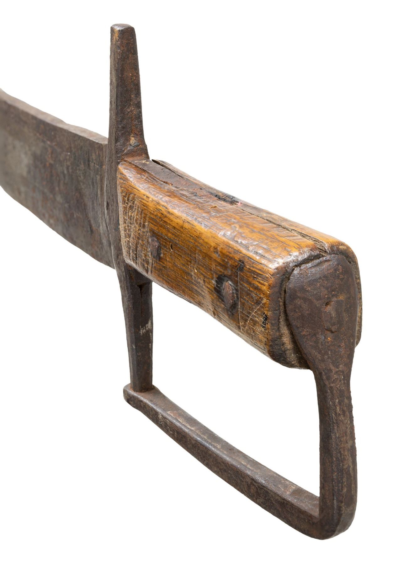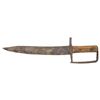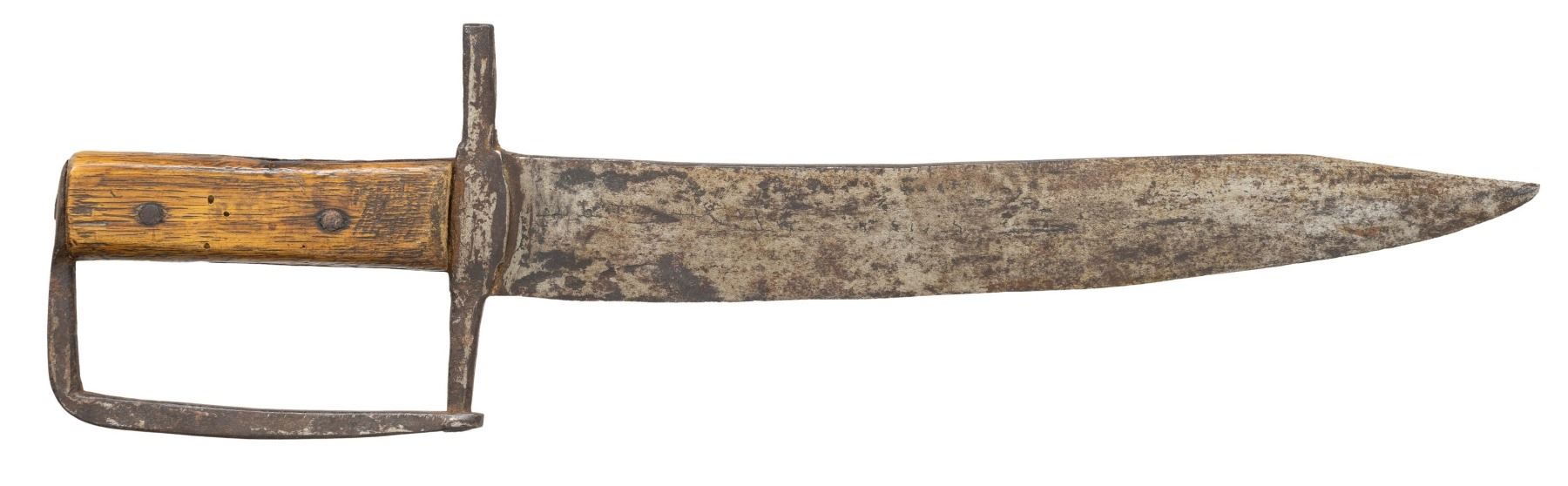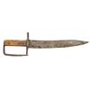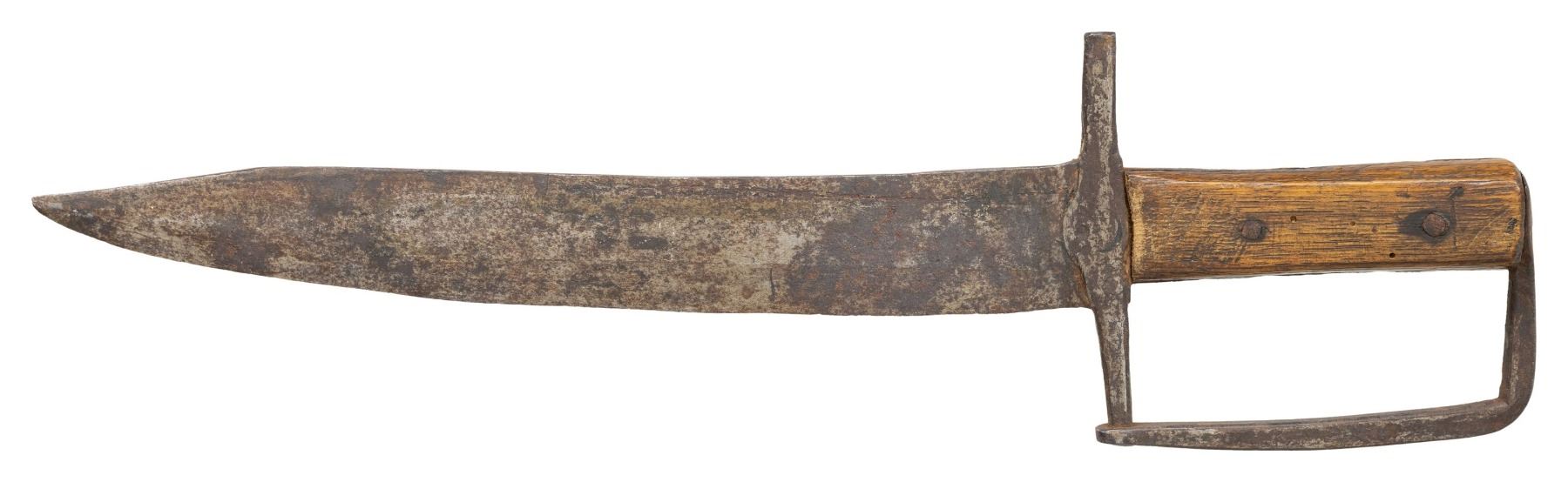 17" overall, meaty 12.5" slightly upswept clip point blade, .25" thick at ricasso, 6" beveled top edge. Unusual form with forge welded cross guard to blade, & full tang. CONDITION: very good overall, "as found"; iron patina, forging flaws in blade, wood slab grip shaved, hand worn patina and few small insect holes. PROVENANCE: ex-Tommy Knox collection. (02-25376/JS). NON-GUN. $2,000-3,000.