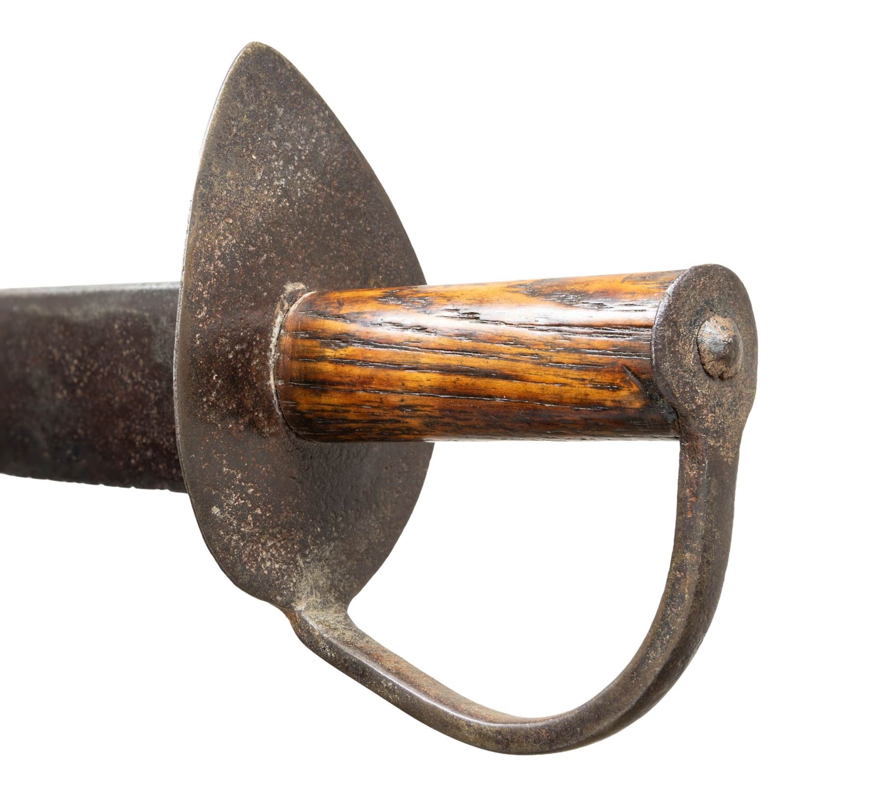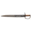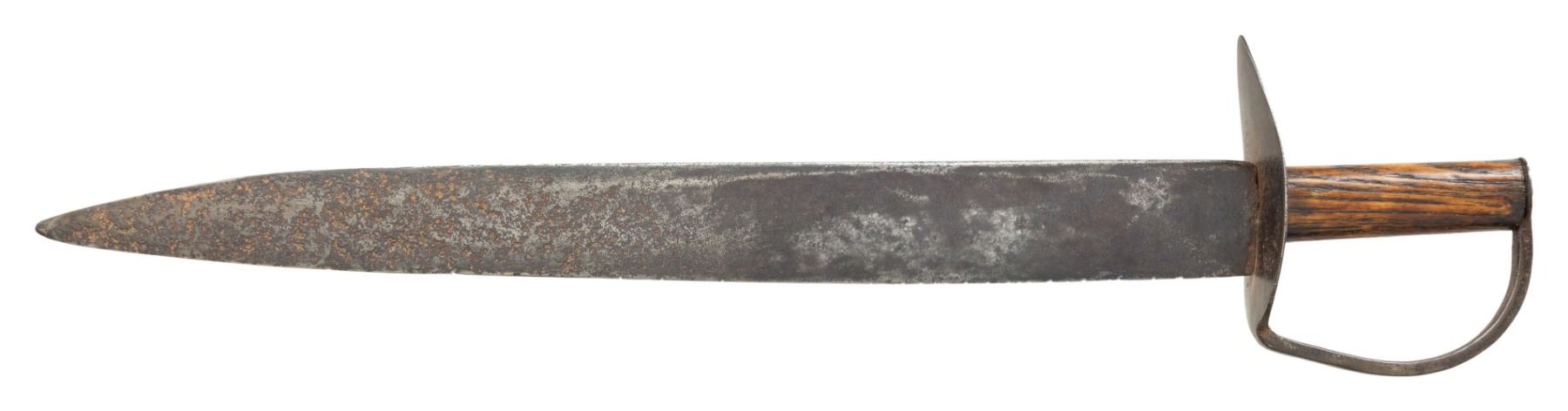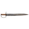 23" overall, 18.5" spear point blade, .25" thick, 2" wide, ovoid pine handle, heavy iron guard, 4.5 x 2.5" lozenge cutlass-style guard similar to knife shown on page 221 of "CONFEDERATE BOWIE KNIVES" thought modeled after early war Mississippi made bowies. CONDITION: very good overall, iron patina, pitting. PROVENANCE: Bob Alispones estate collection. (02-26040/JS). NON-GUN. $1,500-2,000.