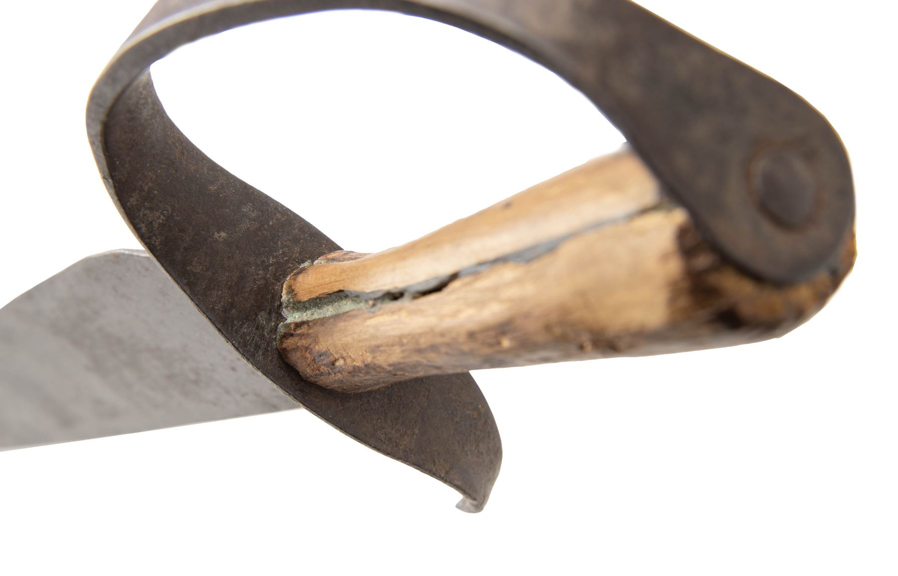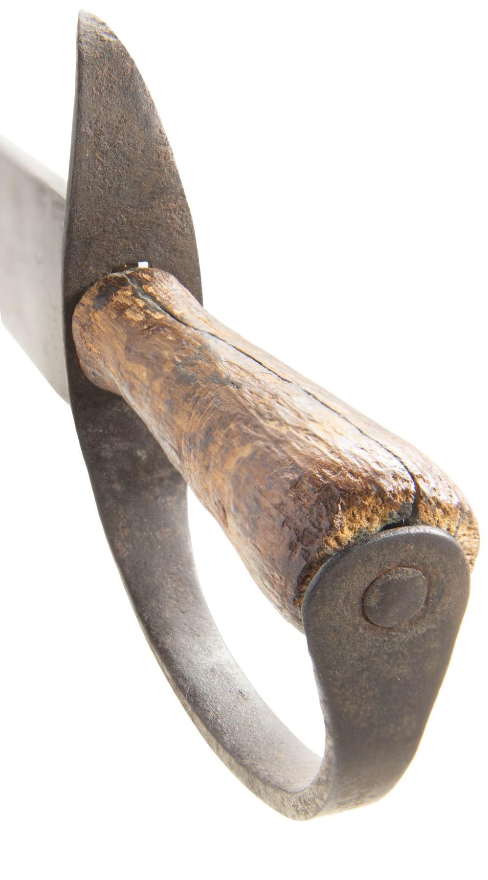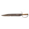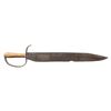 20.5" overall, 16" spear point blade, 5" sharpened false edge, .21" thick, 2" wide, tapered turned wood handle, heavy iron guard with pointed quillon. CONDITION: good overall, "as found", iron patina, pitting, large chip in cutting edge, still very sharp, weathered wood handle with glued repair. PROVENANCE: Bob Alispones estate collection. (02-26037/JS). NON-GUN. $1,500-2,000.