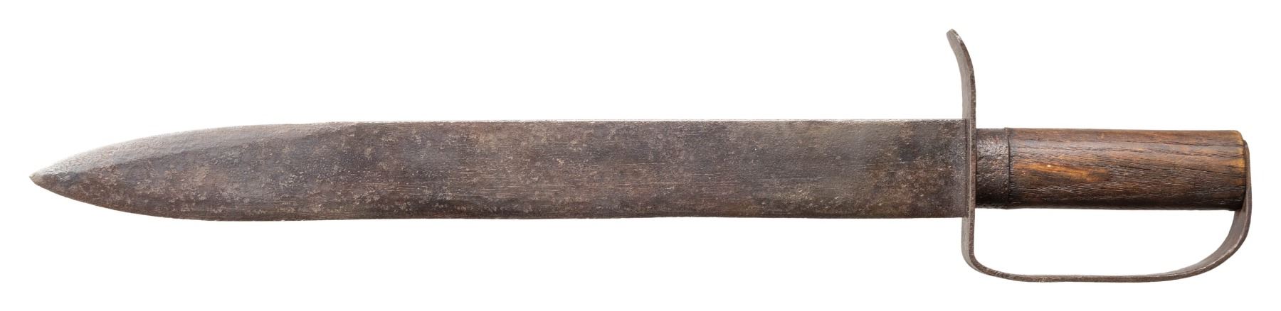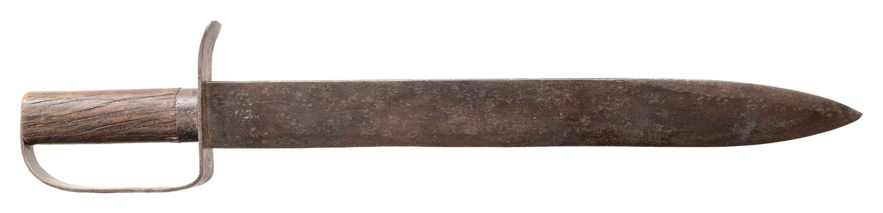 20" overall, 15.5" spear point blade, .16" thick, 1.6" wide, ovoid wood handle with iron ferrule, heavy tapered iron guard. CONDITION: good overall, heavy iron patina. PROVENANCE: Bob Alispones estate collection. (02-26038/JS). NON-GUN. $1,200-1,500.