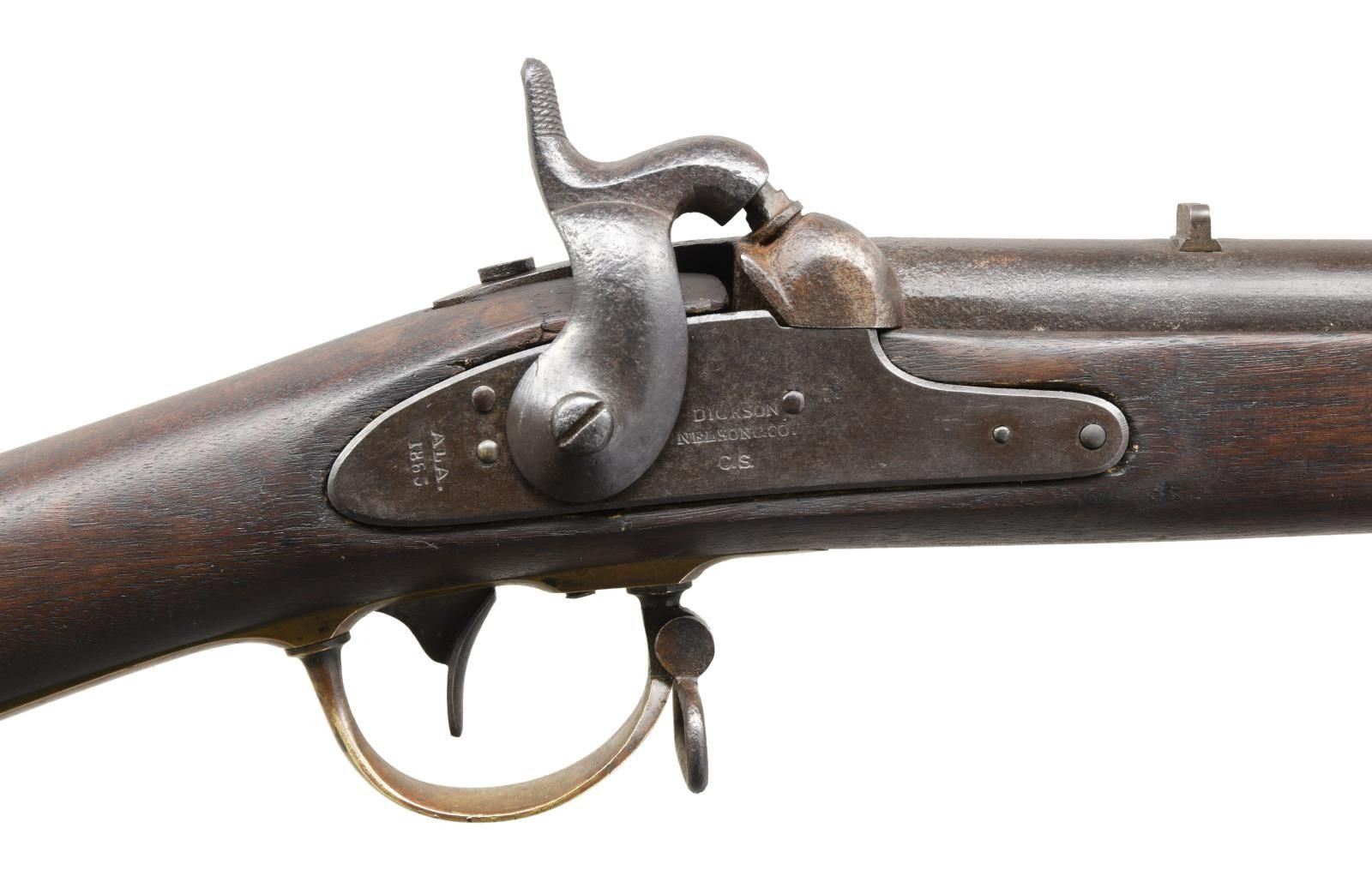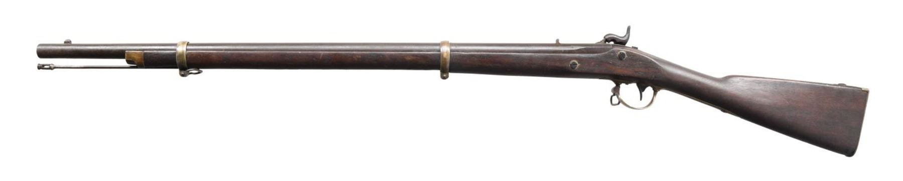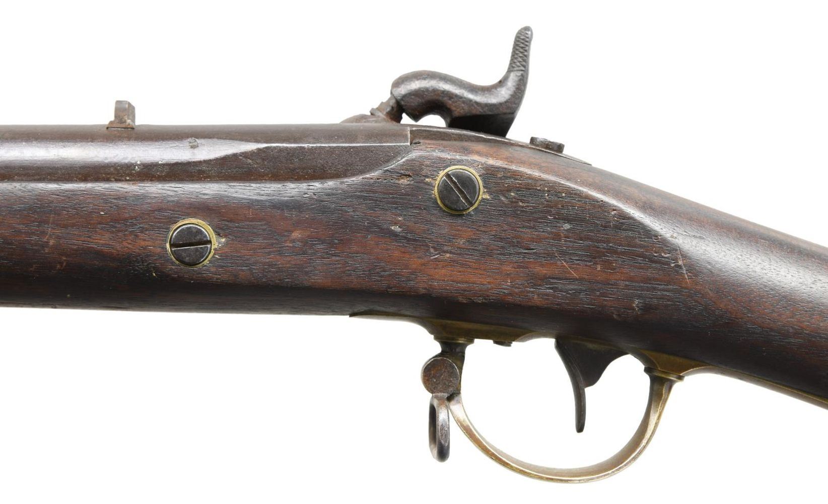 Last ditch rifle made in Dawson, Georgia during last 3 months of war, but saw service & survived in "attic condition", missing front band & rear sight which was professionally restored. This is well above average for other examples and Confederate longarms in general. Excellent lock markings and dated 1865 make it among the last 150-200 guns made. UNATTACHED ACCESSORIES: copy of Doug Jones, excellent ASAC article telling history of this rare maker. Receipt from professional restorer Larry Smith detailing restoration performed. CONDITION: very good overall, restored front band, rear sight, the ramrod is added. The stock is sound and solid with burnout rear of bolster, putty repair on right side of barrel channel between bands. Brass mounts have smooth olive/mustard patina. Lock and barrel have dark iron patina with pitting. Bore is strong and pitted with good discernible rifling. Lock will not hold on full cock, otherwise mechanically functional. (01-22811/JS). ANTIQUE. $12,000-20,000.