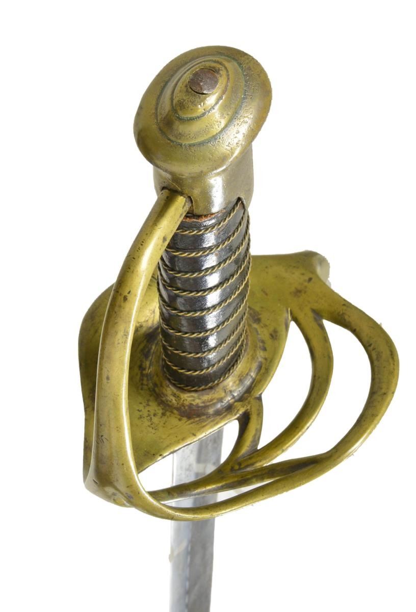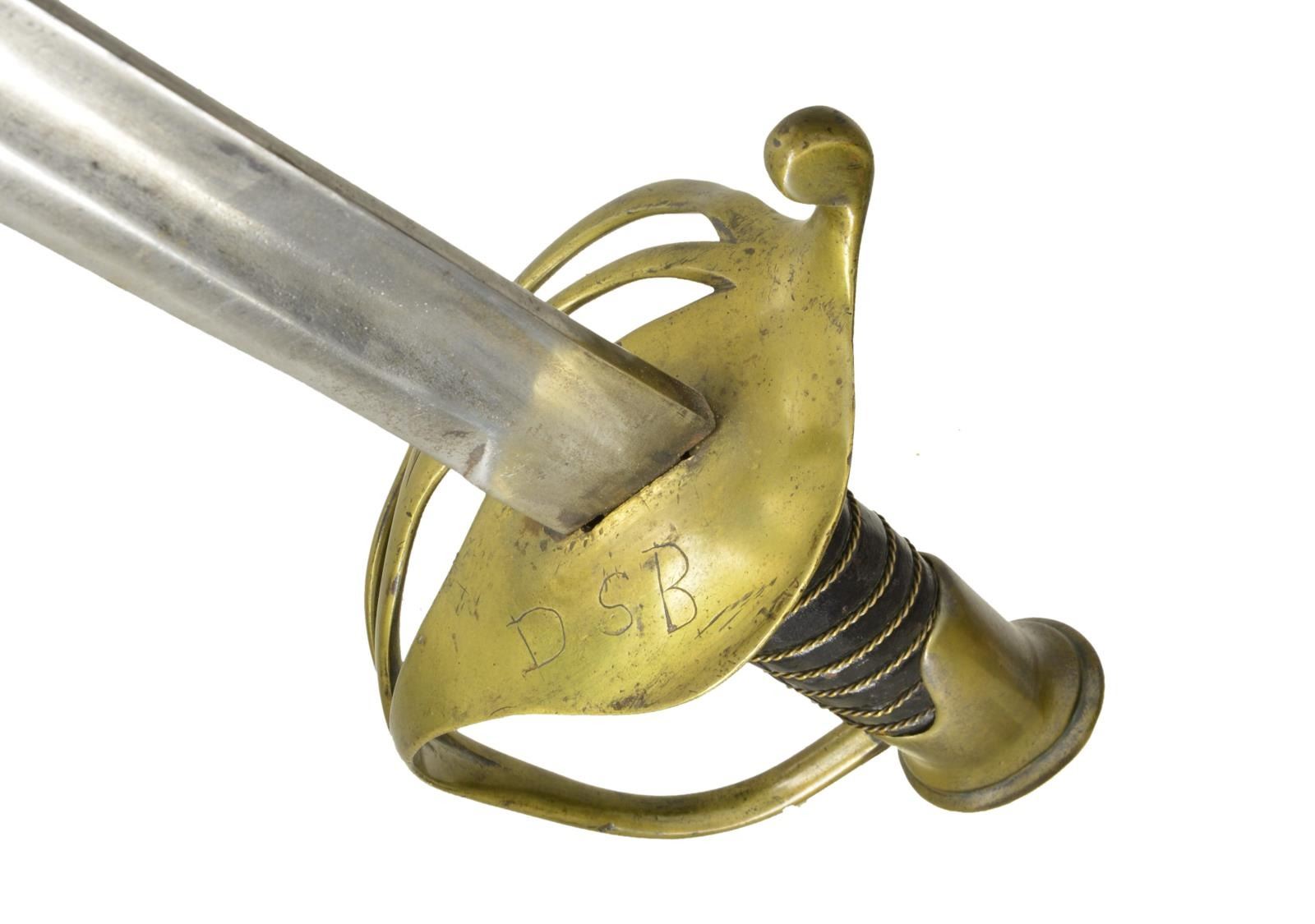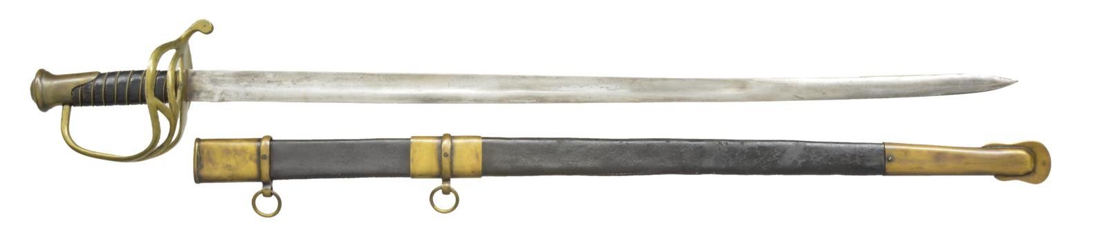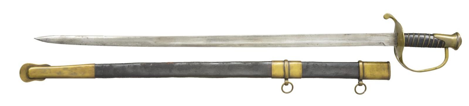 ARSENAL OR POSSIBLY J.C. WILSON OF HOUSTON, TEXAS. Overall length: 37". Blade length: 30 3/4". This sword is likely a product of the College Hill Arsenal but very similar swords were also made by J.C. Wilson of Texas. The College Hill Arsenal was operated by L.T. Cunningham of Nashville, TN. In 1861, Cunningham organized an arsenal on College Hill in Nashville. Little is known about the J.C. Wilson operation in Houston, TX but research is uncovering more information every year. This example has a plain blade w/ a single, lg. unstopped fuller. The hilt is a plain divided 2 branch guard joining into the knuckle bow. The knuckle bow enters the plain, unadorned pommel 1" under the peen. Wire wrapped leather grip has been professionally restored & matches the sword well. Brass mounted leather scabbard is a quality reproduction signed "JTL" on the drag. CONDITION: blade has a light gray overall patina. Hilt has a deep, mellow mustard patina. Grip is 100%. Scabbard remains solid. (02-17529/BF). $3,000-4,500.