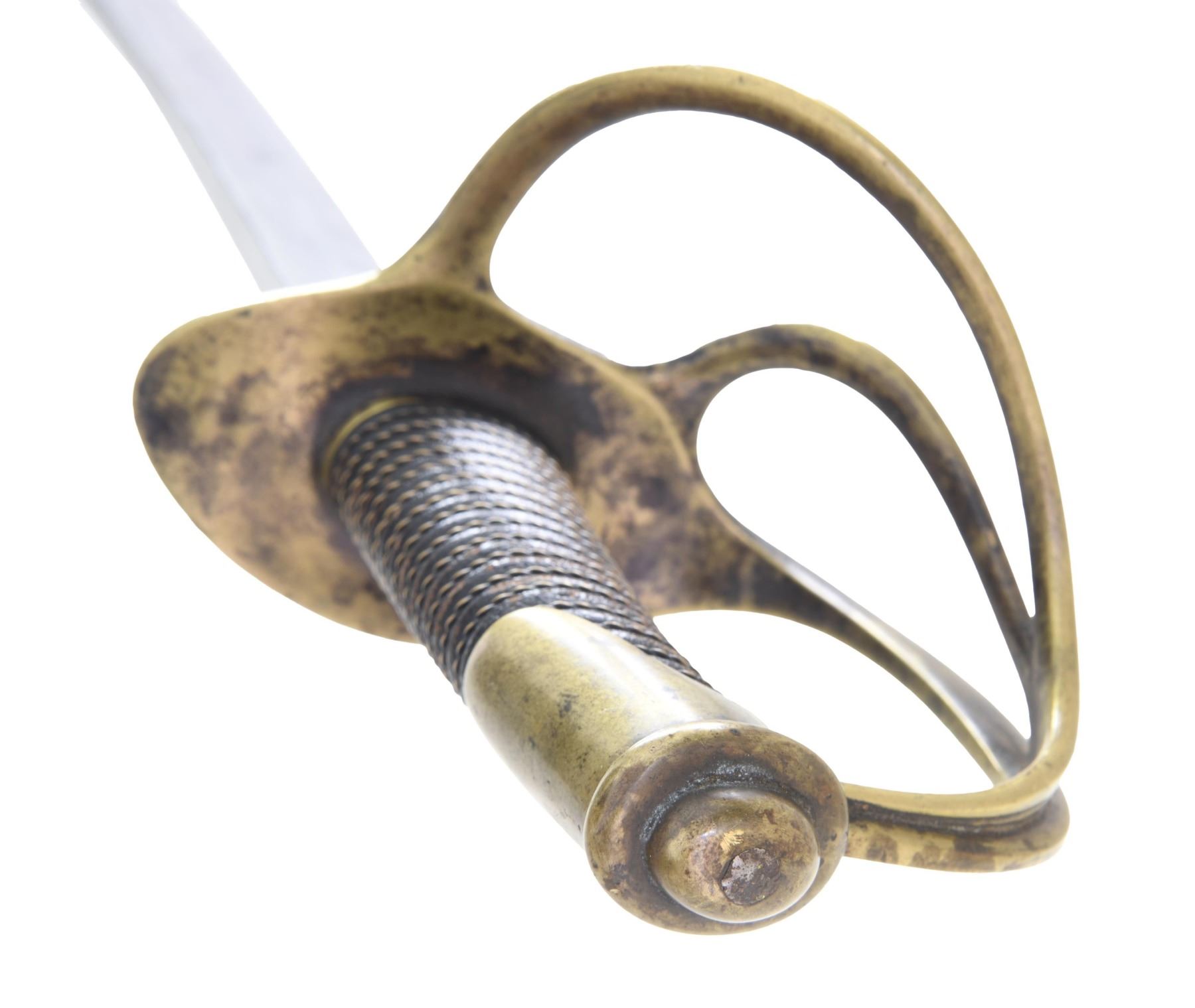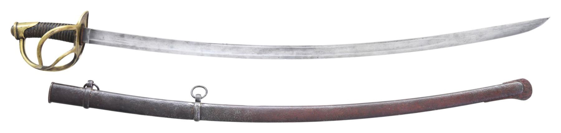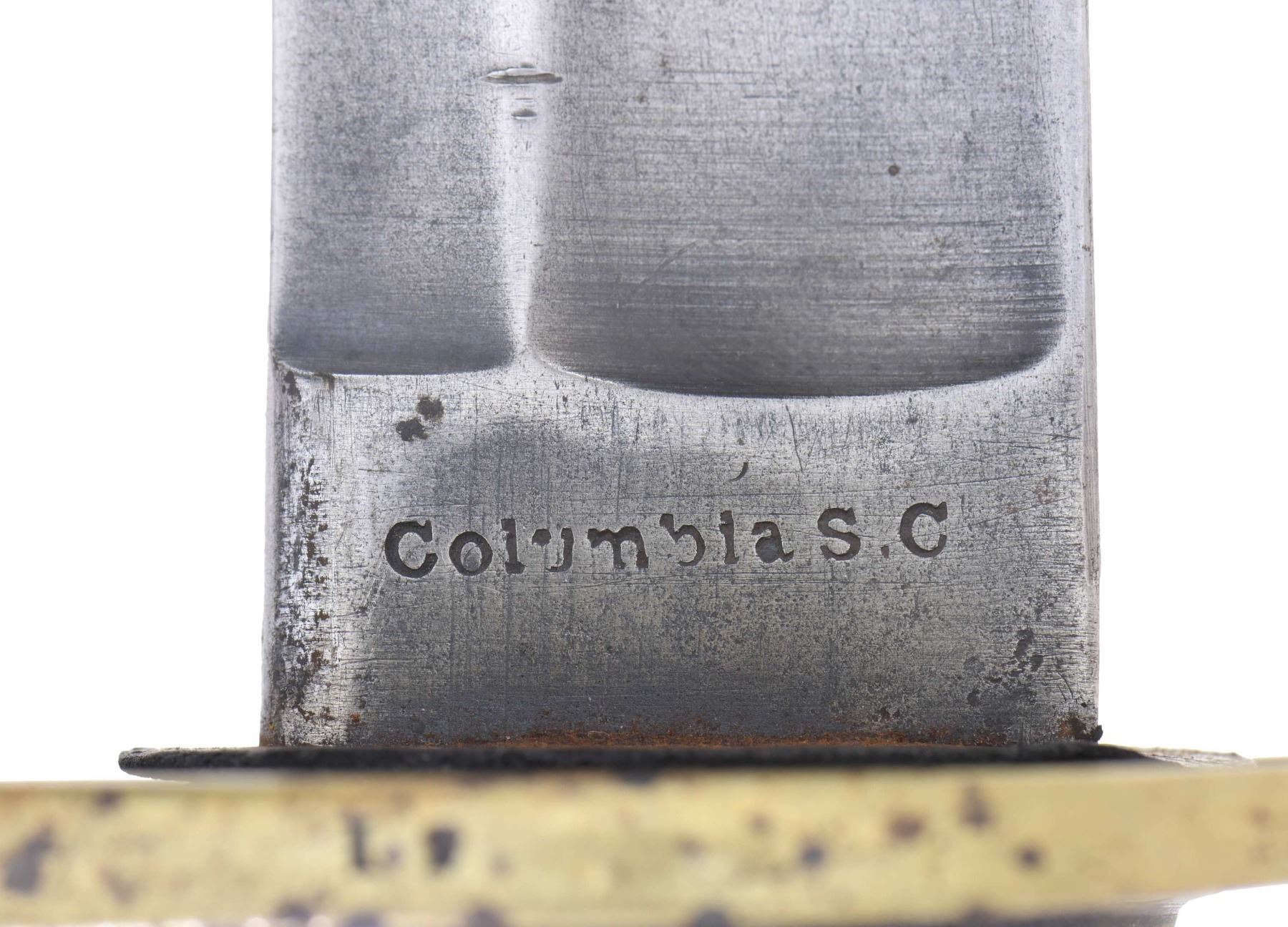 36" blade with characteristic short ricasso with the correct original stamp "Columbia S.C". William Glaze had contract with the state of South Carolina for cavalry sabers in the early 1850s and this is one of the swords he supplied. This is an early stamped example with among the most complete marks you will find. The die broke down and a vast majority are missing portions of almost every letter in die. The sword is correct S&K type 1 model 1840 heavy cavalry saber observed on every original survivor. Most of the sabers saw service in the South Carolina cavalry during the war. Many examples have initials or names scratched on top of guard in at least one unit. This has nicely cross-hatched "JW" on edge of guard. CONDITION: good overall, blade is better than average, cleaned gray surface, grip is professionally rewrapped. Hilt cleaned and stained toned patina. The correct one pin throat scabbard is dark and pitted, fits well. PROVENANCE: purchased from Brian Akins. (02-24324/JS). NON-GUN. $2,000-3,000.