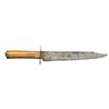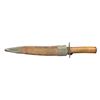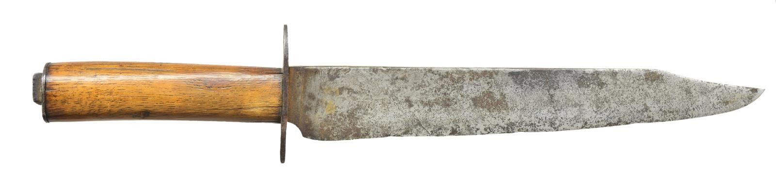16” overall, 11” clip point blade, .35” thick meaty fighting knife. wood grip, oval pommel cap with hand forged nut like seeing on some Mississippi maker marked knives. Sheath has tin throat and tip, attached leather loop. CONDITION: good very good overall, blade has seen some use with sharpening, stained and pitted, sheath shrunk with half inch gap between throat and 3” iron crossguard. PROVENANCE: Pictured on page 189 “Accoutrements IV” by Jim Johnston. (02-18173/JS). $2,000-3,000.