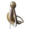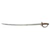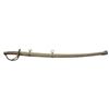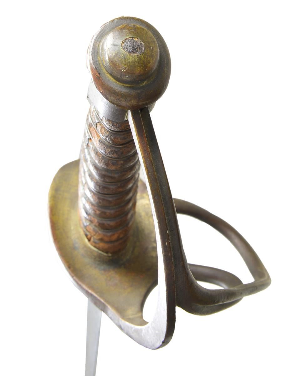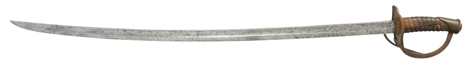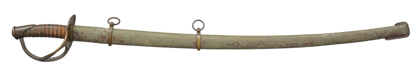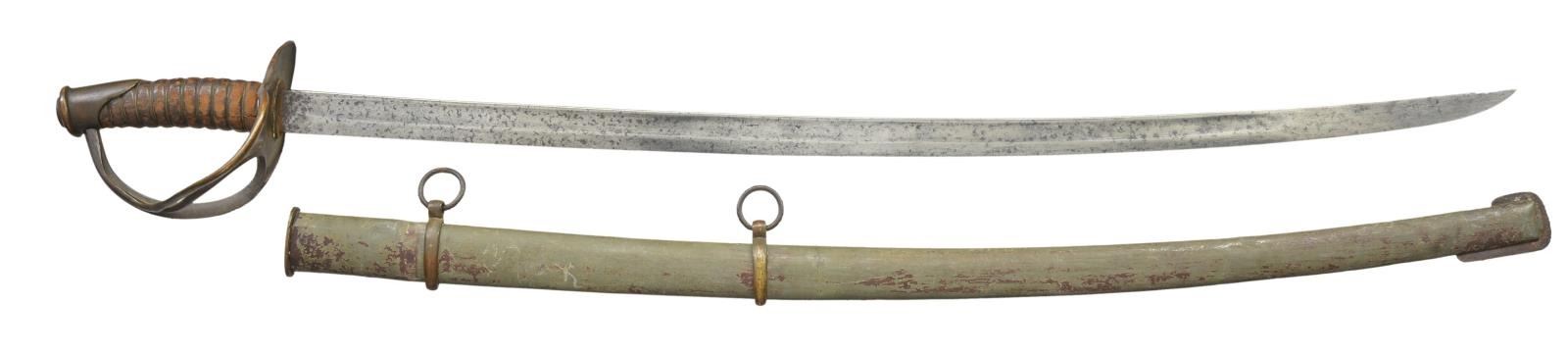 CAVALRY SABER. Variant 1840 style cavalry saber with rounded guard and stepped disc pommel cap, 34” rounded top edge blade. Louis Froelich’s “Confederate States Armory” in Kenansville, North Carolina hilts varied but scabbard construction always were unique solder filled lap seamed, pinned brass throat, friction fit brass sword rings, squared tip, iron drag, dark red lacquered. This exact word is pictured on page 139 (plates 184 & 184A) of “American Swords & Makers’ Marks” 1999 by C. D. Furr. CONDITION: very good overall, blade is gray/bright, scattered staining and light pitting. Scabbard is equally very good though most red lacquer has chipped off showing tinned sheet iron surface. Matching brass patinas to scabbard mounts, hilt & pommel. Ring mounts loose. Grip retains most all of its original scuffed leather and brass wire wrap. (02-19136/JS). $3,000-4,000.
