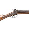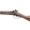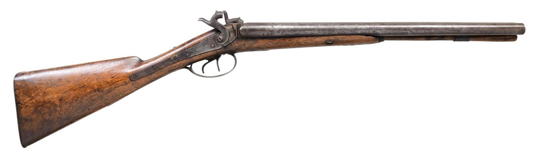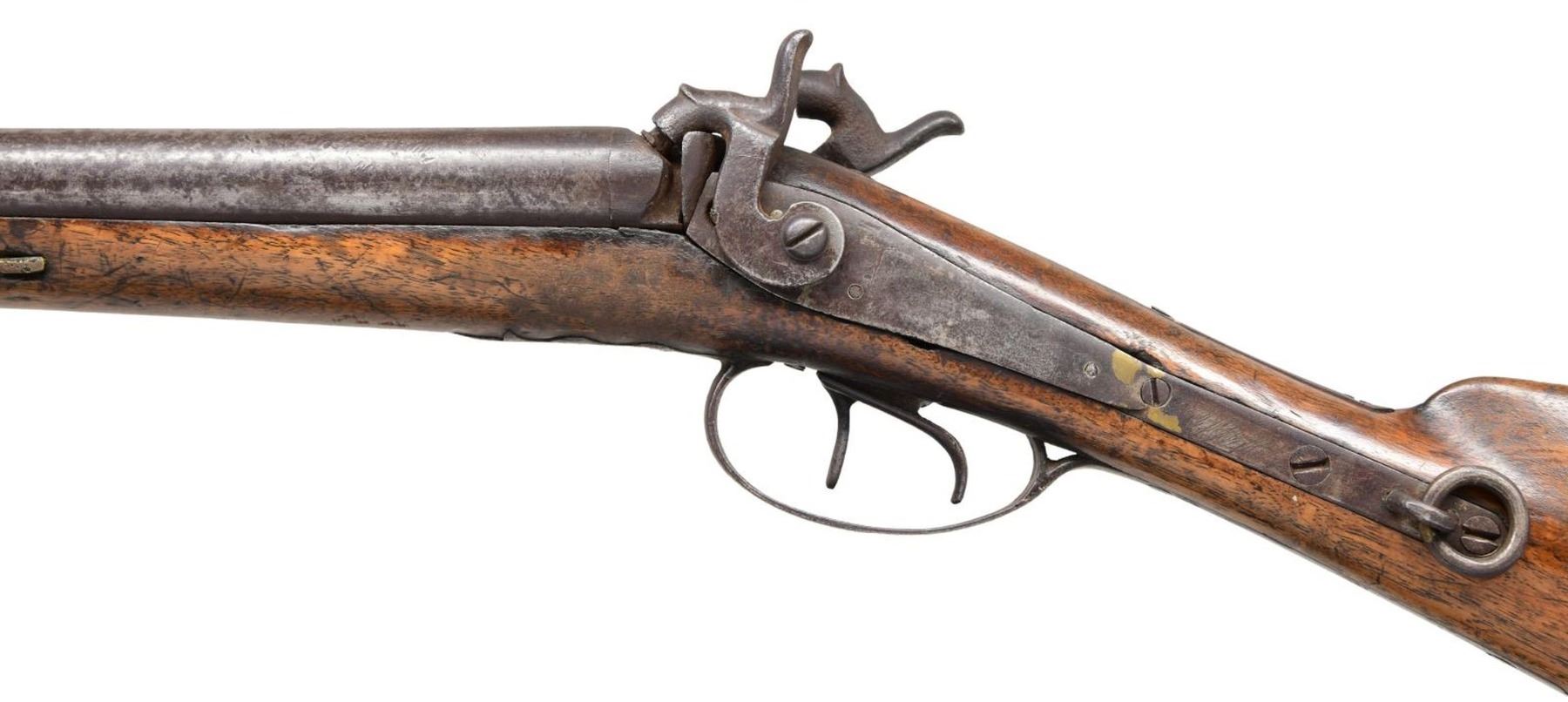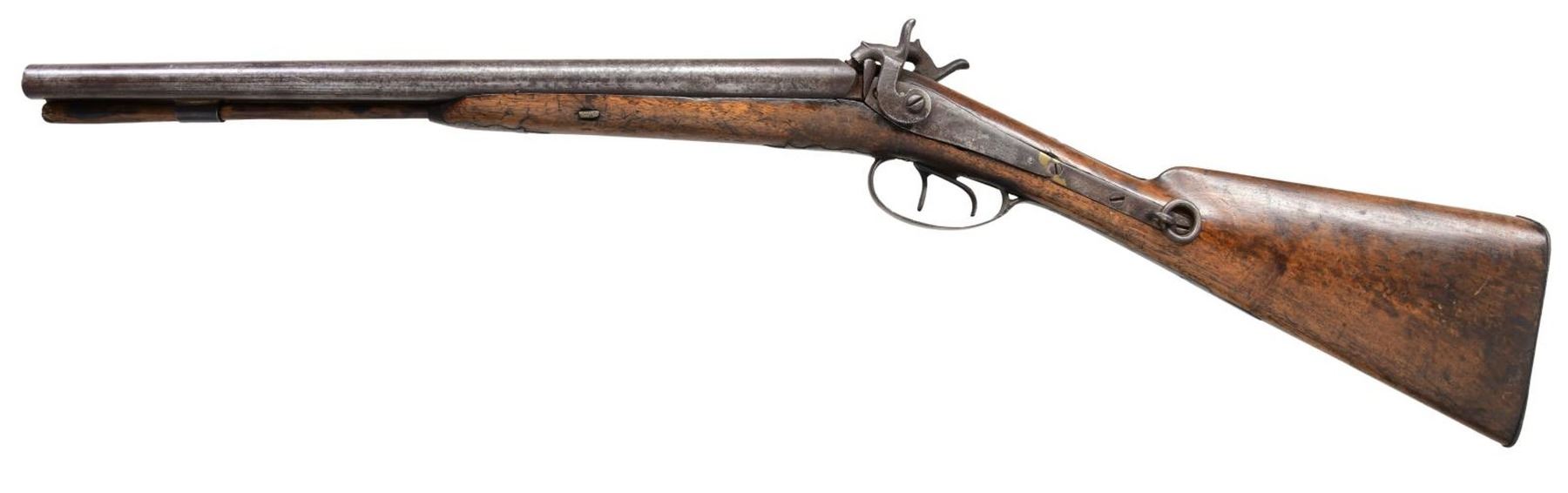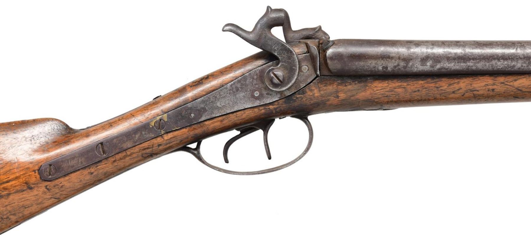 Cal. 12 Ga. NSN. Barrels were shortened to 18 7/8" with the ramrod held by two pipes. Back action hammer locks with solder attached long tangs, saddle ring, and stud. Double triggers. Half-length wedge-fastened walnut stock with a replacement brass wedge and iron buttplate. CONDITION: barrels and locks show dark patina with dents, marks, and pitting. Stock shows a blistered finish with handling marks and wear. Front pipe appears to be glued onto the under-rib. Dark, pitted bores. (01-25356/MD). ANTIQUE. $800-1,200.
