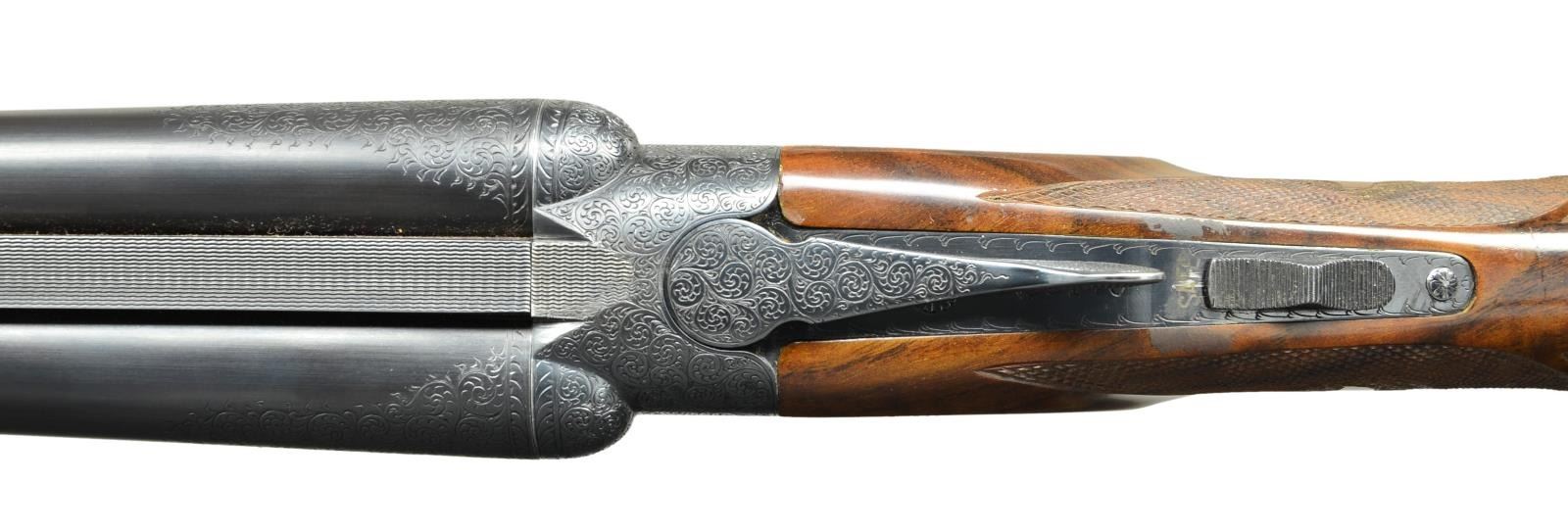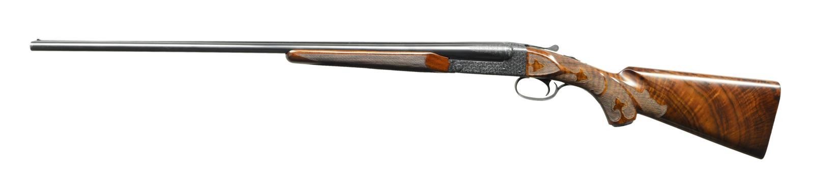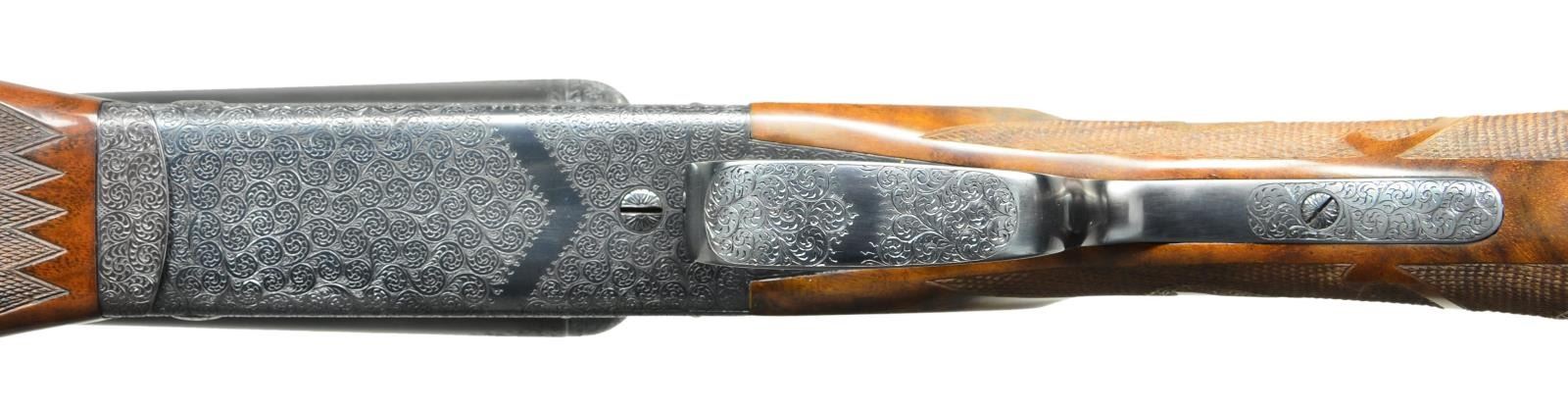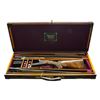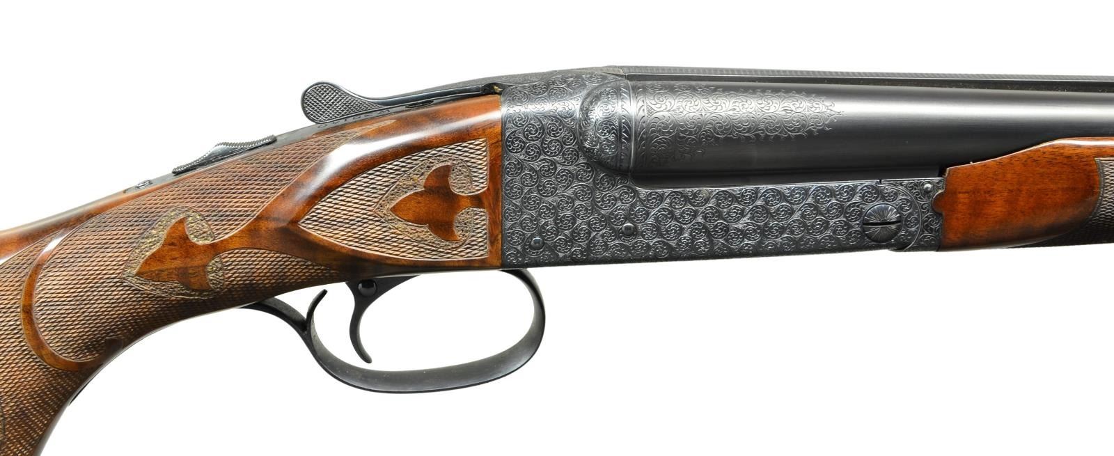 CUSTOM GRADE 3 GA SET SHOTGUN. Cal. 20 Ga, 28 Ga & 410. S# W38140. Flat sided custom grade boxlock action w/ full coverage arabesque scroll engraving. Water tables are jeweled. Single selective trigger. Selective ejectors. Steel capped pistol grip stock of fancy burl grained black walnut. Each bbl. set is equipped w/ its own beavertail forearm. The 410 & 28 Ga bbls. have gloss finished forearms w/ custom grade wraparound point pattern hand checkering & black forearm tip inserts. The 20 Ga forearm is satin finished to match the stock w/ black tip. This forearm & the stock have style B carving. LOP: 14-1/4’’ to a checkered butt. DAC: 1-3/8’’. DAH: 2-1/8’’. Near neutral cast. All bbl. sets are 26’’ w/ solid ribs & white front beads. All have fixed Imp Cyl & Mod chokes. WEIGHT with 20 Ga bbl: 6 lbs, 15 ozs. UNATTACHED ACCESSORIES: CSMC oak & leather case w/ purple felt fitted interior having makers label on inside lid. Case contains 2 piece rosewood cleaning rod along with cleaning accessories & patches. Gun was returned to CSMC to have pistol grip stock & matching 20 Ga B carved forearm fitted. Included is original straight grip stock, beavertail forearm & trigger guard. Full length stock is in very good condition w/ checkered butt. Gold nameplate in toeline has initials “HEK”. CONDITION: near excellent retaining over 98% wood & metal finish. Stock shows small marks. All bores are bright & near excellent. (23-723/DS). MODERN. $15,000-25,000.
