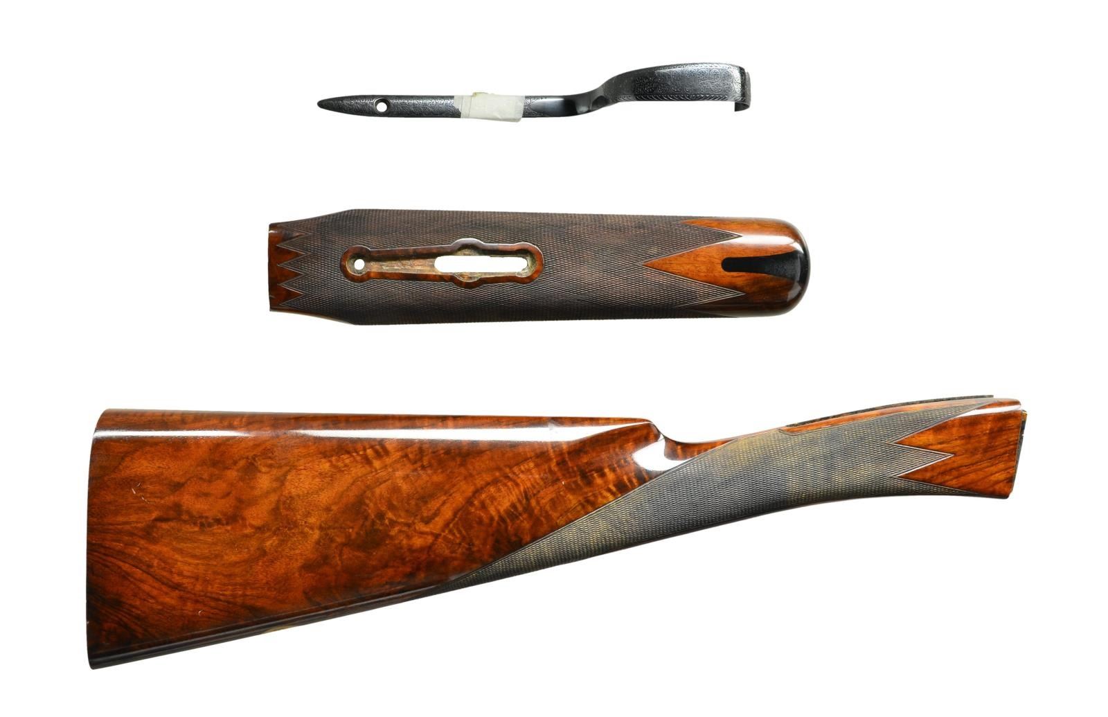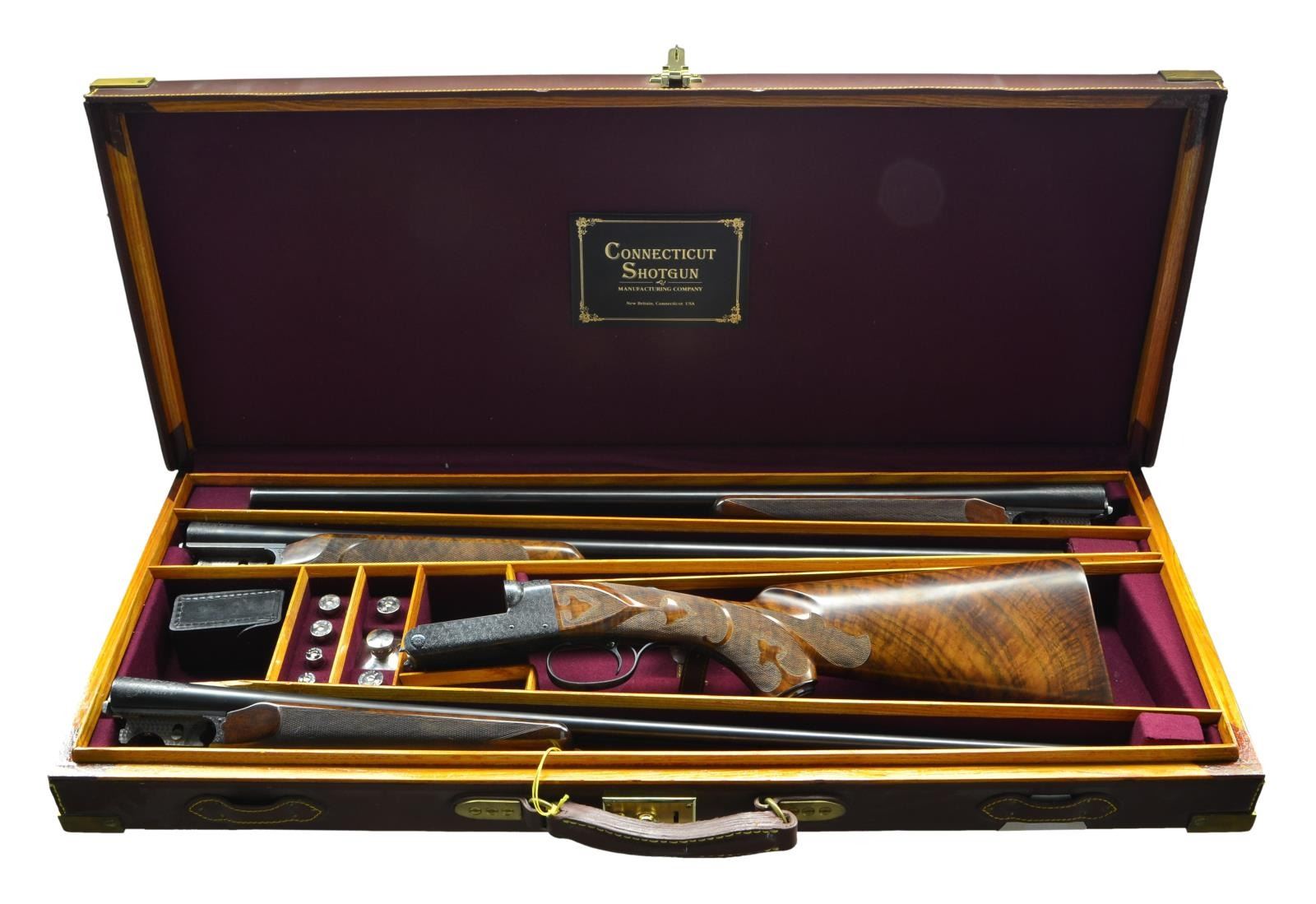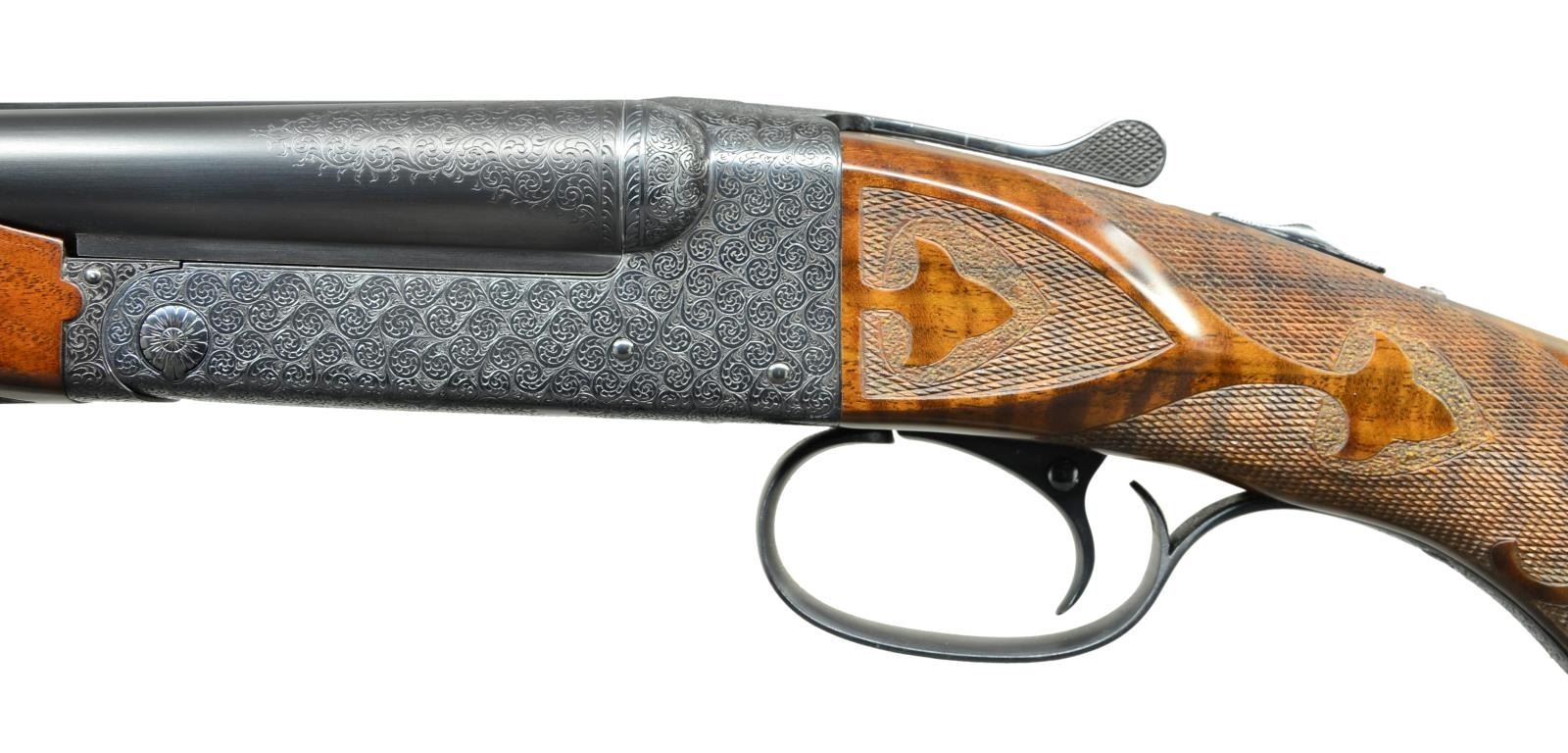 CUSTOM GRADE 3 GA SET SHOTGUN. Cal. 20 Ga, 28 Ga & 410. S# W38140. Flat sided custom grade boxlock action w/ full coverage arabesque scroll engraving. Water tables are jeweled. Single selective trigger. Selective ejectors. Steel capped pistol grip stock of fancy burl grained black walnut. Each bbl. set is equipped w/ its own beavertail forearm. The 410 & 28 Ga bbls. have gloss finished forearms w/ custom grade wraparound point pattern hand checkering & black forearm tip inserts. The 20 Ga forearm is satin finished to match the stock w/ black tip. This forearm & the stock have style B carving. LOP: 14-1/4’’ to a checkered butt. DAC: 1-3/8’’. DAH: 2-1/8’’. Near neutral cast. All bbl. sets are 26’’ w/ solid ribs & white front beads. All have fixed Imp Cyl & Mod chokes. WEIGHT with 20 Ga bbl: 6 lbs, 15 ozs. UNATTACHED ACCESSORIES: CSMC oak & leather case w/ purple felt fitted interior having makers label on inside lid. Case contains 2 piece rosewood cleaning rod along with cleaning accessories & patches. Gun was returned to CSMC to have pistol grip stock & matching 20 Ga B carved forearm fitted. Included is original straight grip stock, beavertail forearm & trigger guard. Full length stock is in very good condition w/ checkered butt. Gold nameplate in toeline has initials “HEK”. CONDITION: near excellent retaining over 98% wood & metal finish. Stock shows small marks. All bores are bright & near excellent. (23-723/DS). MODERN. $15,000-25,000.