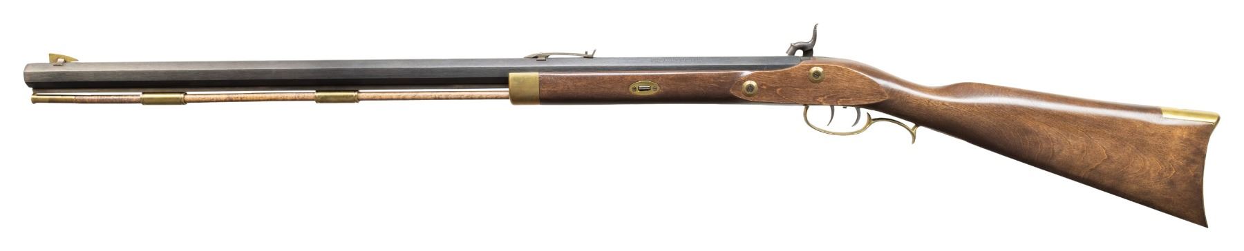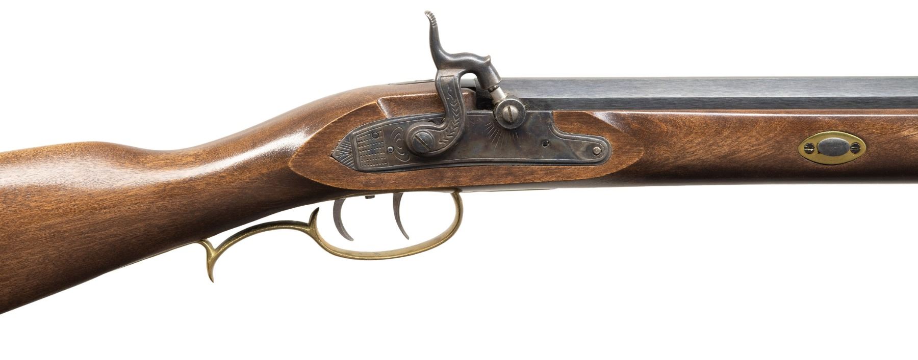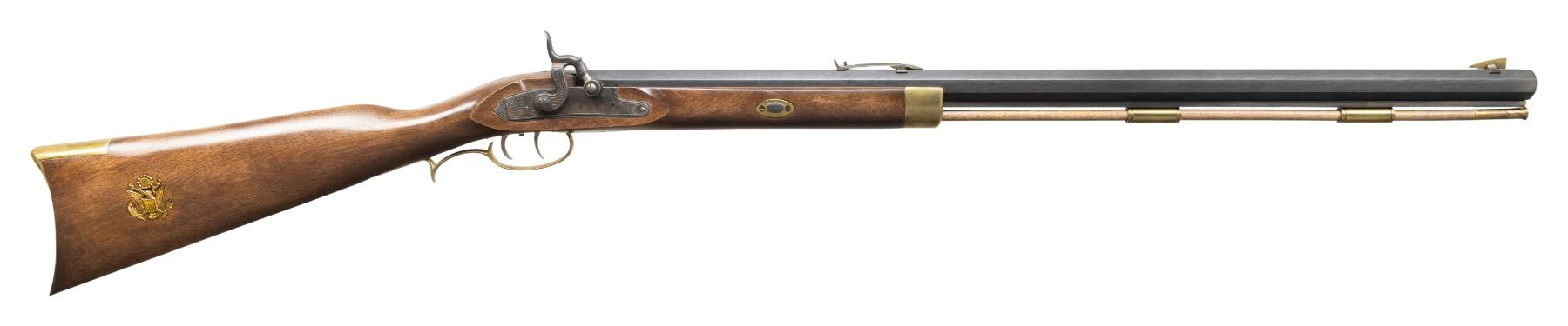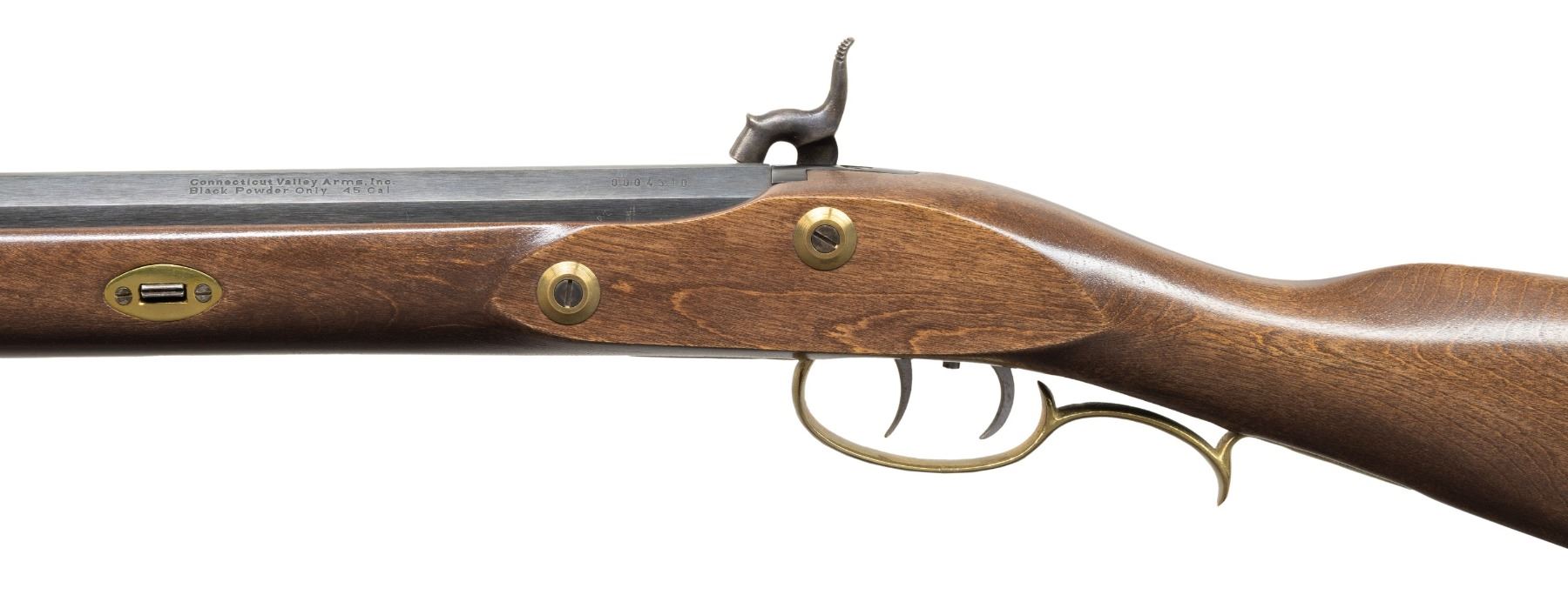 RIFLE. Cal. 45 Rifled. S# 0004510. Bbl. 28". Half-stock percussion rifle mfg. by Connecticut Valley Arms. Left quarter flat of the bbl. is marked "Connecticut Valley Arms, Inc./ Black Powder Only .45 Cal.", followed by the S# towards the breech. Lockplate, and hammer exhibit a case colored finish, with light decorative engraving. Steel bbl. and percussion drum exhibit a blue finish. 1-piece single wedge fastened plain wood straight grip stock features a brass buttplate, an inlaid brass Great Seal of the United States (right side of buttstock), brass trigger guard, oval brass wedge escutcheon, brass nosecap, as well as 2 brass pipes. Reverse mounted dovetailed brass blade front sight with dovetailed steel square notch rear sight. Action features double set triggers. Complete with a brass tipped hardwood ramrod. CONDITION: metal components retain the vast majority of their original factory finishes, showing some spots of light edge wear, as well as some superficial handling marks. Bright bore, retaining well defined rifling throughout. Proper manual mechanics, to include the double set trigger. Wood stock is very good to excellent overall. (01-28216/MLW). ANTIQUE. $300-450.