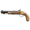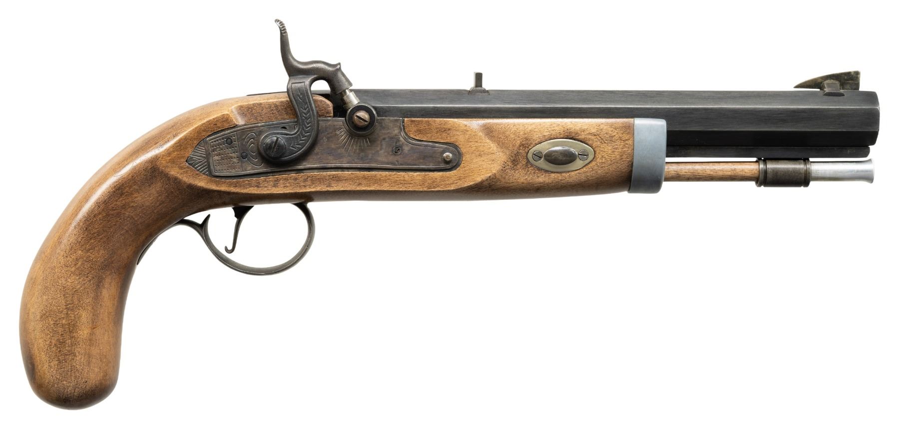 Cal. 45 Rifled. S# 0016733. Bbl. 9". Percussion belt pistol mfg. by Connecticut Valley Arms. Left quarter flat of the octagonal bbl. is marked with CVA's mfg. information, as well as with the cal. designation and S#. Lockplate and hammer exhibit light decorative engraving. Lockplate exhibits a case colored finish, with remaining metal components exhibiting a blue finish overall. 1-piece single wedge fastened plain wood stock features a steel trigger guard and belt hanger, strawed steel wedge and escutcheon, a pewter nose cap, as well as a single ramrod pipe. Reverse mounted dovetailed brass blade front sight with dovetailed U-notch rear sight. Complete with aluminum tipped hardwood ramrod. CONDITION: metal components retain the majority of their original factory finishes, exhibiting some spots of light wear and thinning, with the lockplate exhibiting some light wear around the percussion nipple drum. Bright bore, retaining well defined rifling throughout. Proper manual mechanics. Stock is very good overall. (01-28211/MLW). ANTIQUE. $200-300.