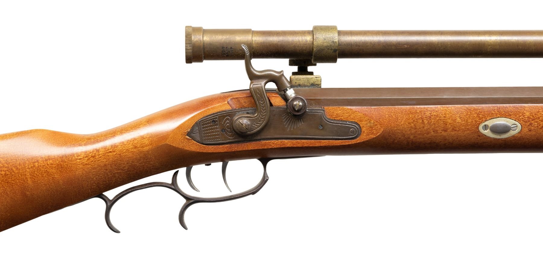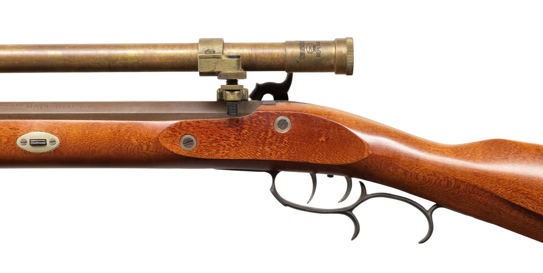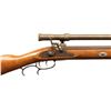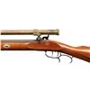 WITH TASCO 1860 SCOPE. Cal. 45 Rifled. S# 0032834. Bbl. 31 7/8". Percussion plains rifle mfg. by Connecticut Valley Arms. Left quarter flat of the octagonal bbl. is marked ".45 Cal.", followed by "Connecticut Valley Arms, Inc./ Black Powder Only", and "MADE IN U.S.A.". Steel lockplate, hammer, trigger guard, ramrod pipes, and buttplate exhibit a browned finish. 1-piece plain wood straight grip stock features a German silver patchbox and a pewter nose cap. Dovetailed German silver blade front sight with dovetailed steel square notch rear sight. Bbl. is drilled and tapped, featuring a 32 1/4" brass Tasco 1860 Replica 4x15 scope, complete with threaded brass lens covers. Rifle is complete with its aluminum tipped hardwood ramrod. CONDITION: metal components retain virtually all of their original factory browned finish, exhibiting some very light edge wear on the bbl. Bright bore, retaining well defined rifling throughout. Proper manual mechanics, to include the double set trigger. Stock shows a few minor superficial marks from handling and storage, but otherwise remains very good overall. Scope retains a clear optic, with the crosshair having been slightly bent. (01-28215/MLW). ANTIQUE. $300-500.