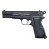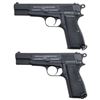 FMAP "DM" HIGH POWER SEMI-AUTOMATIC PISTOLS. 1) ARGENTINE FMAP "DM" HIGH POWER SEMI-AUTOMATIC PISTOL. Cal. 9mm Luger. S# 07-59718. Bbl. 4 5/8" High Power semi-automatic pistol mfg. in Argentina by FMAP "DM" (Military Portable Weapons Factory "Domingo Matheu") under license from FN for the cancelled Chilean contract. Left side of the slide is marked with FMAP "DM"'s mfg. information above "D.G.F.M.", "LICENCIA FN-BROWNING", and "INDUSTRIA ARGENTINA". Right side of the frame is marked with the S#, followed by "5881" above a defaced Chilean "CARABINEROS DE CHILE" marking. Metal components exhibit a matte black finish (that was applied above a phosphate finish) overall, save for on the bbl., which exhibits a phosphate finish. Frame is mounted with 2-piece checkered black synthetic grips. Fixed half-moon blade front sight, with dovetailed U-notch rear sight. Left side of the frame is mounted with a lanyard ring. All serialized parts are matching and include the frame, slide, and bbl. MAGS: 1 unmarked 13-rd. mag., with phosphate finish body and black enamel finished button floorplate. CONDITION: very good to excellent, with metal components retaining bountiful amounts of their arsenal matte black finish, exhibiting some light superficial handling marks overall. Near mirror bore, exhibiting some light pitting, while retaining well defined rifling throughout. Grips show some superficial marks from handling and storage, but otherwise remain sturdy and serviceable. (25-250/MLW). 2) ARGENTINE FMAP "DM" HIGH POWER SEMI-AUTOMATIC PISTOL. Cal. 9mm Luger. S# 07-59719. Bbl. 4 5/8". High Power semi-automatic pistol mfg. in Argentina by FMAP "DM" (Military Portable Weapons Factory "Domingo Matheu") under license from FN for the cancelled Chilean contract. Left side of the slide is marked with FMAP "DM"'s mfg. information above "D.G.F.M.", "LICENCIA FN-BROWNING", and "INDUSTRIA ARGENTINA". Right side of the frame is marked with the S#, followed by "5882" above a defaced Chilean "CARABINEROS DE CHILE" marking. Metal components exhibit a matte black finish (that was applied over a phosphate finish) overall, save for on the bbl., which exhibits a phosphate finish. Frame is mounted with 2-piece checkered black synthetic grips. Fixed half-moon blade front sight, with dovetailed U-notch rear sight. Left side of the frame is mounted with a lanyard ring. All serialized parts are matching and include the frame, slide, and bbl. MAGS: 1 13-rd. mag., with a phosphate finished body and black enamel finished floorplate. CONDITION: very good to excellent, with metal components retaining bountiful amounts of their arsenal matte black finish, exhibiting some superficial handling marks overall. Very bright bore, exhibiting light pitting and some scattered spots of mild pitting, while retaining well defined rifling throughout. Grips show some superficial marks from handling and storage, but otherwise remain sturdy and serviceable. PROVENANCE: the Estate Collection of Charles Wagner. (25-251/MLW). BOTH MODERN. $1,200-1,800.