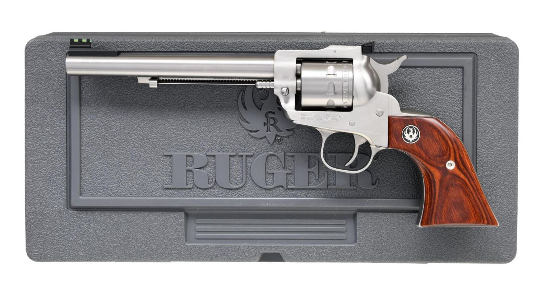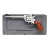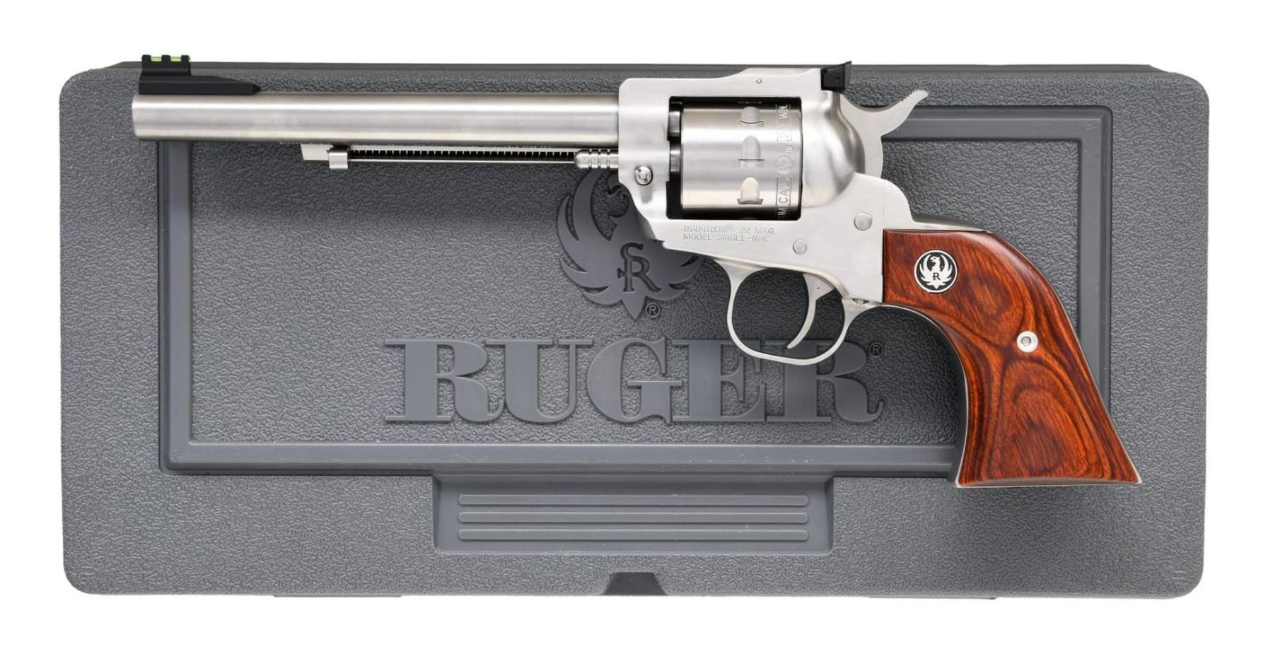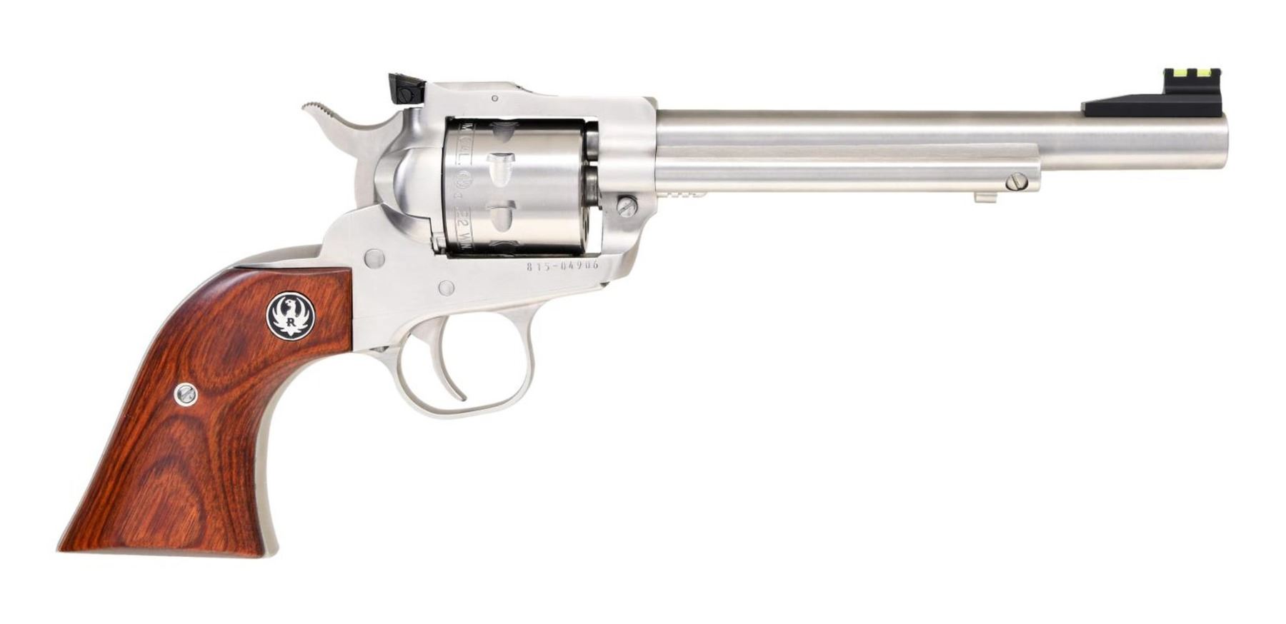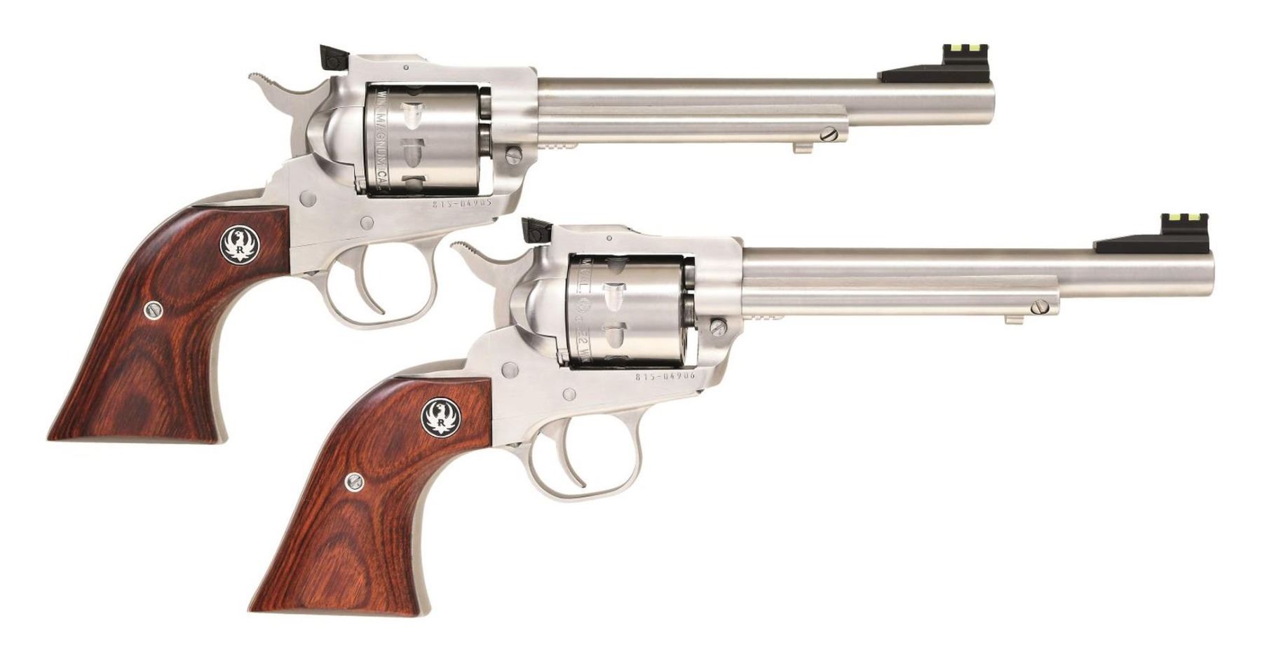 REVOLVERS. Both Cal. 22 Mag. S#'s 815-04905 & 815-04906. Both bbls. 6 1/2". Ramped fiber optic front sights. Adjustable rear sights. Stainless finishes. Rosewood-laminate grips with silver Ruger medallions. UNATTACHED ACCESSORIES: both guns have matching-numbered factory hardcases with manuals, trigger locks, and fired cases. CONDITION: all aspects of both guns are near new; in the box. (23-6906, 23-6907/MJC). BOTH MODERN. $800-1,200 for pair.