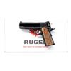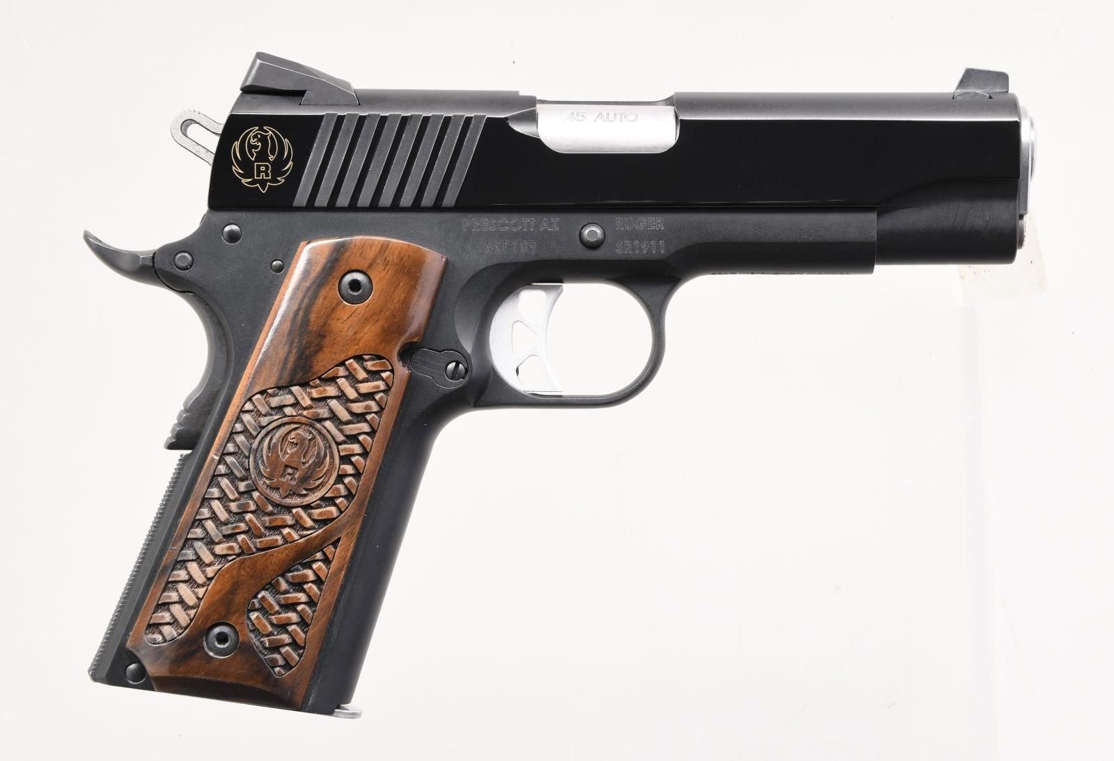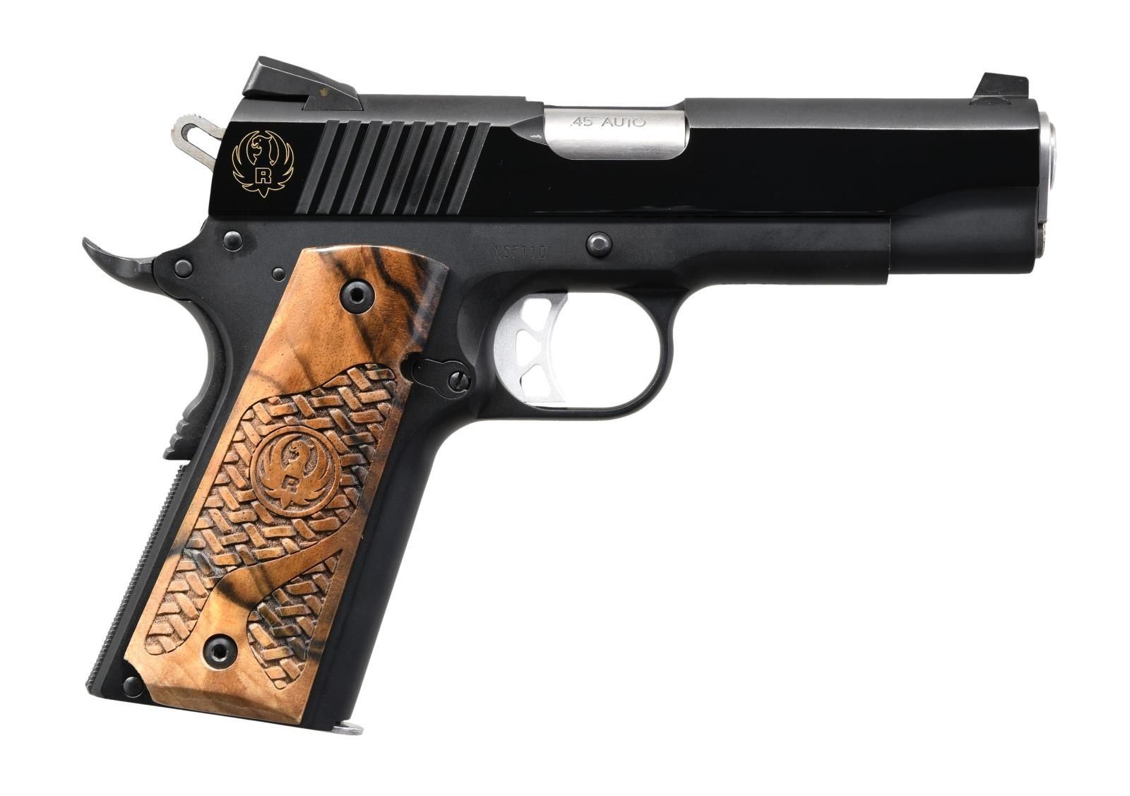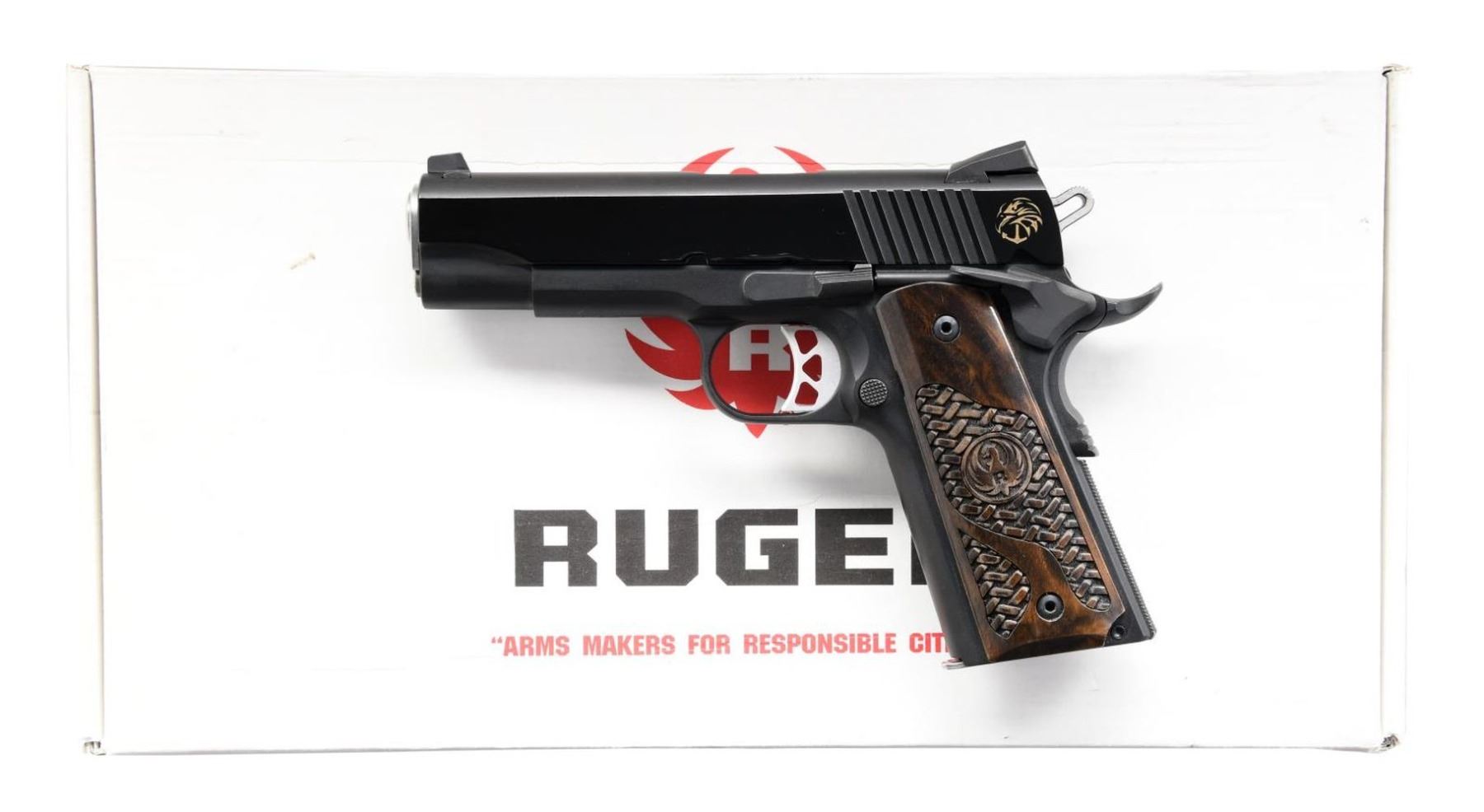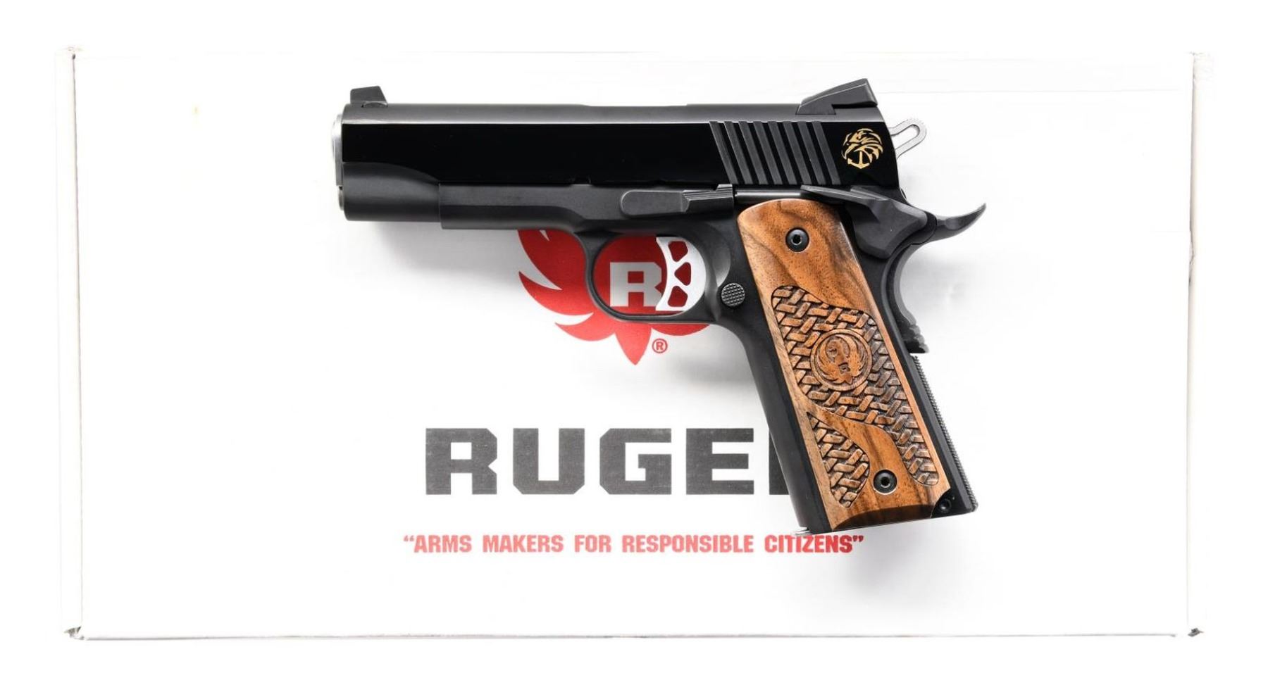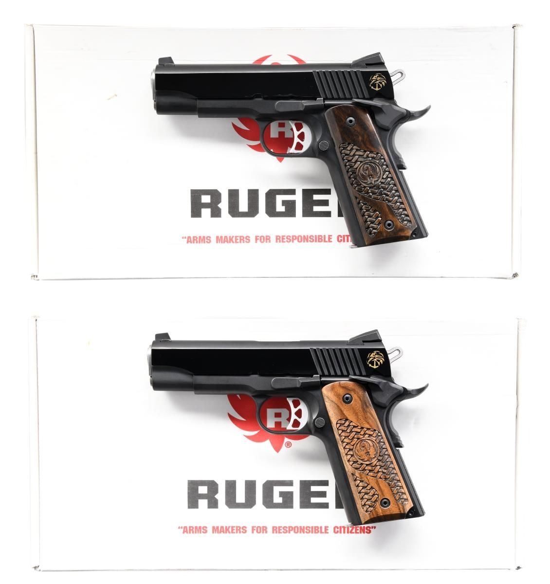 ENHANCED SEMI-AUTO PISTOLS. BOTH: Cal. 45 ACP. Gun 1: S# NSF109, Gun 2: S# NSF110 Bbl. 4.25" stainless (bushing, too) throated. Mfg. 2014 as 1 of 250 limited edition from Davidson's as Model 06704 and distributed by Davidson's as a limited edition of 500 units (NSF001 to NSF500) to raise money for the Navy Seal Foundation (NSF). For each pistol sold, $100 was donated to the Foundation. Commander is configured of stainless steel with a high gloss DLC black coating on the slide (matte on the frame); at the rear is the Ruger logo on the right and the NSF logo on the left (both in gold). Standard Ruger enhanced SR1911 features include an integral plunger tube, checkered flat mainspring housing, beavertail grip safety with memory pad, extended thumb safety, flared and lowered ejection port, extended magazine release, skeletonized hammer, and trigger with overtravel adjustment. Dovetailed 3-dot sight set with Novak-style drift-adjustable rear sight. Grips are laser-engraved French walnut with Ruger logos and basket weave gripping surfaces. MAGS: 4 TOTAL; factory bright stainless 7 rd. UNATTACHED ACCESSORIES: a matching-numbered factory box with packaging for each to include NSF and Davidson's materials. CONDITIONS: all aspects of both are near excellent, appearing new and unfired. (23-6889, 23-6890/NW). BOTH MODERN. $1,500-2,500.