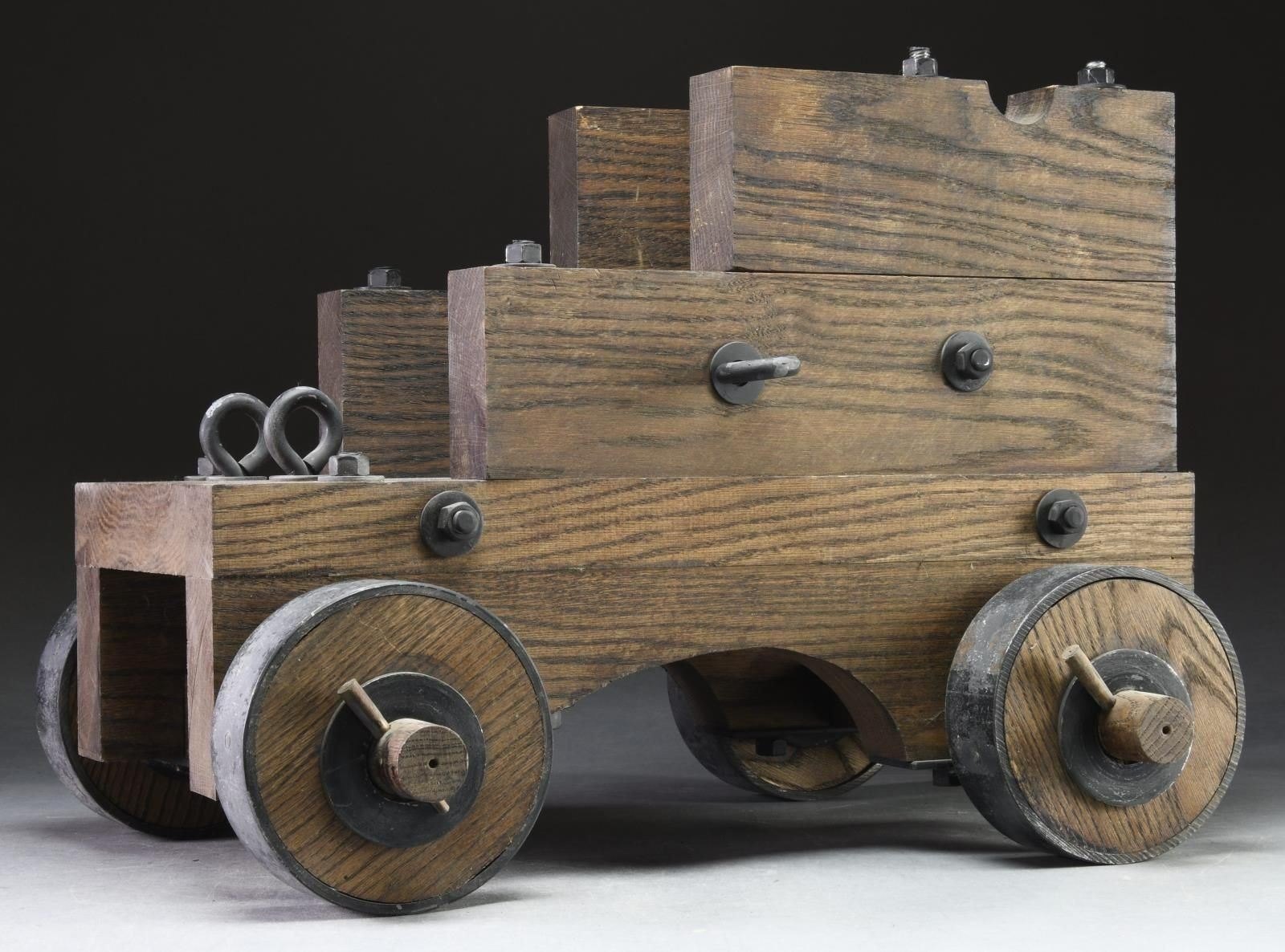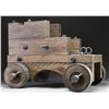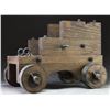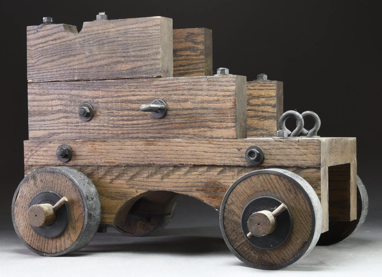 Contemporary cannon carriage that measures 24" in length & 10 1/2" in width. Wooden body & wheels w/ metal tires & mountings. CONDITION: wood shows scattered scratches & dings. Metal parts show scattered oxidation & flaking. PROVENANCE: from the Lifelong Collection of Glen E. Mattox.(02-18965/MJC). $100-200.