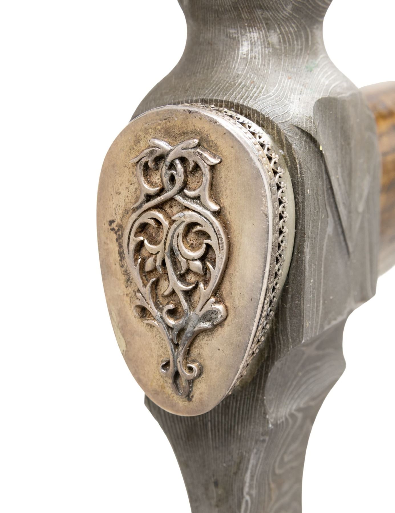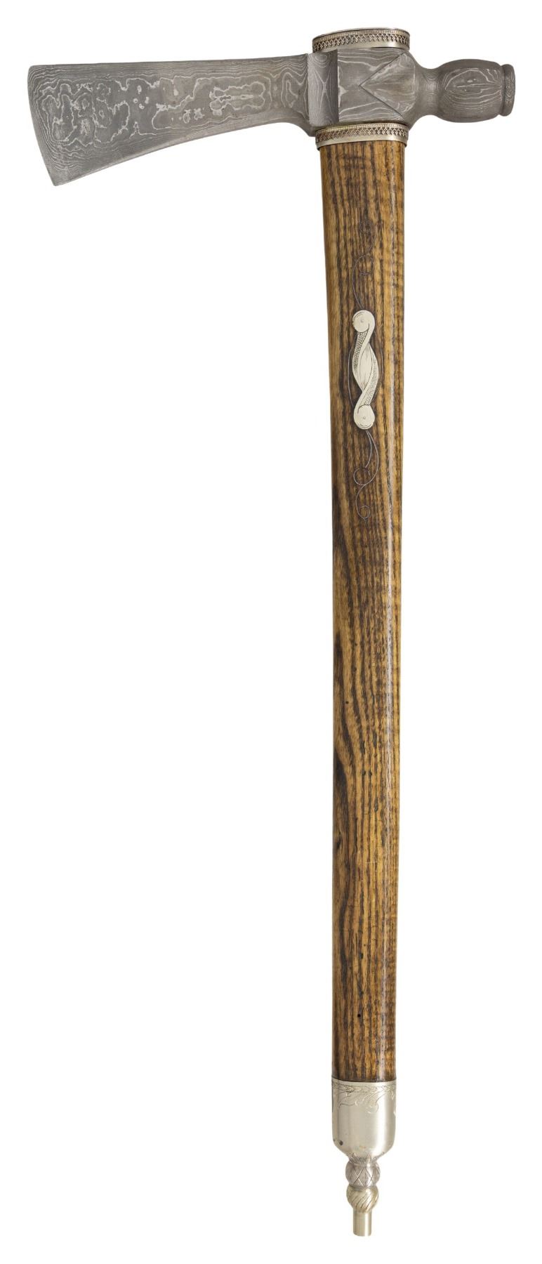 8.75" forged Damascus head, 2.25" cutting edge, German silver mounted 22" wood stem. CONDITION: fine overall. (02-25229/JS). NON-GUN. $800-1,200.