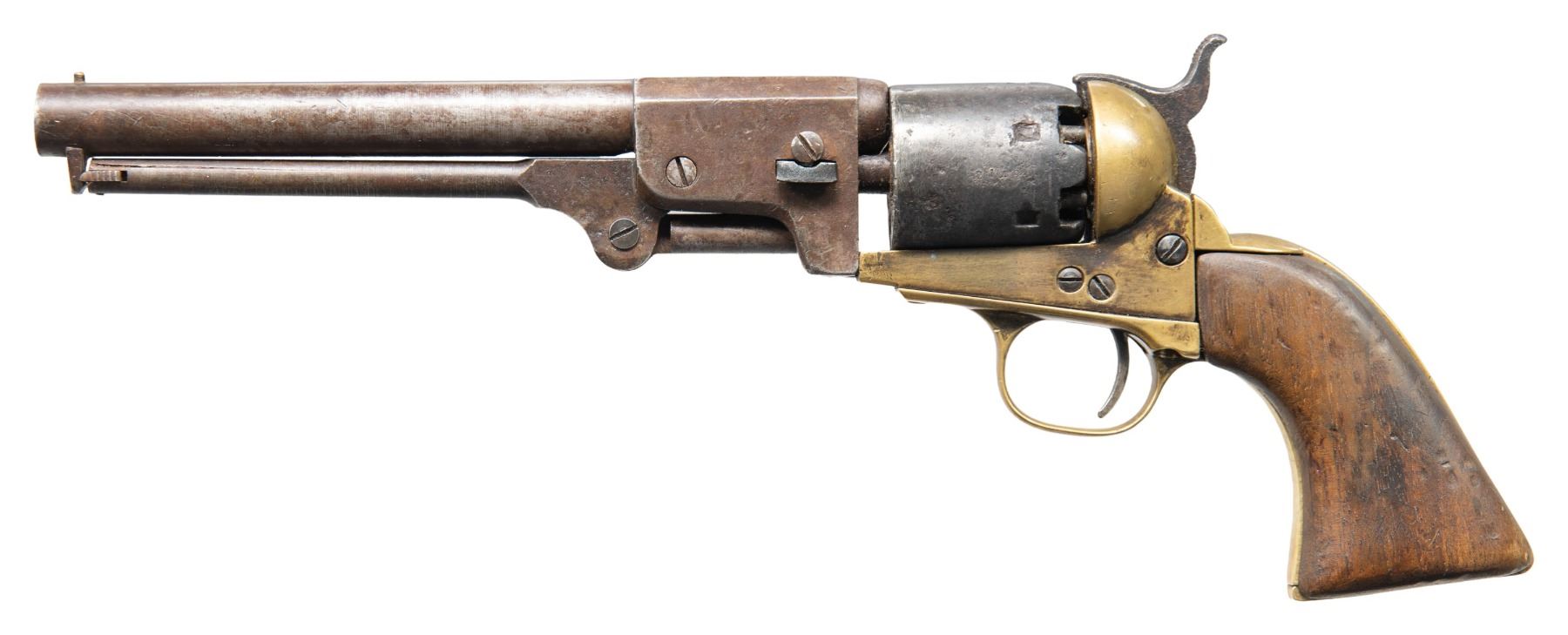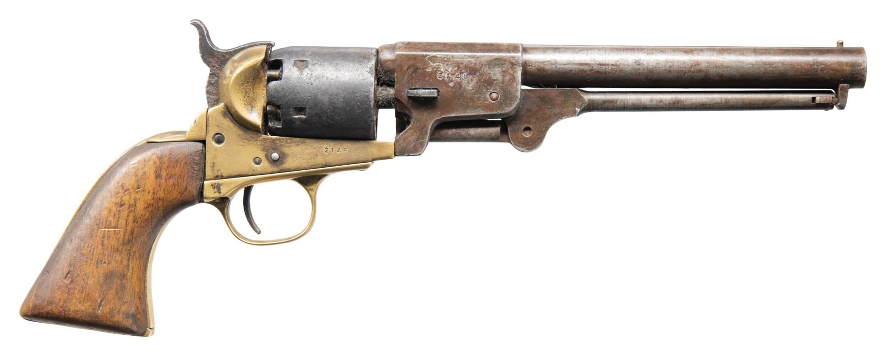 REVOLVER. Cal. 36. S# 2148. Standard configuration for a Confederate copy of Colt Navy revolver made with 7.5" round barrel. UNATTACHED ACCESSORIES: 2 collector tags, file of photos and miscellaneous information on Griswold & Gunnison. CONDITION: good-very good overall, artificially aged, mechanically functional, pitted rifled bore. (01-27907/JS). ANTIQUE. $800-1,200.