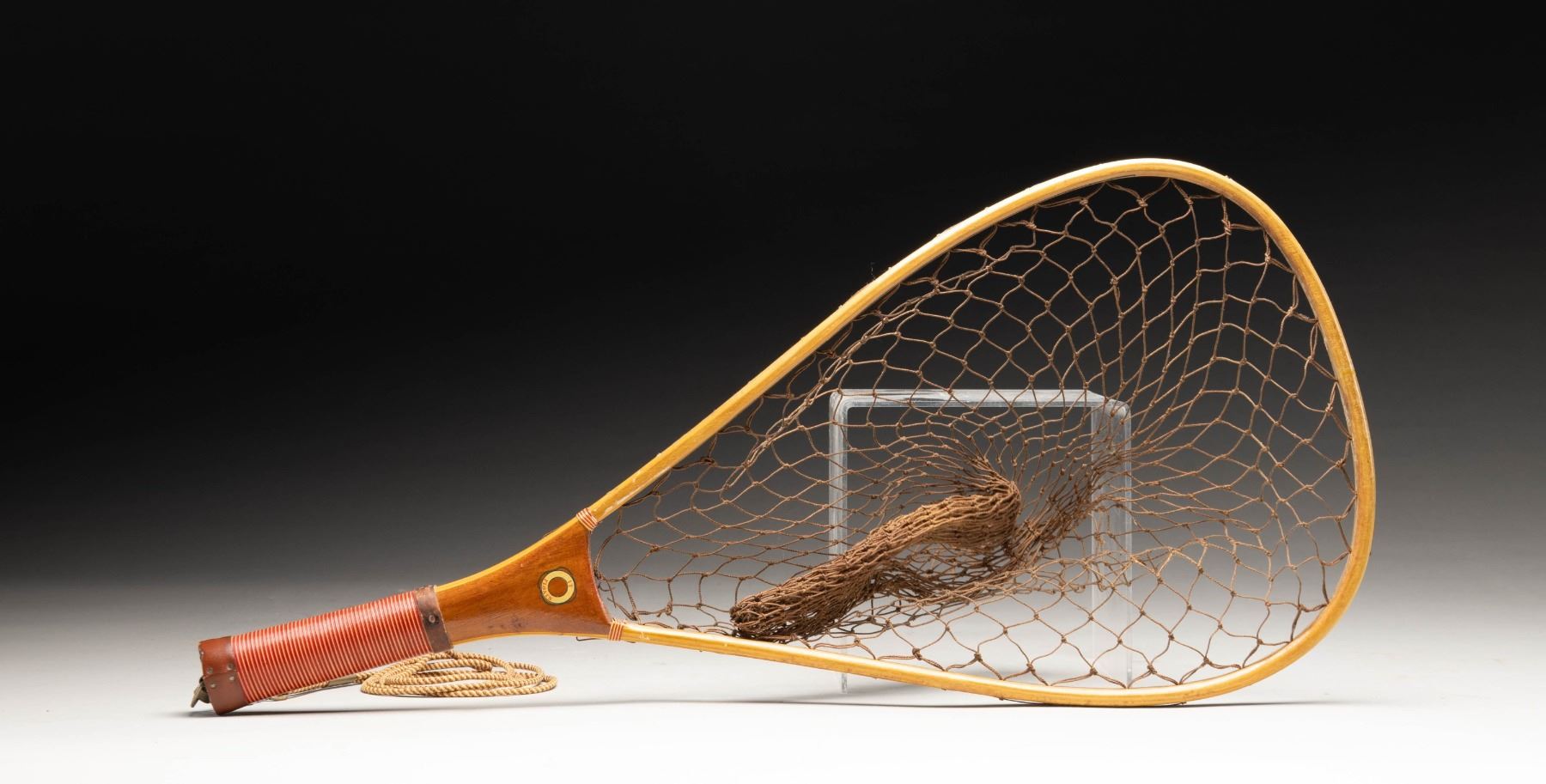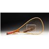 Overall: 24". Wooden handle has ruler inside of loop. Pommel has lanyard. CONDITION: net is very good overall with netting intact. PROVENANCE: Norman Olliff Estate. (02-25709/MD). NON-GUN. $20-40.