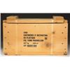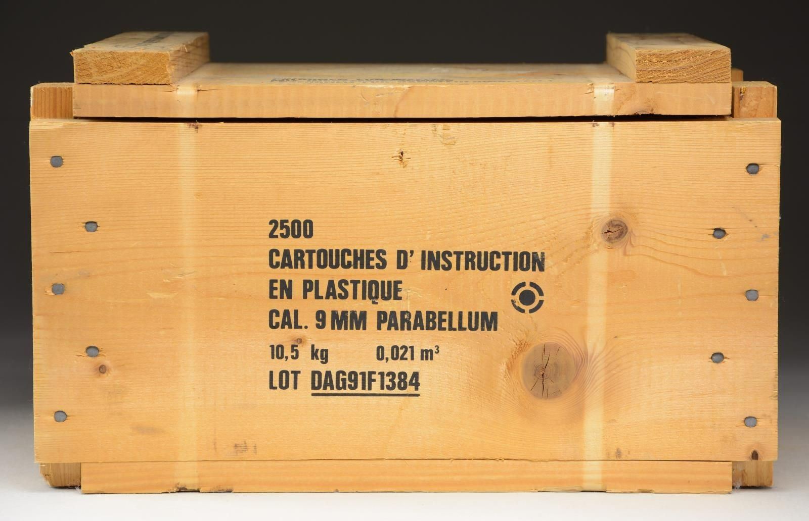 Crate of plastic 9x19mm training ammunition. Crate lid is marked "PATRONEN FUR WAFFEN,/ MIT INERTEM HESCHOSS/ ( PATRNEN FUR HANDFEUERWAFFEN )" (CARTRIDGES FOR WEAPONS,/ WITH AN INERT BULLET/( CARTRIDGES FOR HAND GUNS )".Crate contains 50 50-rd. boxes of ammunition. Boxes are sealed in plastic (with the exception of one which was opened at one time) labeled in French and read "50/ CARTOUCHES D' INSTRUCTION/ EN PLASTIQUE/ CAL. 9MM PARABELLUM/ LOT DAG91F1384". (INSTRUCTION CARTRIDGES/ IN PLASTIC/ CAL. 9MM PARABELLUM/ LOT DAG91F1384). Cartridges are comprised of blue plastic and and marked "9mm/ Luger" above "DAG" on their sides. CONDITION: excellent, with ammunition remaining clean and serviceable. Boxes are factory sealed, save for one box that was opened at one time (all ammunition in box is present). Crate remains sturdy and serviceable. (02-21057/MLW). $200-300.