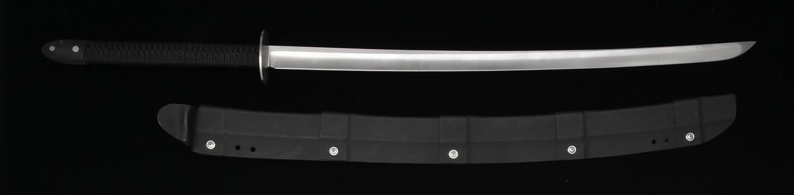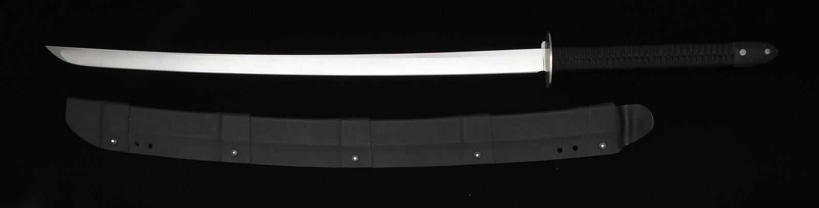 27.5" Tanto, upswept & trailing blade of A2 material. Overall length: 40.5" w/ full tang & G10 wrapped handle. Kytex sheath. CONDITION: near excellent showing light scratches. Blade is sharp. PROVENANCE: Estate of Rick Ingwersen. (02-15942/DS). $600-900.