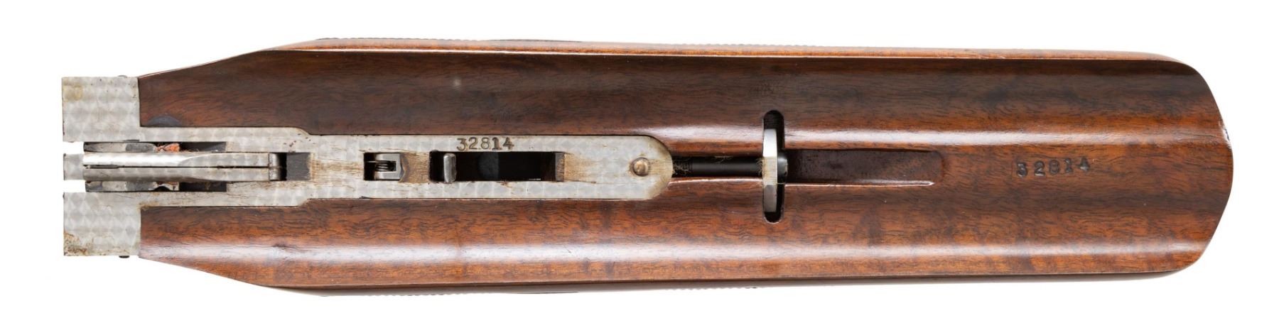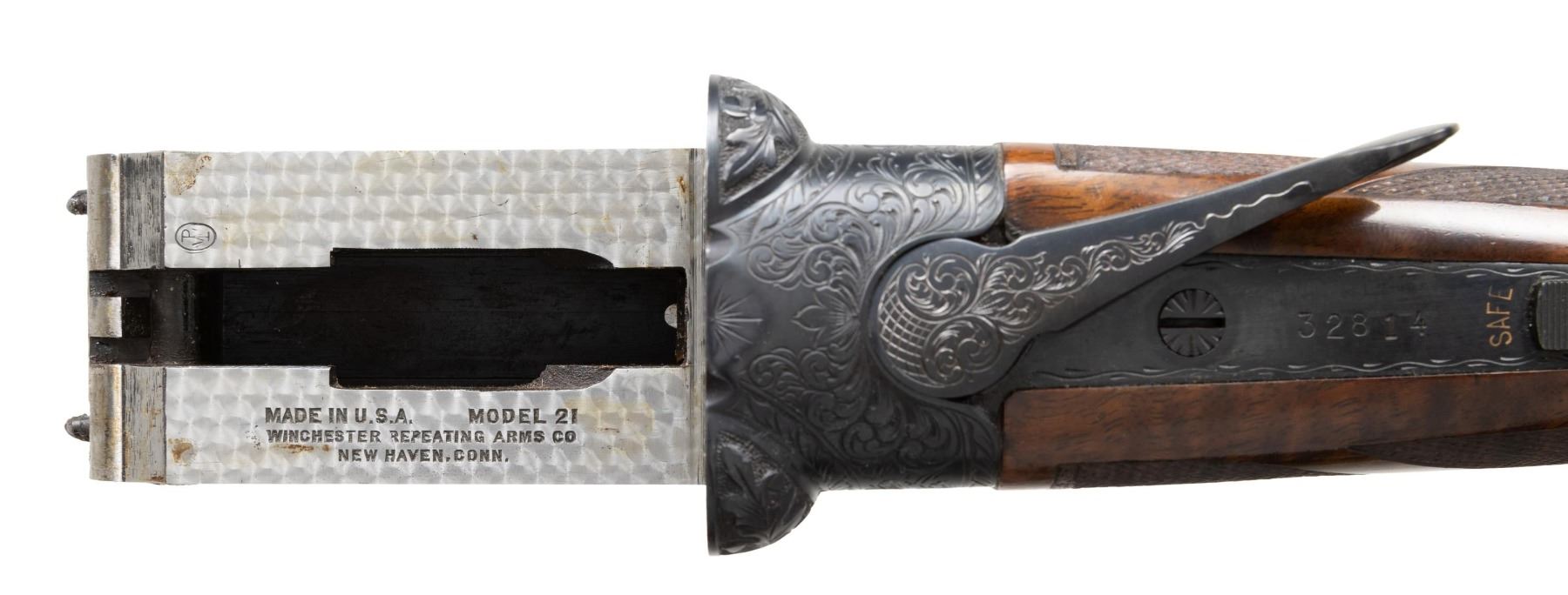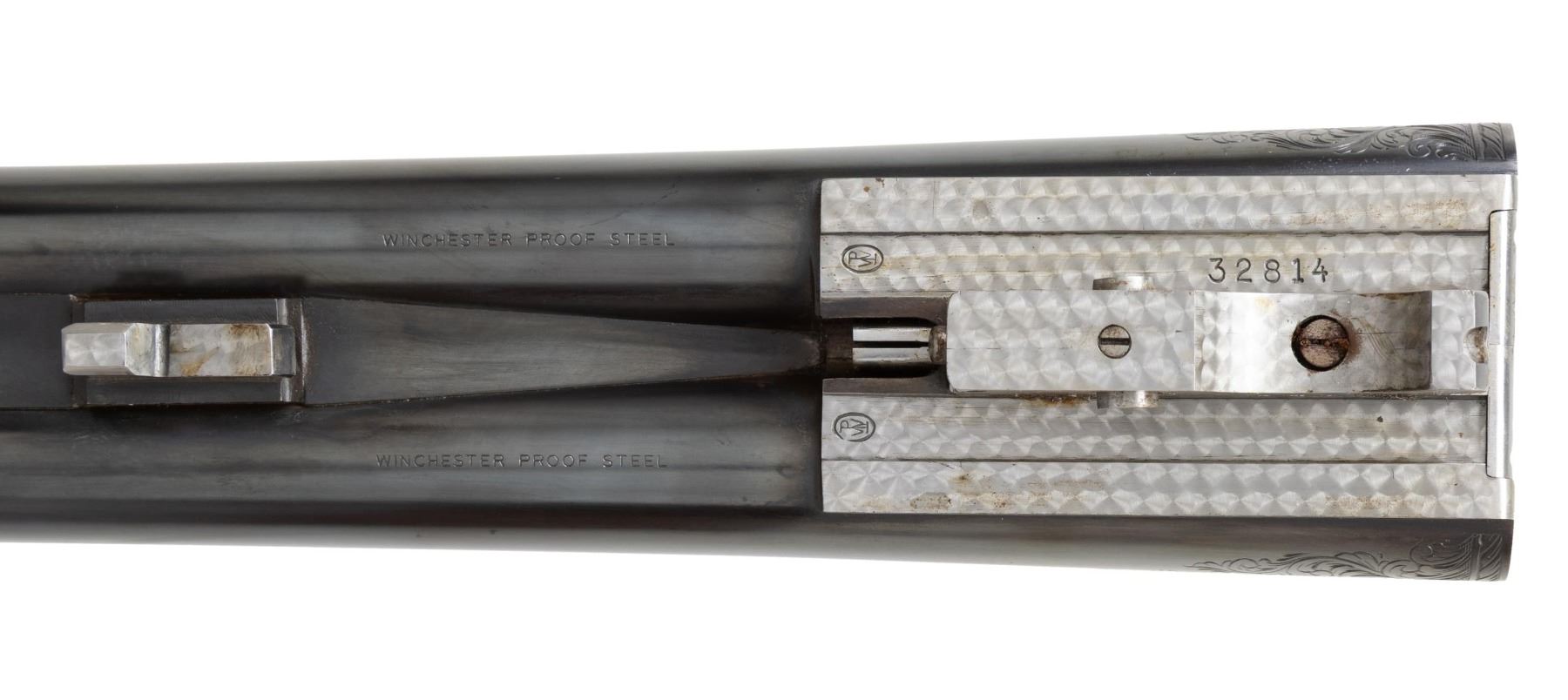 RIFLE. Cal. 50-140 Win. S# 32814. Bbls are 26" of Winchester proof steel. Ramp mounted bead front sight with quarter rib mounted Express rear sight having one standing and three folding leafs. Flat sided boxlock action w/ blue finish having Grand American style No. 6 engraving w/ gold. Right side scene features a gold moose. Left side scene features gold bugling elk. Floorplate has a gold big horn ram. Trigger guard has a gold bear portrait. Bolsters feature oak leaf carving. Balance of action has scroll engraving and fancy borders that continue to forearm iron and breech end of bbls. Features include gold plated SST, selective ejectors, and automatic safety. Water tables of frame and bbls along w/ inside forearm are jeweled. Ebony tipped beavertail forearm w/ pistol grip stock of fancy gloss finished walnut. Stock and forearm have fine segmented borderless checkering w/ fleur de lis highlights. Blued steel grip cap w/ gold Grand American marking. Toeline of stock has oval name plate. LOP: 14 3/8" over a solid red pad. WEIGHT: 10 lb 2 oz. CONDITION: 99% original blue. Stocks show a few small dents and handling marks. Bright near excellent bores. (25-1413/DS). CURIO. $10,000-15,000.