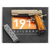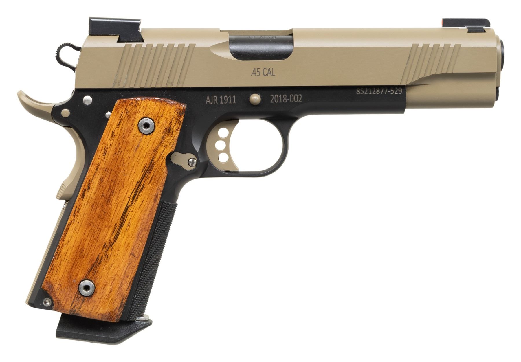 Cal. 45 ACP. S# 2018-002/85212877-529. Bbl. 5". TG-H3 sights with u-notch rear. Custom 1911 Government style pistol. Extended right handed safety. Extended beavertail grip safety. Black frame marked "AJR 1911" with stippled grip straps. Tan slide with front & rear serrations. Smooth hardwood grips. MAGS: 2-8 rd. Chip McCormick. UNATTACHED ACCESSORIES: 1911 Builder's Box & three 45 ACP Snap Caps. CONDITION: grips have added finish with some handling marks. Metal shows some light handling marks & varnish spots. Action functions properly when hand cycled. Bright near excellent bore. (25-5261/MJC). MODERN. $700-1,100.