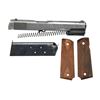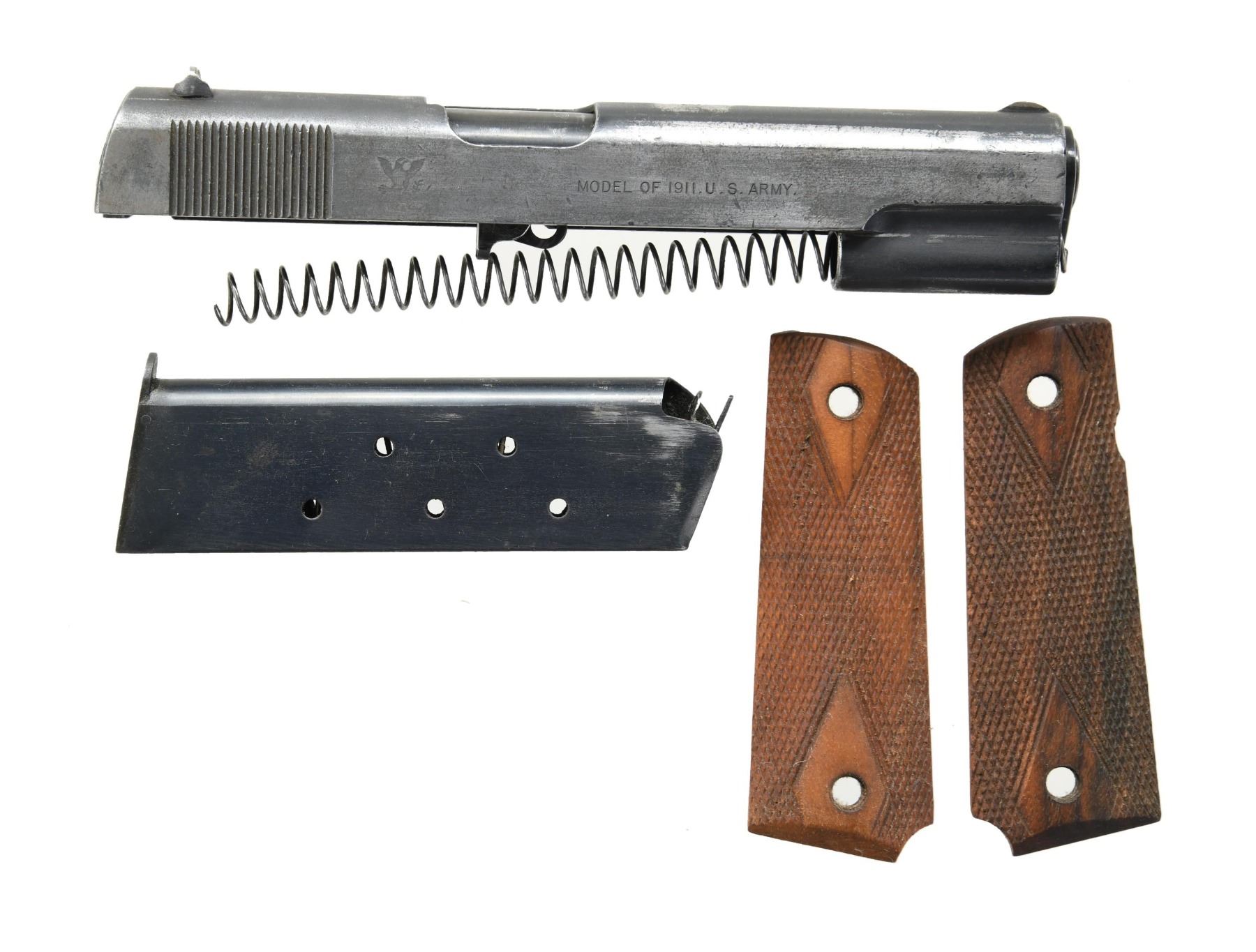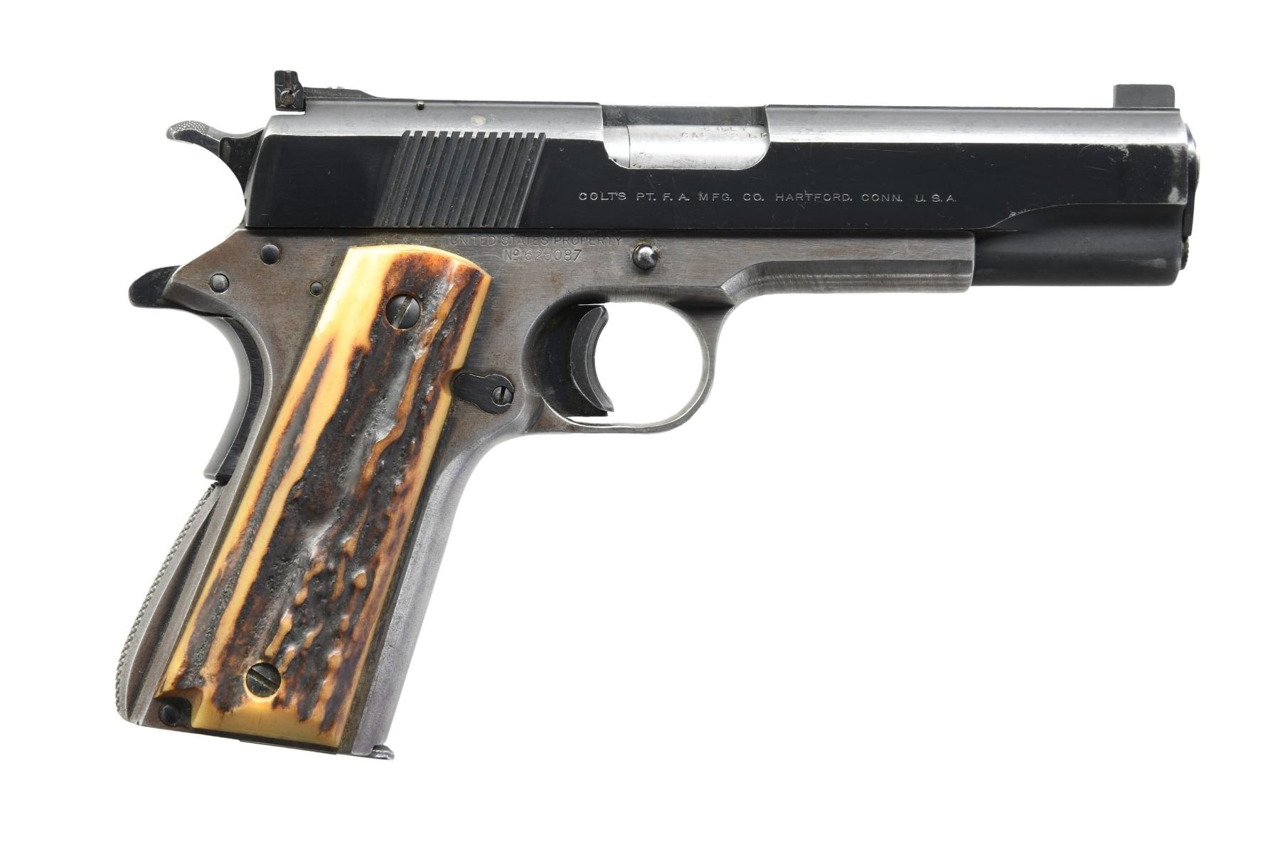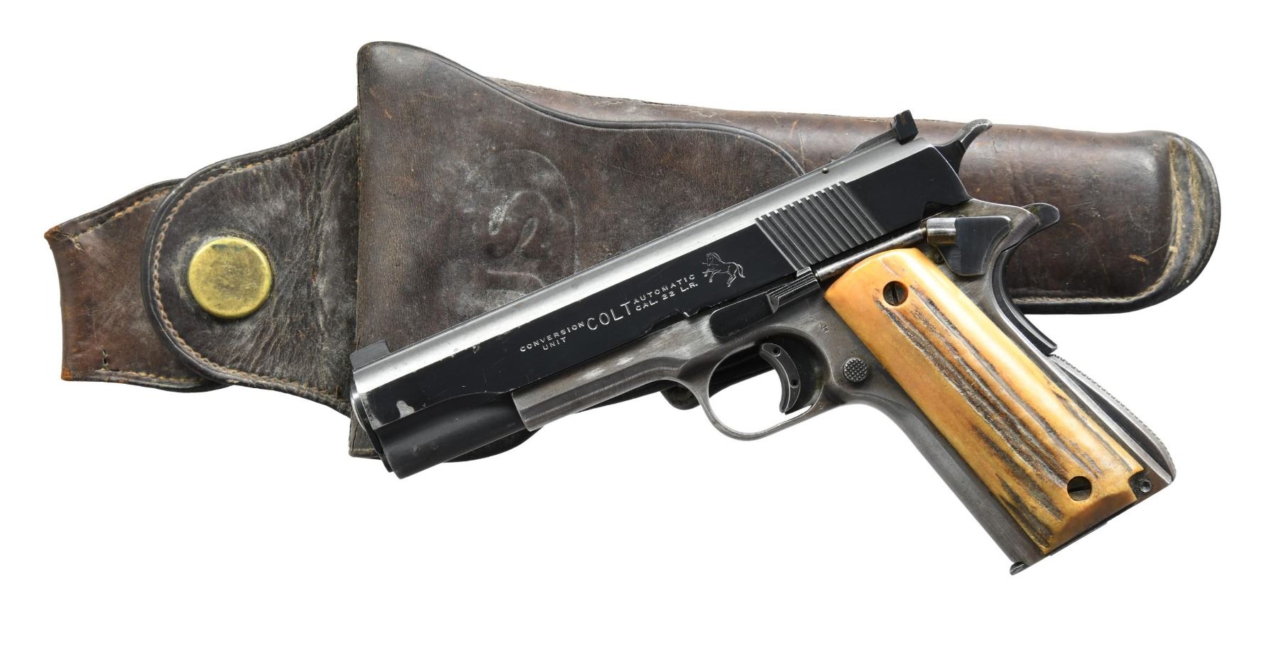 Cal. 22 LR. S# 625087. Colt Conversion unit slide assembly having 5" barrel with floating chamber. Blade front sight & adjustable rear sight. Post WWI Colt military frame, added trigger shoe & 2 piece stag grips. MAGS: 1 cal. 22 LR - 10 rd. & 1 Cal. 45 ACP 7 rd. UNATTACHED ACCESSORIES: Zippered case contains Springfield Armory slide, Colt 5" Type 6 barrel, recoil spring, Type A slide lock, new double diamond walnut grips, & swivel US 1911 holster stamped "K78" in fair condition. CONDITION: slide has good blue with large areas of finish loss. Frame has cleaned gray patina appearance. SA slide shows heavy cleaning. 22 bore near excellent. (24-3847/MD). MODERN. $1,100-1,600.