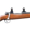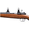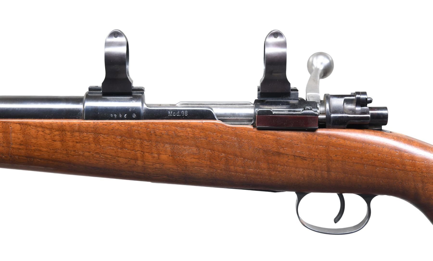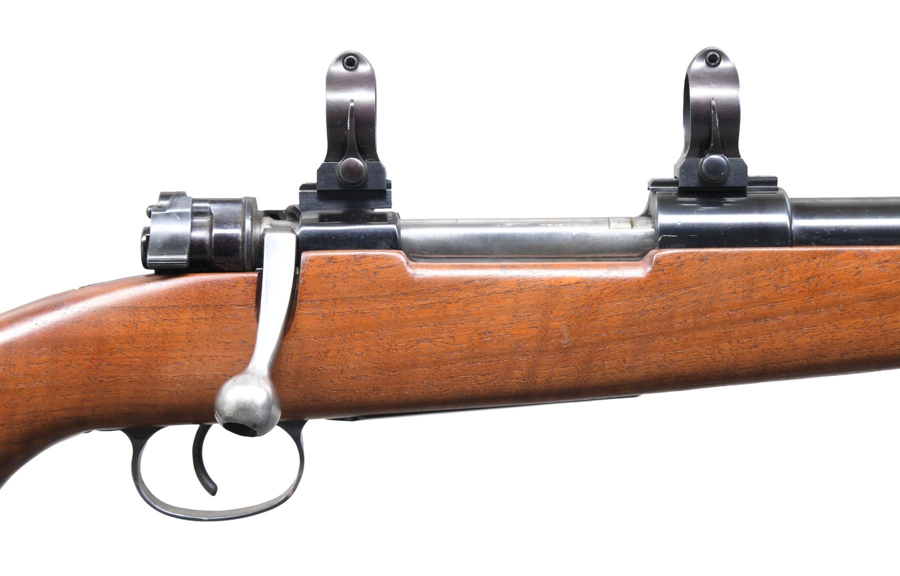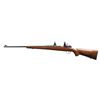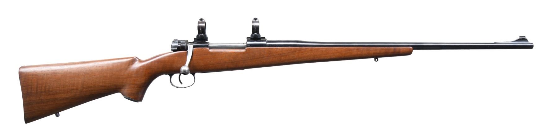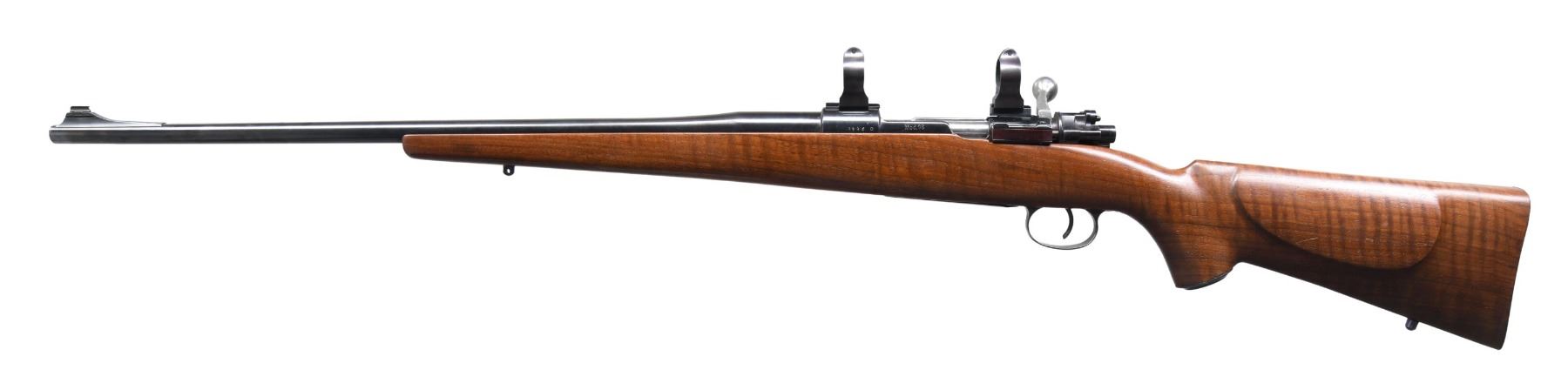 Cal. 7mm Rem. Mag. S# 8384e. Bbl. 24" sporter weight with Williams ramped base and brass bead; no provision for rear sight. Mfg. 1943 with Gustloff Wereke action marked "bcd", "749" proof and "43" on front receiver ring. Custom built with uncheckered walnut stock having sling studs plus checkered steel curved widows peak buttplate and matching grip cap. Standard military trigger and trigger guard assembly (matching numbers). Bolt fitted with Buehler safety (stiff to engage; normal release) and custom longer bolt handle with hollow knob; face opened up for magnum cartridges. Warne scope mount system having 1" vertical split rings with quick release levers. CONDITION: very good overall with near excellent bore. Light handling marks on stock set. Light oxidation on areas of triggerguard assembly. Cleaned oxidation spots on bolt handle. Missing triggerguard lock screws. Spotty, light oxidation on grip cap and buttplate. (24-6601/NW). MODERN. $350-500.
