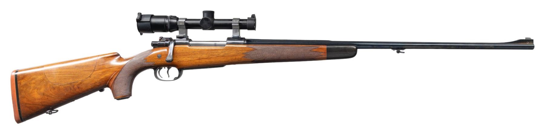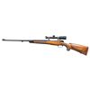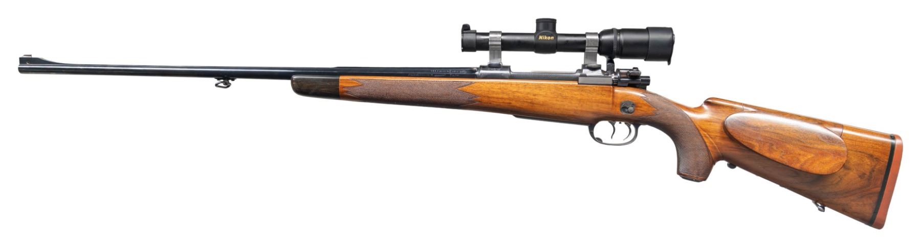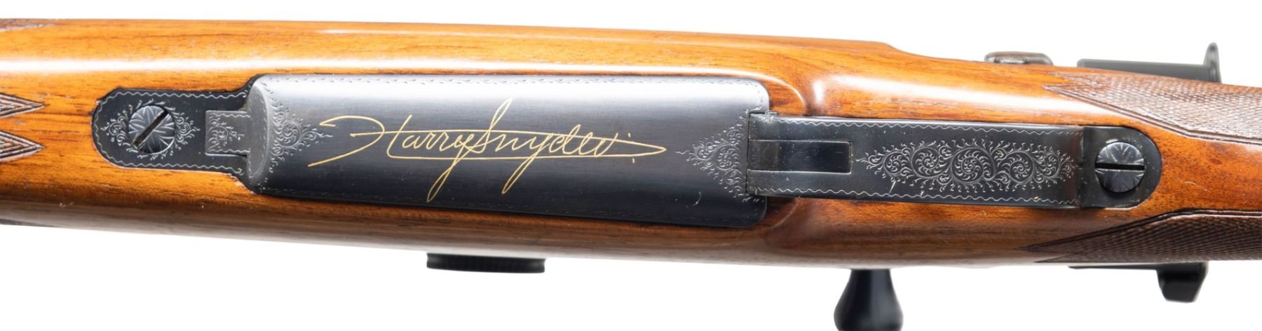 Cal. 300 H&H Mag. S# 17602 (on barrel). The 26-5/8" one third octagon, 2/3 round barrel with matted rib has central portion of rib cut away forming front sight ramp holding silver bead. It appears barrel was originally made for 7x64 cartridge then rebored to 30 caliber and fitted to magnum length square bridge Oberndorf type solid side wall action. Action is not Mauser marked or serial numbered. The only marks found are Belgian nitro proofs on receiver ring that match barrel. Action has been dovetailed for front scope base and rear base has been screwed to lowered square bridge. Bolt, also unnumbered, has Germanic type butter knife handle. Bottom metal with drop box is also devoid of any numbers and is fitted with late style Mauser factory type double set triggers. Hinged floorplate with release button in trigger guard bow is gold inlaid "Harry Snyder" (President and partner of Hoffman Arms. A photo of him holding this rifle is on page 24 "Snyder's Book of Big Game Hunting" by Harry Snyder published in 1950). Action and bottom metal are engraved with sprays of scroll. Steel trap capped extreme pistol grip stock made of lightly streaked dense European walnut and measures 15" over Silver type pad. Stock features pop-up right hand cheekpiece for scope use, chin strap transition to point pattern checkered grip, horn forend tip and Greener side safety. Rifle is mounted with Nikon Monarch 2-4X scope with three post and crosshair reticle with storm caps in custom machined claw rings. CONDITION: very fine as custom finished. Metal retaining essentially all custom blue. Engraving on action shows some softening from re-polish. Stock retains essentially all of its original oil finish with some minor handling marks. Bore is very fine. Mechanically fine. Scope is "near new" with unblued newly made rings; optically clear. PROVENANCE: From the Buckstix Collection. (25-6495/MGM). CURIO. $3,500-5,500.