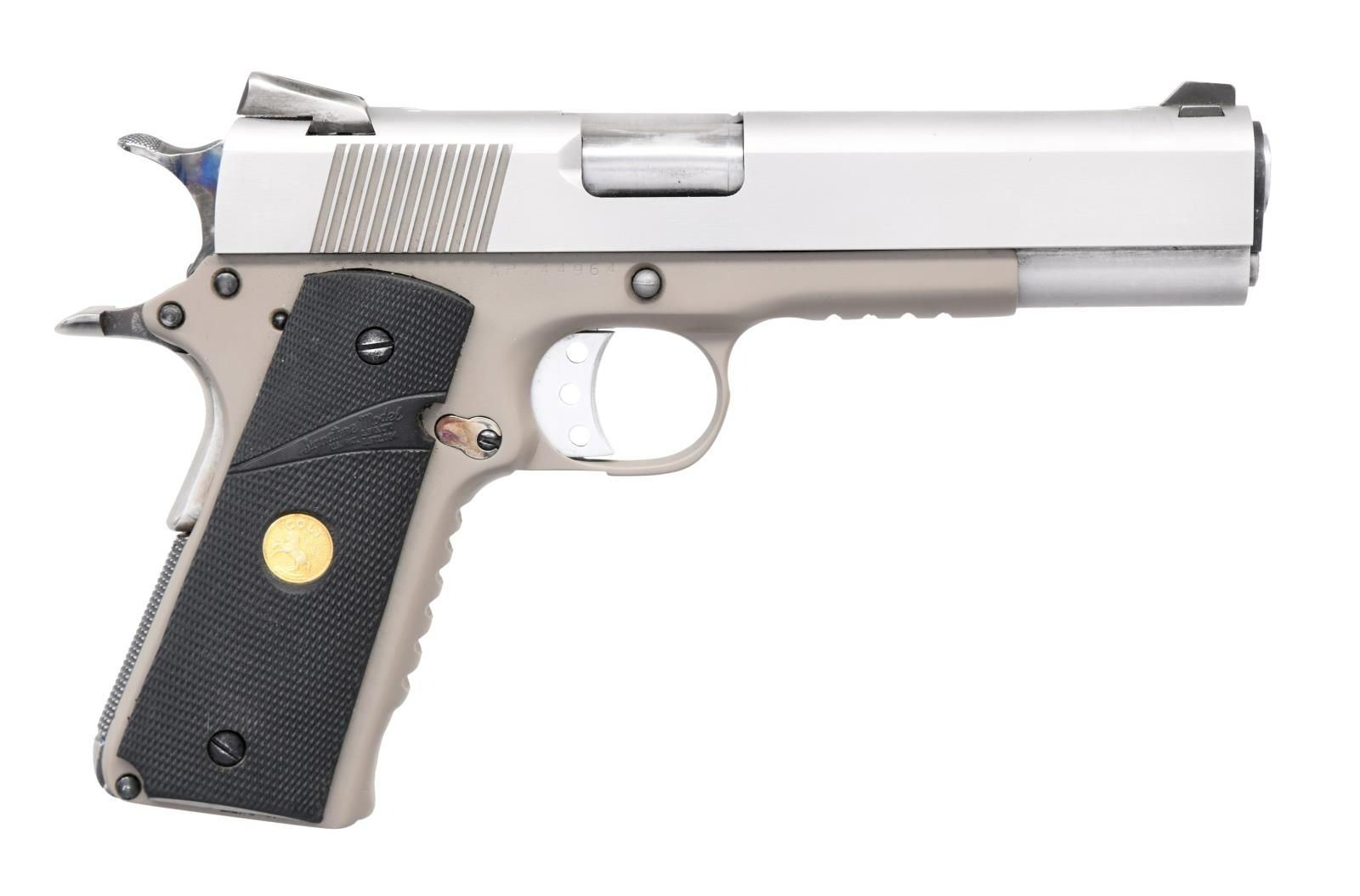 Cal. 45 ACP. S# AP244964. Bbl. 5". Blade front sight. Novak style two dot rear sight. Custom 1911 pistol built using dull gray finished Armscor frame & Springfield Armory Inc. bbl. Backstrap has checkering, front strap & front underside of frame have added grooves. Unmarked brightly finished slide. Extended slide stop that is not engaging & may require attention to fix. Extended grip safety. Pachmayr Signature grips w/ Gold Colt Medallions. MAGS: none present. CONDITION: hammer, rear sight, safety, grip safety & slide stop show fading & some light oxidation. Other aspects rate very good or better w/ some edge, handling & operational wear. (23-6874/MJC). MODERN. $600-900.