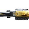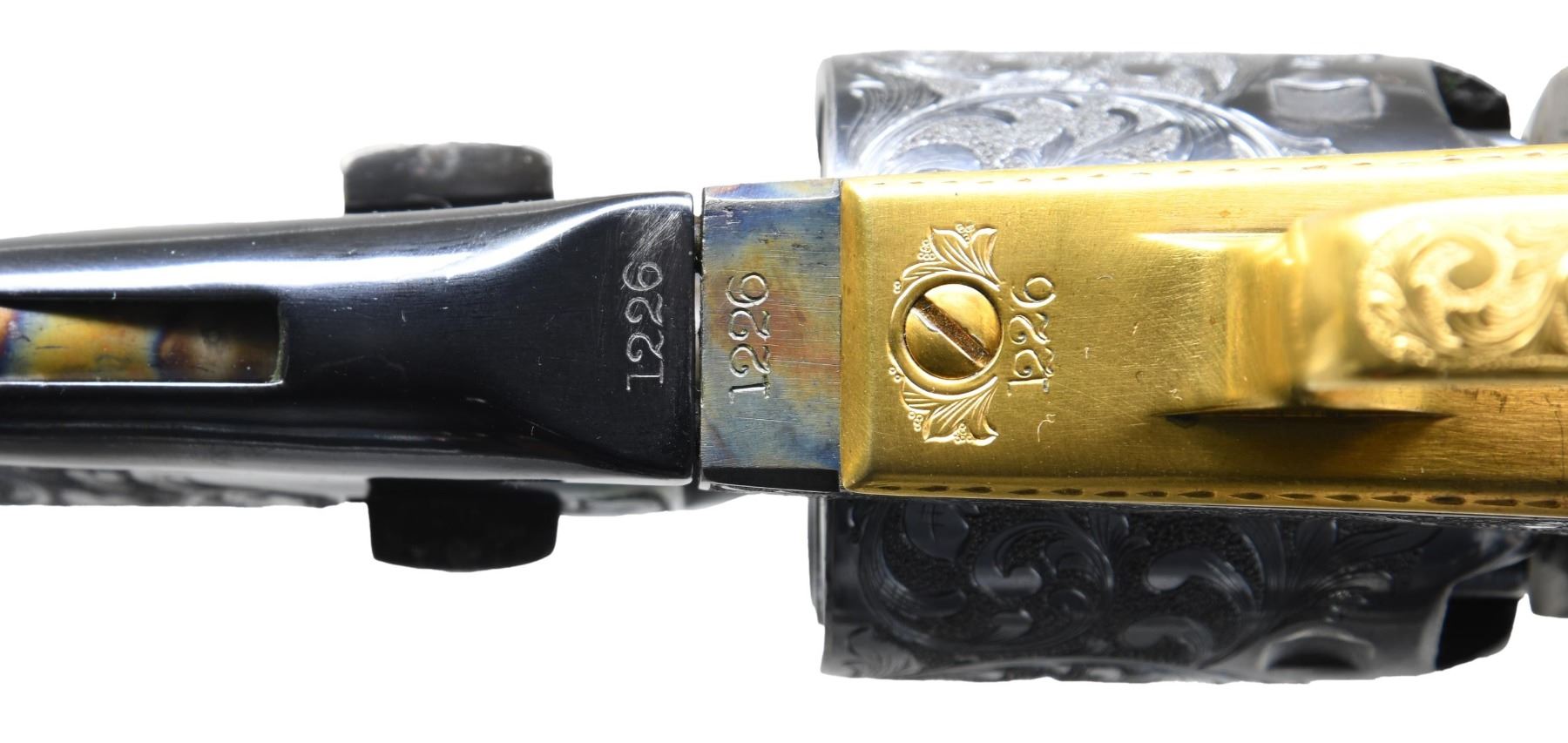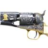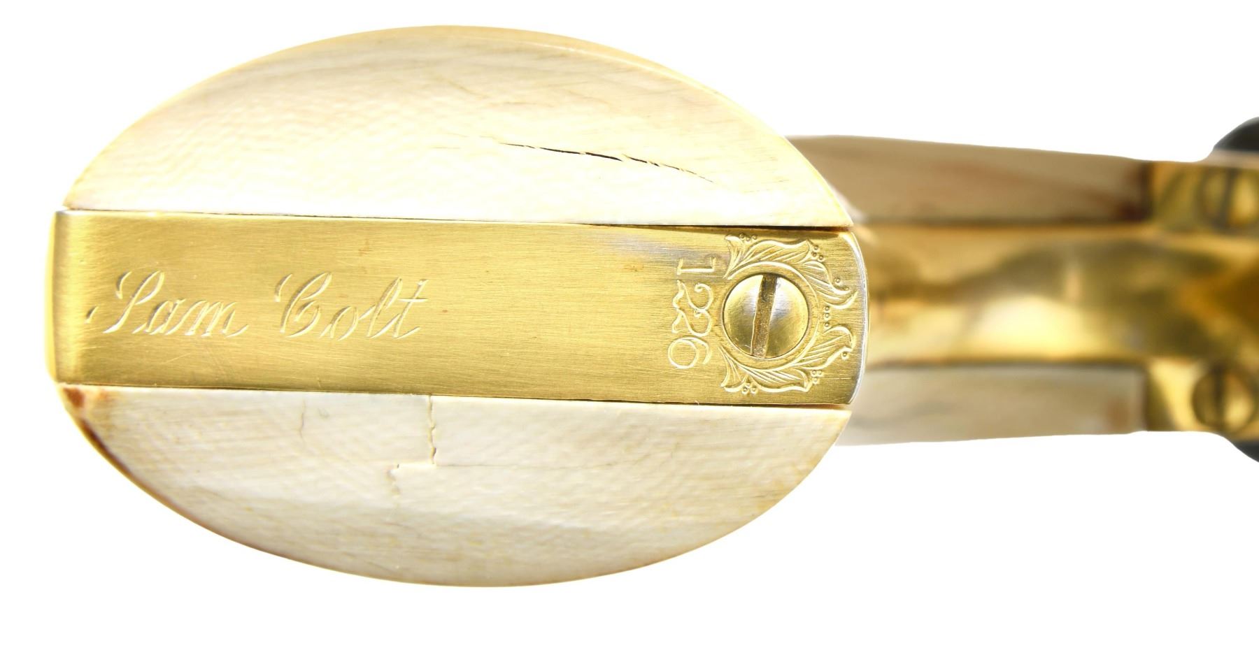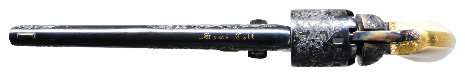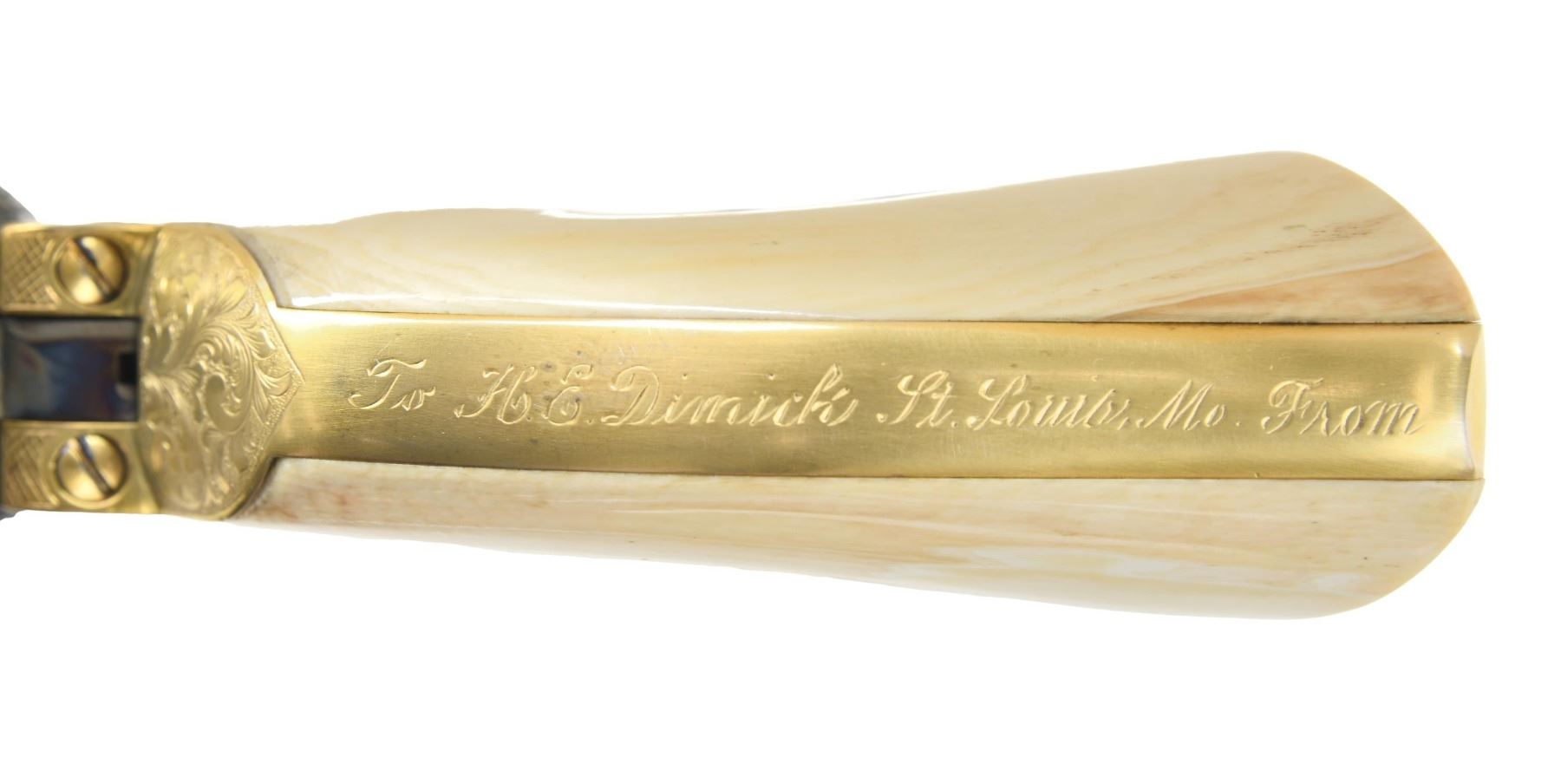 PERCUSSION NAVY REVOLVER. Cal. 36. S# 1226. This is a stunning fancy engraved revolver with gold inlays and fanciful presentation on backstrap. This revolver manufactured in 1861 has been totally refinished with custom engraving, gold inlaid relief portrait of Samuel colt on the left barrel lug, fancifully inscribed on grip frame: "To H E Dimick St. Louis, Mo. from Sam Colt". Standard configuration 1861 Navy revolver, 7.5" barrel, "Sam'l Colt" inset in gold script on top, smooth elephant tusk grips. Modern mahogany compartmented casing houses revolver, reproduction navy sized eagle flask, engraved and reblued "COLTS PATENT" 2-cavity mold army mold, and modern cap tin. CONDITION: excellent as customized, retains almost all of the bright blue and case color finish. Backstrap and trigger guard retain virtually all of their custom gold plating. Mechanics are fine, dark rifled bore. (01-26737/JS). ANTIQUE. $2,000-4,000.