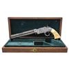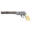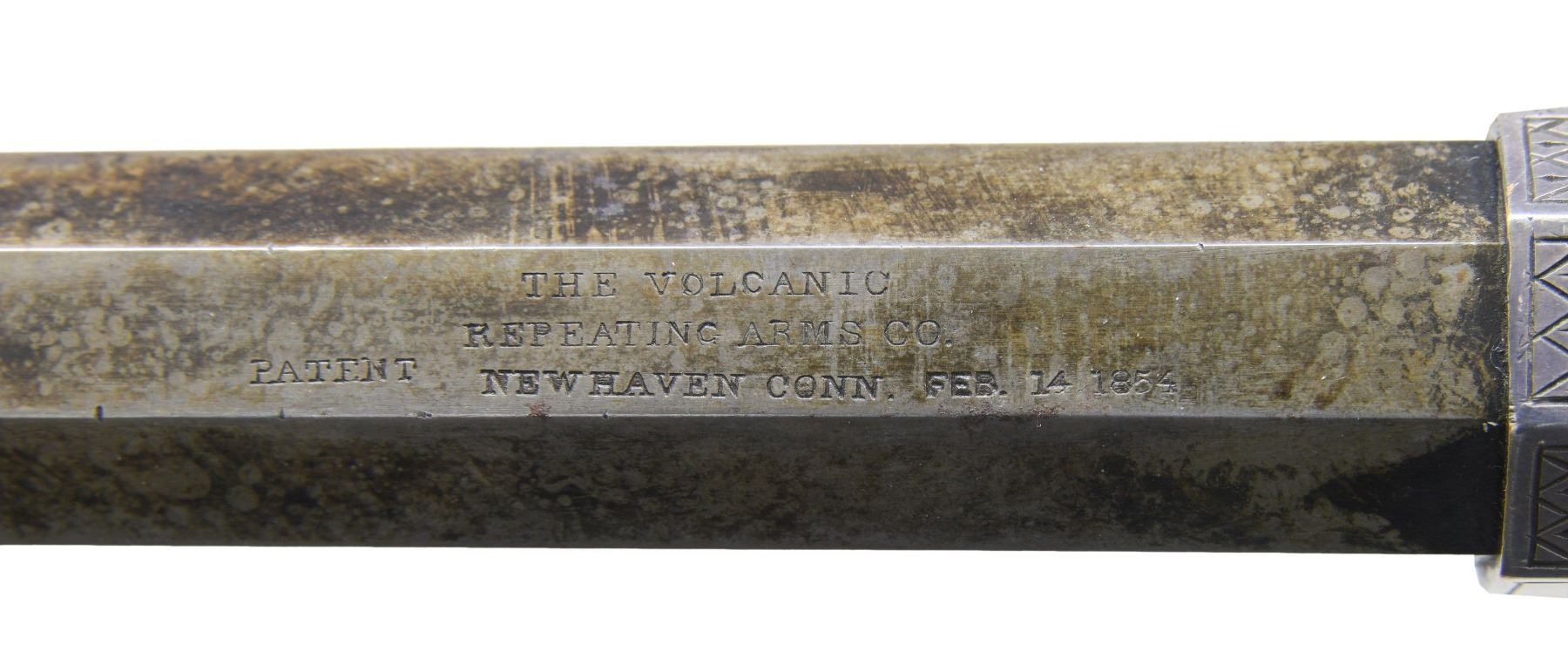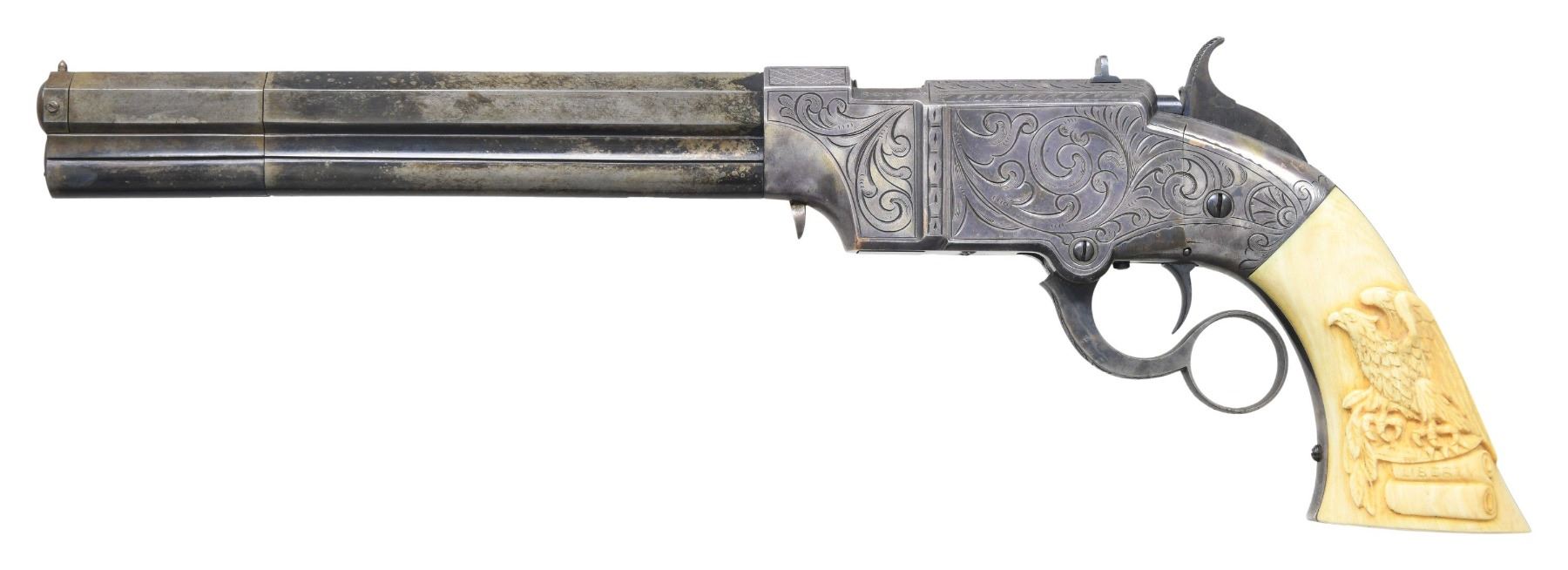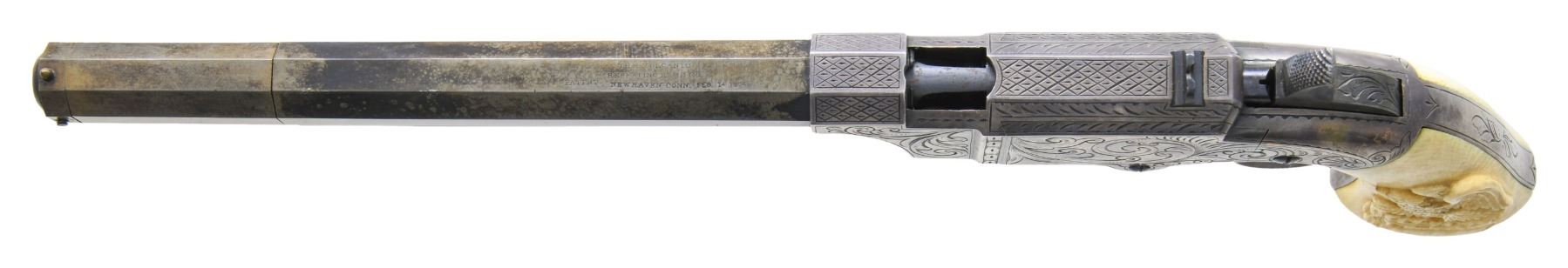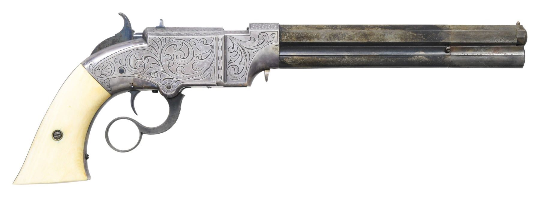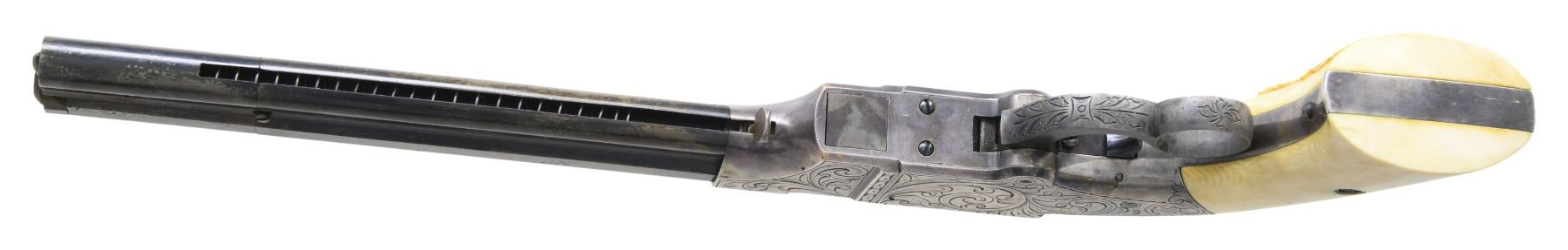Cal. 41. S# 1287. Pistol is in standard configuration with blued 8” octagonal barrel, integral spring loaded magazine, fixed notch rear sight, pinched post front sight, custom silver plated scroll engraved brass frame, custom carved eagle ivory grips. Made to shoot self-contained “rocket ball” cartridges with powder & primer contained in conical ball. Manufactured between 1855-1857 after formation of Volcanic Arms Company from Smith & Wesson after they sold their interests to investors including Oliver Winchester. Barrel markings: “THE VOLCANIC ARMS CO. / NEW HAVEN CONN / PATENT FEB 14 1854” on top flat. Pistol is contained in custom green velvet lined compartmented casing. CONDITION: fine as refinished, barrel retains traces of blue finish, crisp barrel markings, darkened silver plated frame & custom scroll engraving applied after manufacture, patinaed carved eagle & liberty grips are well fit and fine, mechanically fine, sharp rifled bore. Casing is very good. (01-26632/JS). ANTIQUE. $4,000-8,000.