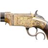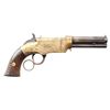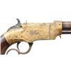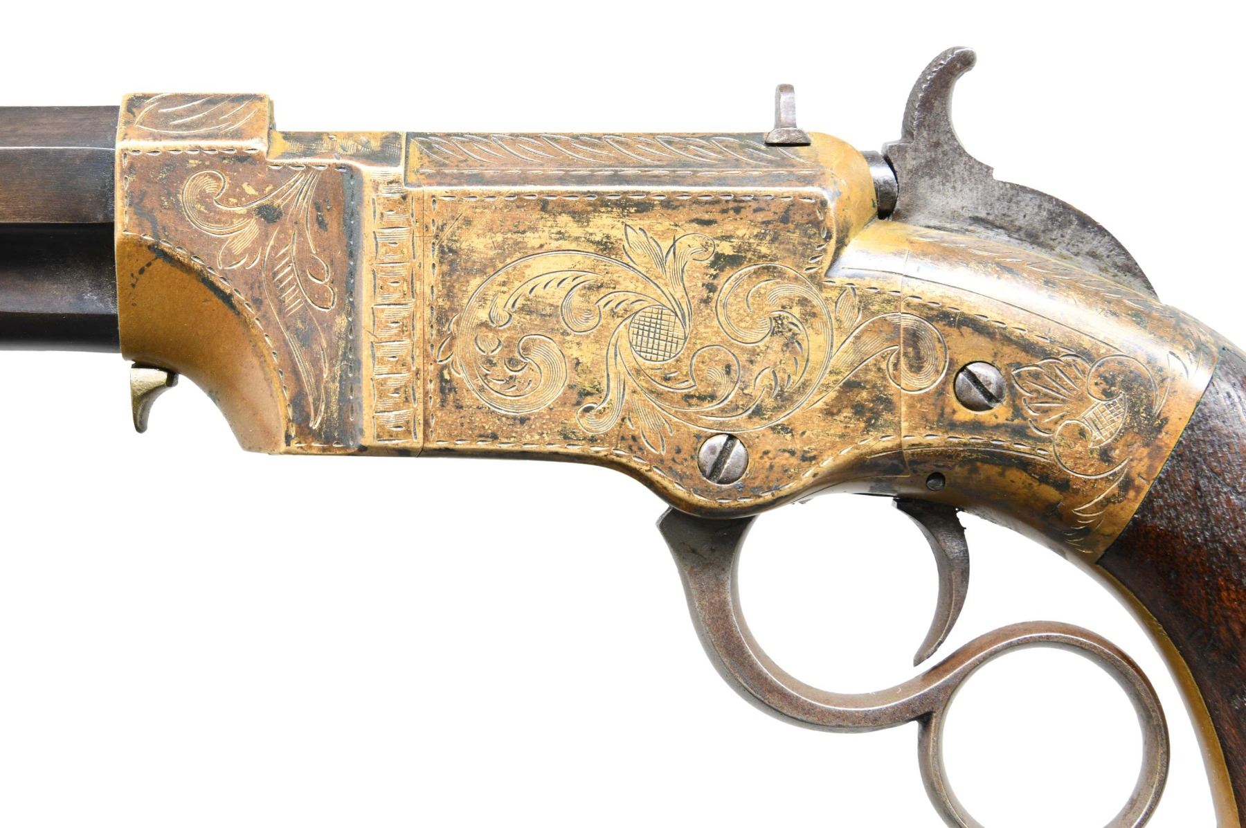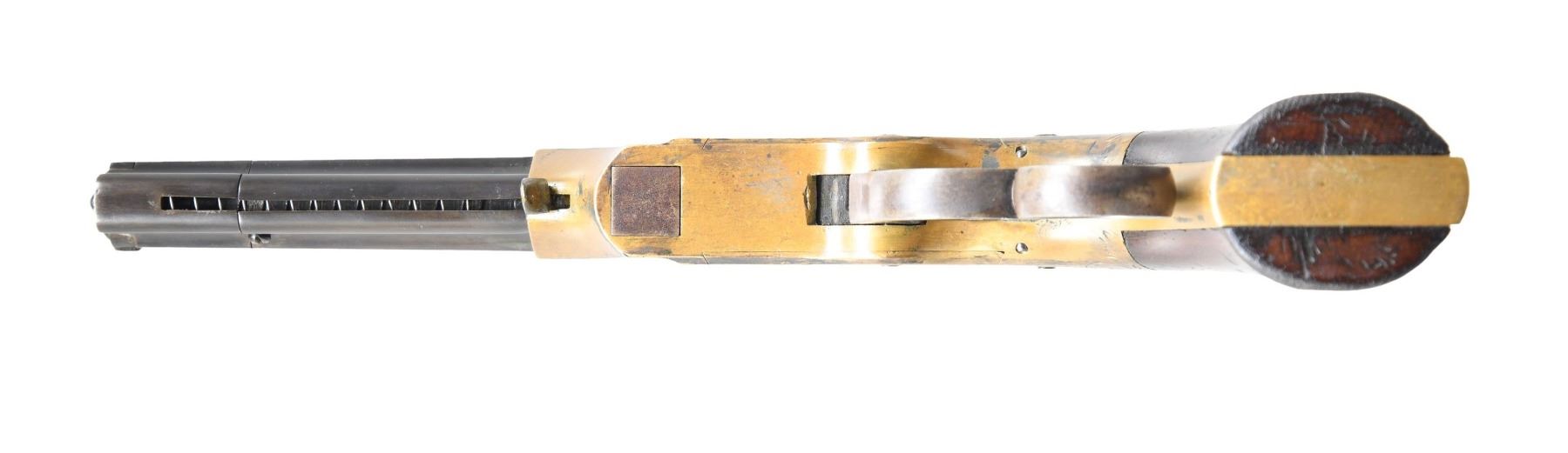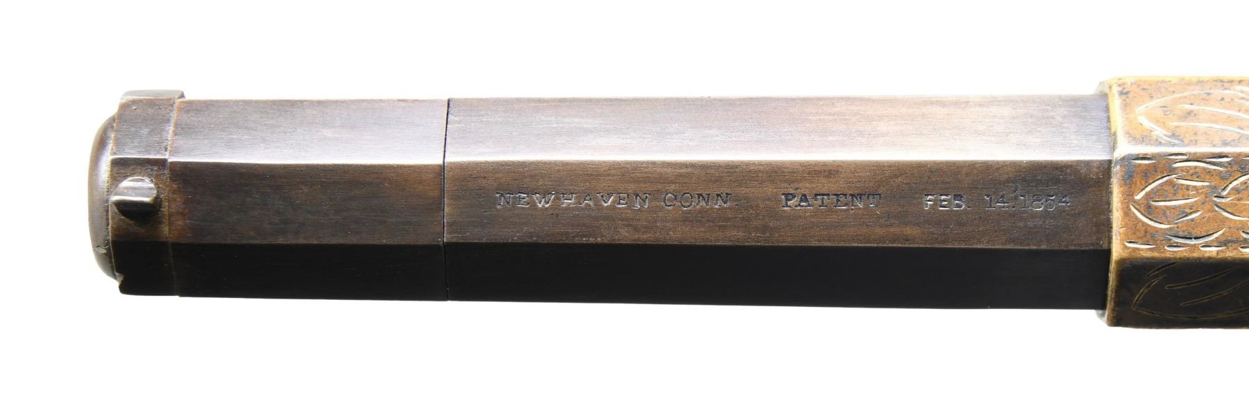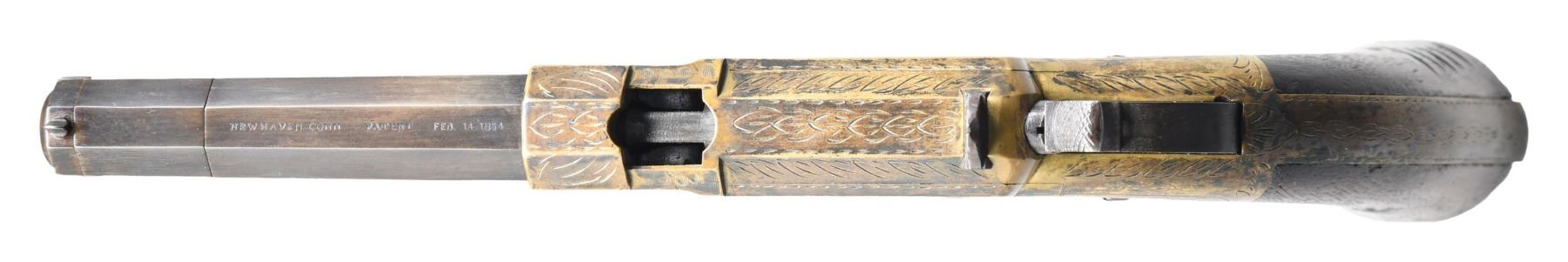 VOLCANIC LEVER ACTION PISTOL. Cal 31. S# 2000. Manufactured between 1857-1860 after the breakup of Volcanic Arms Company by newly formed New Haven Arms Company, continued making same design for the self-contained "rocket ball" cartridges. Standard configuration 3.5" octagonal barrel, integral 6-shot spring loaded magazine, "Volcanic" dropped in address "NEW HAVEN CONN" PATENT FEB 14 1854" stamped in one line on top flat, fixed notch rear sight, pinched post front sight, brass frame, replaced wood grips. CONDITION: very good overall as refinished, custom engraved after manufacture, dull reblued, good barrel marking, brass has mottled patina, replacement grips well fit and are numbered to gun. Mechanics good, crisp rifled bore. Accompanying casing is very good, green velvet lined, mildewed with brass oiler & functioning key. (01-26753/JS). ANTIQUE. $2,000-4,000.