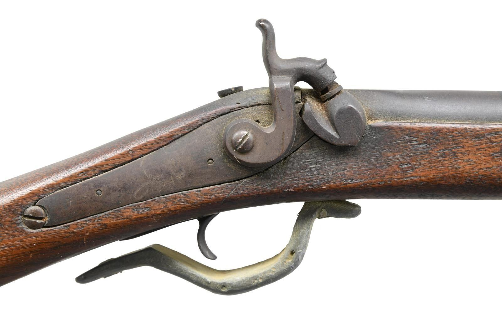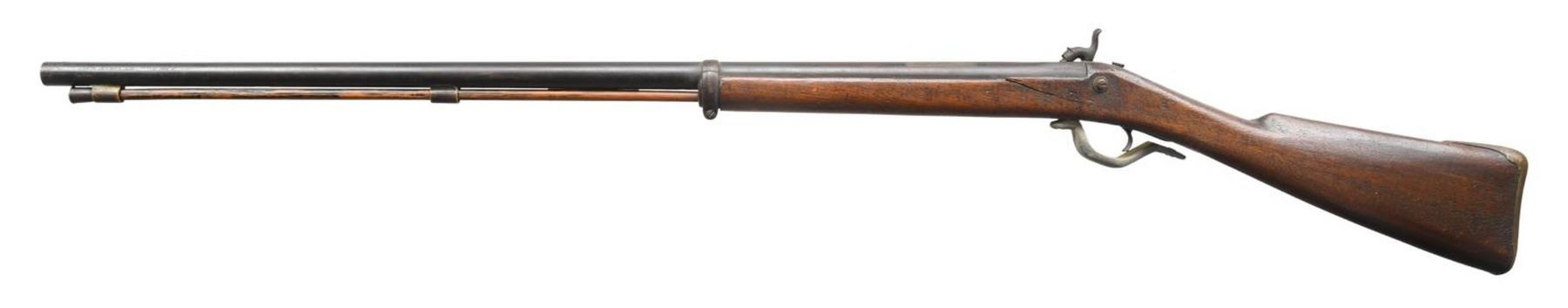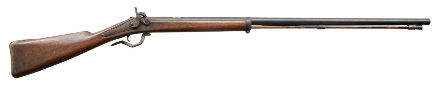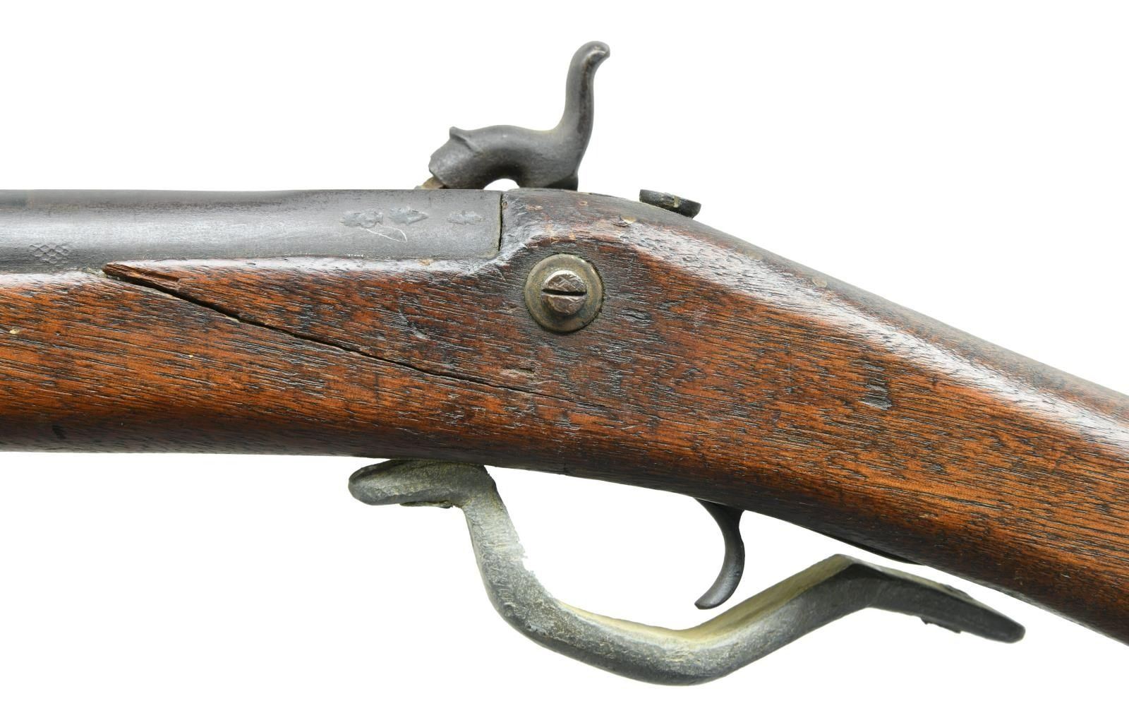 Cal. 62. NSN. London proofed 33" bbl. Back action lock. Sporterized musket stock w/ brass buttplate & bbl. band. Hardwood ramrod held by 2 pipes. CONDITION: metal has a brown patina w/ outline or previous rear sight base. Wood has varnish over unsanded appearance w/ handling marks & large crack between lock plate screws on left side. Cast iron triggerguard missing screw. Dark bore. (01-24270/MD). $100-150.