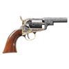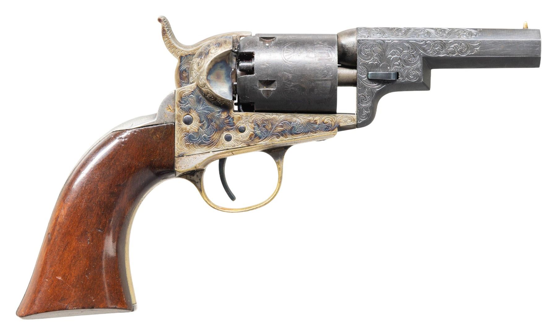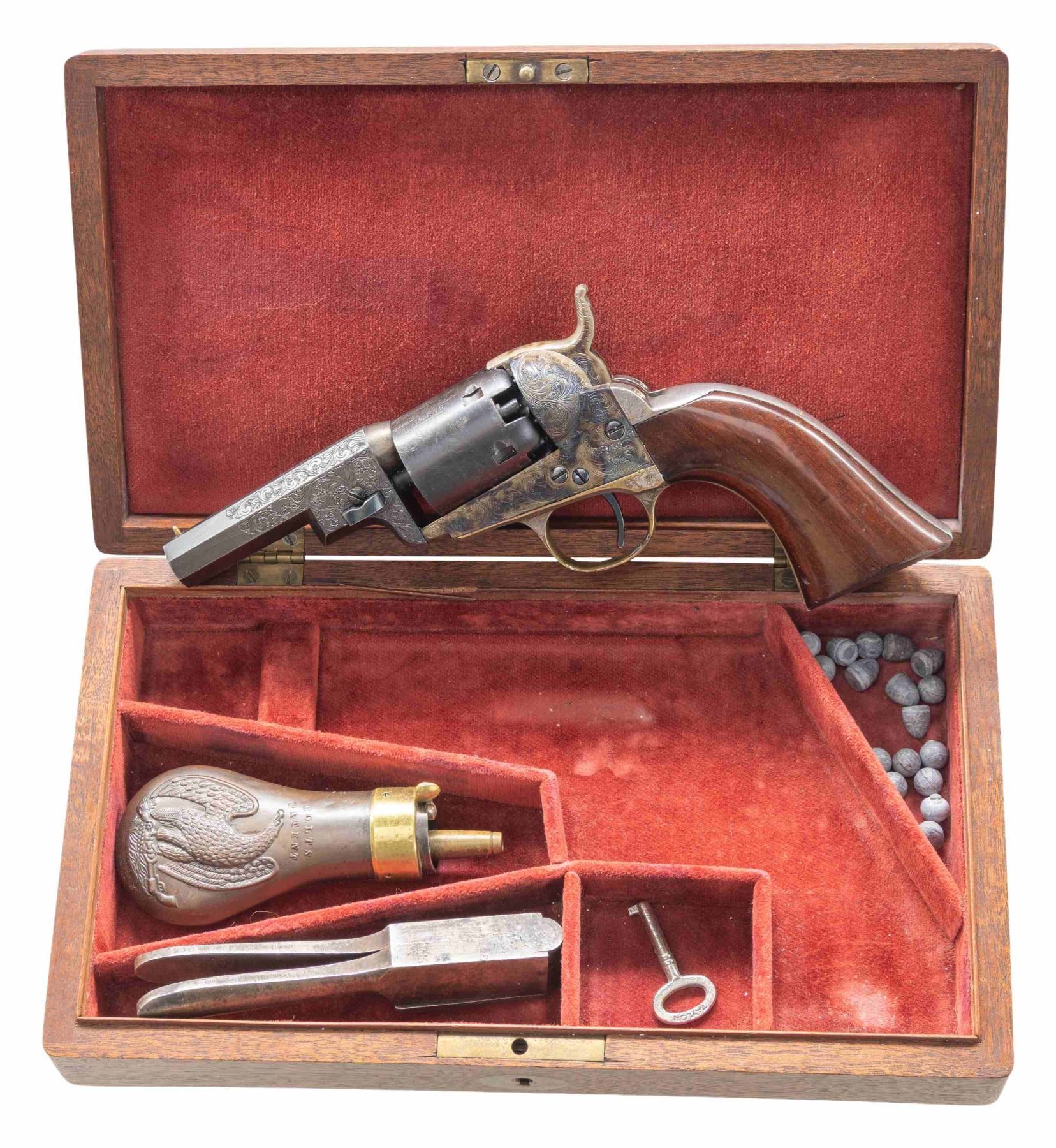 SINGLE ACTION PERCUSSION REVOLVER WITH CASE & ACCESSORIES. Cal. 31. S# 122869. Bbl. 3". 1849 Pocket Wells Fargo Model single action percussion revolver mfg. by Colt in 1856. Top flat of the octagonal bbl. is marked with Colt's single line address. Bbl. address has possibly been reapplied. Left side of the frame is marked "COLTS/ PATENT". Underside of trigger guard bow exhibits a spurious "A.H. FRANKLIN. CSA" inscription. Sides of frame, hammer, and bbl. feature professionally executed scroll engraving on punch dot backgrounds. Frame and hammer exhibit a finely reapplied case colored finish, with the steel cyl. and bbl. exhibiting a reapplied blue finish. Brass trigger guard and rear grip strap exhibit an original silver plated finish. Frame is mounted with a 1-piece sanded and revarnished wood grip. Brass cone type front sight with V-notch rear sight on hammer. All serialized parts are matching and include the frame, cyl. base pin, cyl., bbl., bbl. wedge, trigger guard, and rear grip strap. Frame, trigger guard, and grip strap's S# is stamped above an "8". UNATTACHED ACCESSORIES: wood display case featuring a red velour interior, containing a brass Colt powder flask, original Colt bullet mold, as well as a small assortment of projectiles. CONDITION: frame and hammer retain virtually all of their vibrant reapplied case colored finish overall, with some light fading present on the top strap of the hammer. Blued parts are excellent, with the cyl. exhibiting scattered spots/small patches of mild to moderate pitting beneath the finish. Cyl. scene has faded in some areas, but otherwise remains mostly intact. Brass trigger guard retains good amounts of its original silver plated finish, showing some flaking overall, with the trigger guard bow and grip strap having virtually completely flaked, showing through to a pleasing mellow patina. Rear grip strap retains the majority of its original silver plated finish, appearing to have been cleaned at one time, showing some areas of tarnishing. Relatively bright bore, exhibiting patches of mild to moderate pitting, while retaining well defined rifling throughout. Proper manual mechanics, albeit hammer pull is stiff. Grip shows a few marks and impressions beneath the finish, but otherwise remains sound. Display case is very good overall. (01-26698/MLW). ANTIQUE. $2,000-3,000.