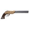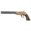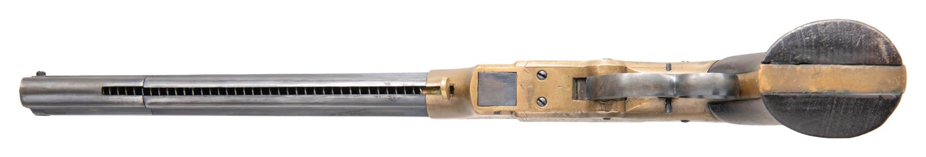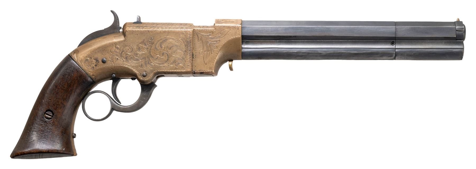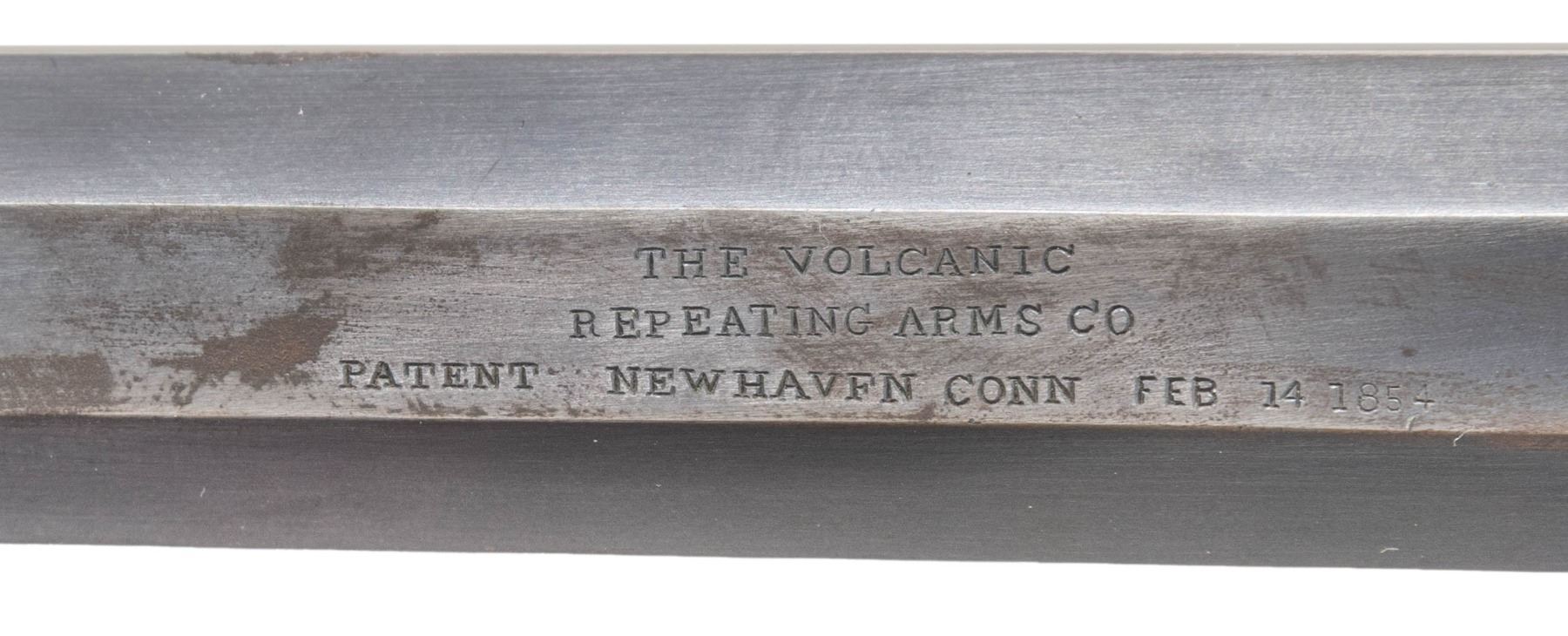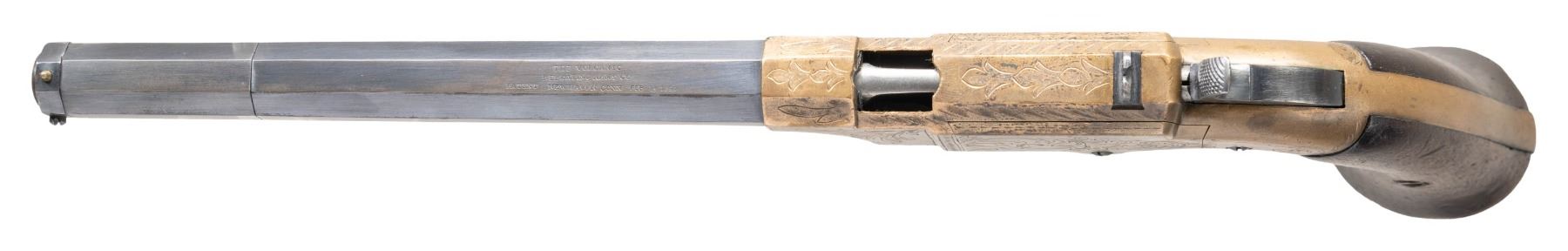 LEVER ACTION PISTOL. Cal. 41. S# 1523. Pistol is in standard configuration with blued 8" octagonal barrel, integral spring loaded magazine, fixed notch rear sight, pinched post front sight, engraved brass frame, varnished walnut grips. Made to shoot self-contained "rocket ball" cartridges with powder & primer contained in conical ball. Manufactured between 1855-1857 after formation of Volcanic Arms Company from Smith & Wesson after they sold their interests to investors including Oliver Winchester. Barrel markings: "THE VOLCANIC ARMS CO. / NEW HAVEN CONN / PATENT FEB 14 1854" on top flat. CONDITION: fine as refinished, barrel retains about half of its thinning reblued finish, missing rotating flange screw, address marking very good as freshened, frame has stained brass patina over custom scroll engraving applied after manufacture, replacement wood grips fit well with bulbous swell at edges. Mechanics need attention, well not hold cock, pitted rifled bore. (01-26761/JS). ANTIQUE. $4,000-6,000.