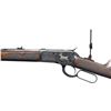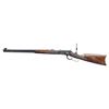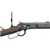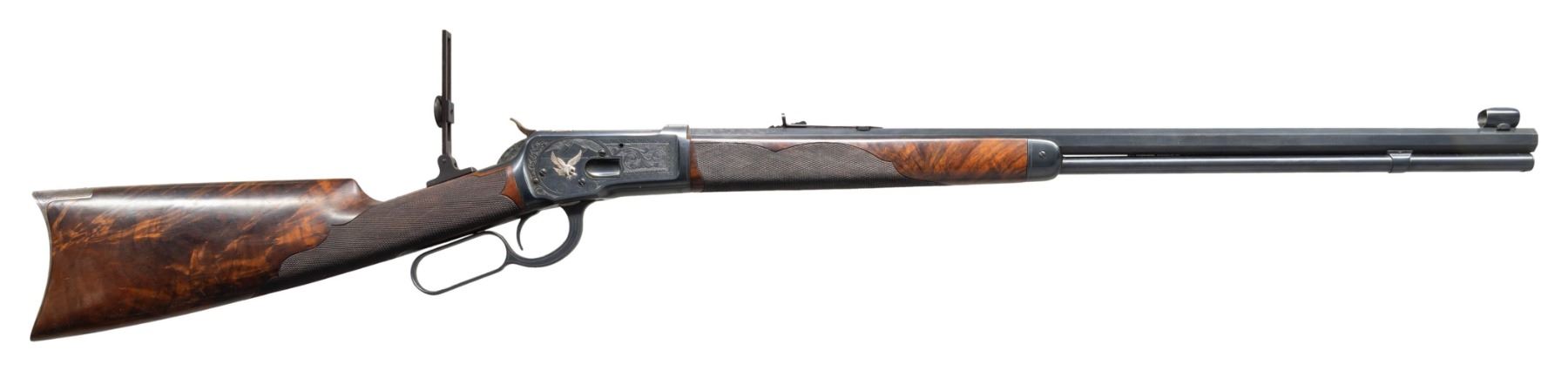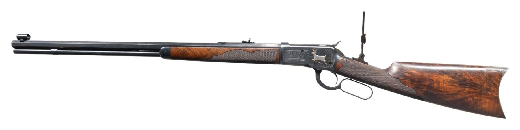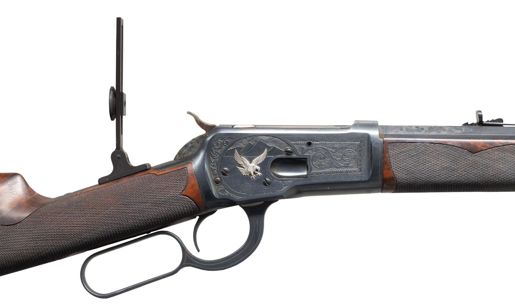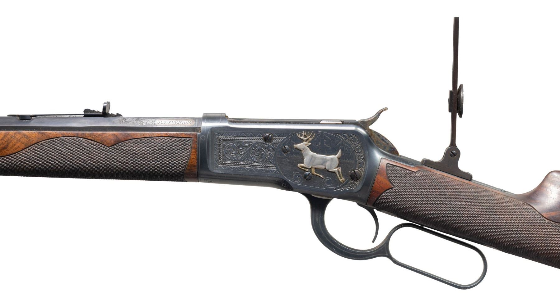 Cal. 357 Mag. S#. 856287. Mfg. 1919. Bbl. 24" Oct. with hooded beaded post front sight, sporting adjustable elevator rear sight and foliate scroll engraving with stippled background that terminates with two bands at the breech end. The rifle is rebored and rechambered; the caliber has been remarked within a silver panel on the left top facet of the octagonal bbl. The receiver is decorated with an embossed silver buck in stride that is an attractive contrast to the blued game scene panel that encircles it on its left side. The reverse carries a swooping embossed silver eagle that stands out from its blue mountain scene panel. The balance of both sides of the receiver have a well executed foliate scroll with stippled background and zig zag border engraving. The top tang has an added aftermarket peep sight that is decorated with a simple line inlay that matches the bands located on the lever, nosecap and breech end of the bbl. The nicely figured straight grip walnut stock set has custom wrap around checkering with an engraved case colored smooth steel crescent buttplate. CONDITION: overall very fine as restored at the time of upgrade with 98% blued finish coverage showing only a few minor handling marks; light scratches directly behind front sight. Sharp checkering and markings. The embossed animals are well executed and are an attractive addition to this rifle. The stock set is very fine with only scattered mild handling marks. Bright bore with strong rifling. Hammer has been re-casehardened and safety notch does not hold properly. 357 mag. cartridges failed to cycle into chamber; 38 spl. cartridges cycled properly. Appears that slight radius at bottom mouth of chamber would correct the issues. (25-1293/ZAL). CURIO. $1,000-2,000.