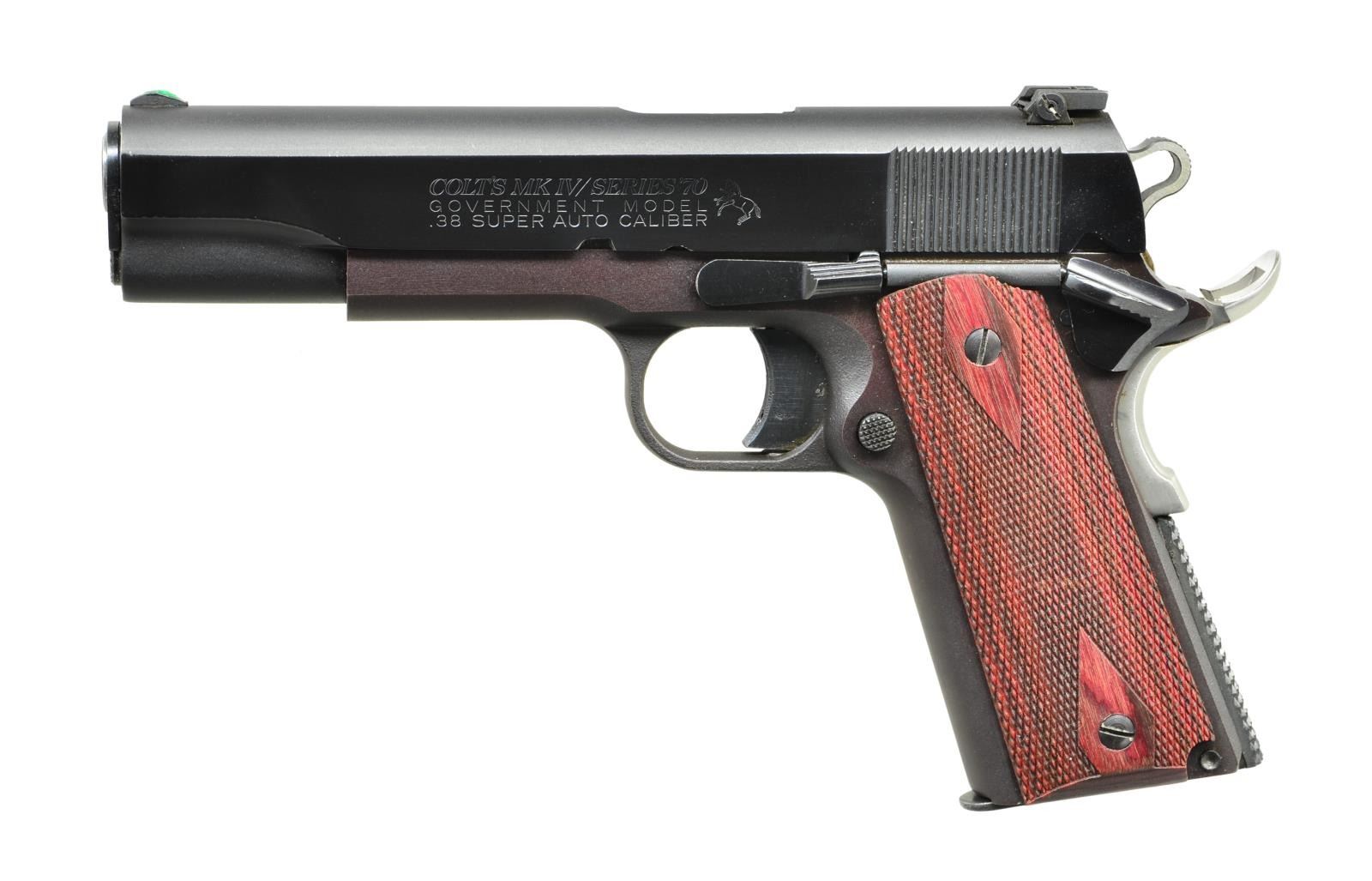 PISTOL. Cal. 38 Super. S# 55300. Bbl. 5". Matte finish Essex Arms Corp. frame w/ Colt MK IV/Series 70 Government Model serrated slide. Standard blade front sight adjustable rear white outline sight. Extended beavertail grip safety. Checkered rubber mainspring housing. Hogue dbl. diamond checkered deluxe grade rosewood grips. Serrated skeletonized hammer. Right side of slide at muzzle end engraved "Forrest Special". Mag: 2 steel mags. UNATTACHED ACCESSORIES: plastic carry case. CONDITION: slide retains its deep rich factory blueing w/ only gentle wear on a few high spots. Front sight painted high vis green. Grips free from any apparent blemishing. Bright bore w/ strong rifling. Fire control mechanism appears to function correctly when cycled by hand. (22-1800/JZ) MODERN. $1,000-1,500.