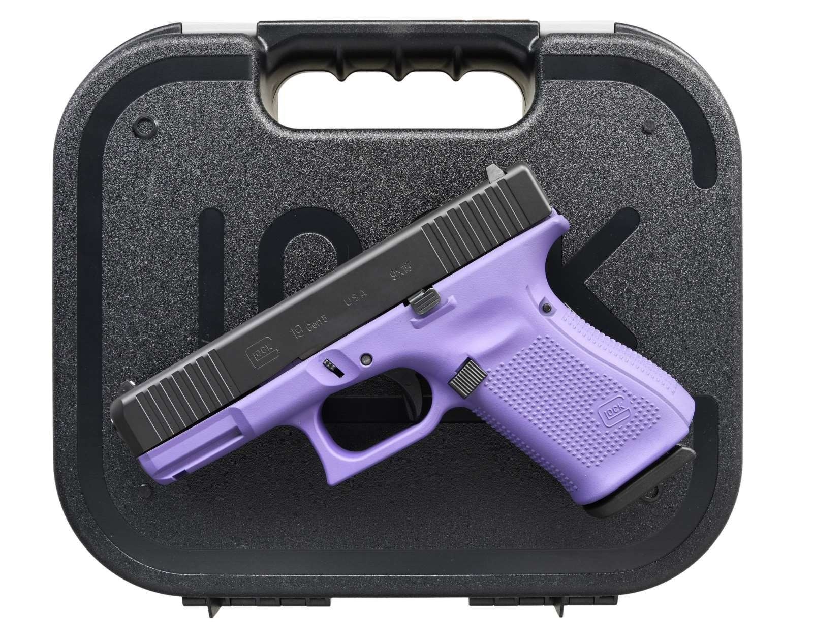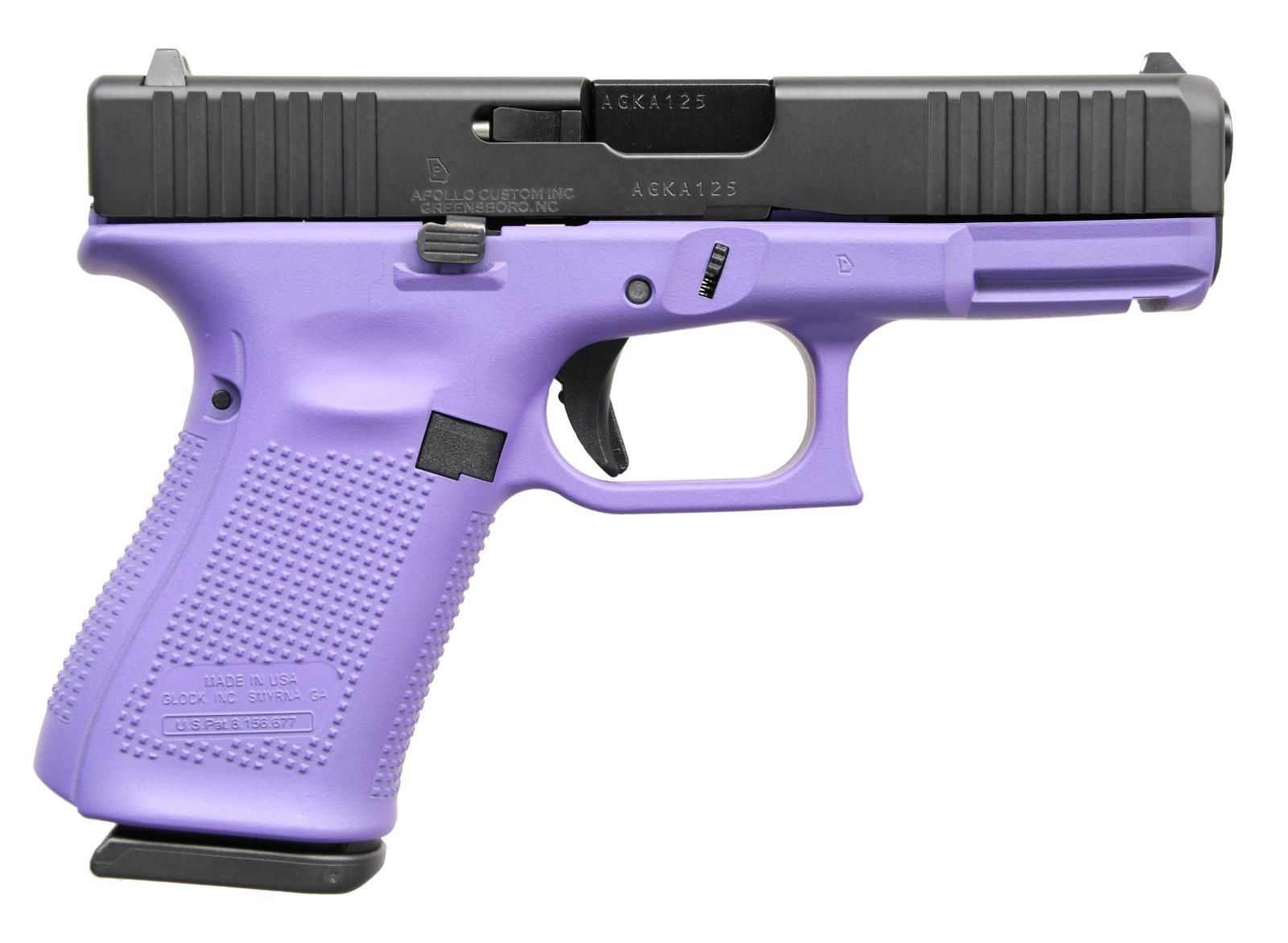 Cal. 9x19. S# AGKA125. Bbl. 4". Standard white outline Glock sights. Professionally refinished pistol by Apollo Custom of Greensboro, NC. Black Cerakote slide w/ Apollo logo, front & rear serrations. Ambi slide release. Enlarge mag release. Purple finished polymer frame w/ accessory rail. MAGS: 3-15 rd. factory. UNATTACHED ACCESSORIES: factory hardcase matching numbered to gun w/ foam inserts, mag loader, paperwork, cable lock & two spare backstraps. CONDITON: all aspects near excellent. PROVENANCE: The Collection of Gun Sport Ltd owned by Jon R. Thomas. PROVENANCE: The Collection of Gun Sport Ltd owned by Jon R. Thomas. (23-2905/MJC). MODERN. $350-550.