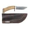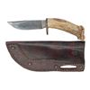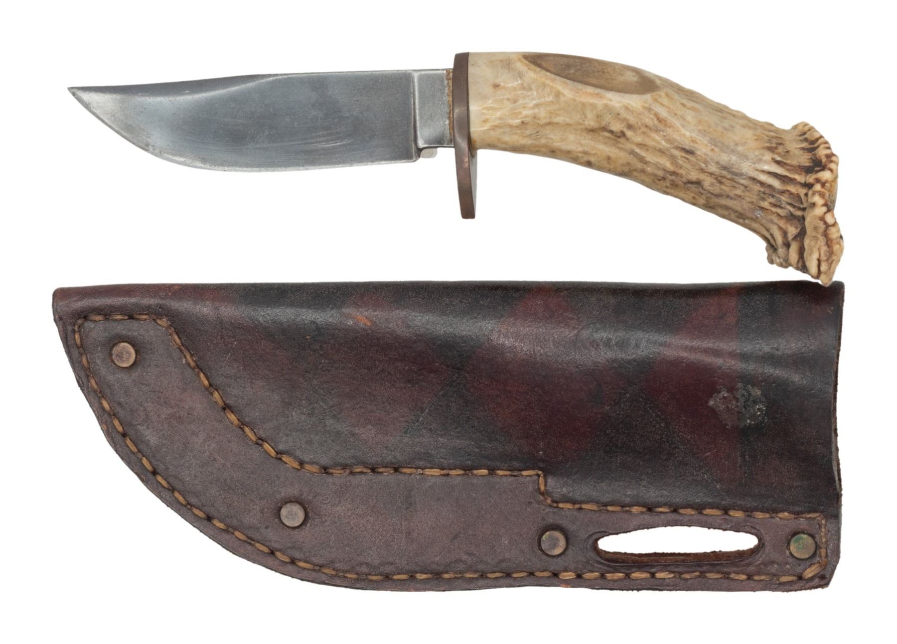 9.5" overall, 5" clip point blade, heavy copper lozenge shaped guard, shaped crown stag handle, Kennedy half dollar pommel cap. Slotted brown Plains-style leather sheath. CONDITION: very good overall. (02-25222/JS). NON-GUN. $200-400.