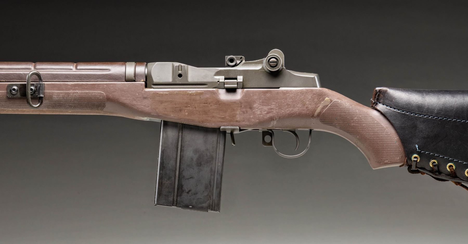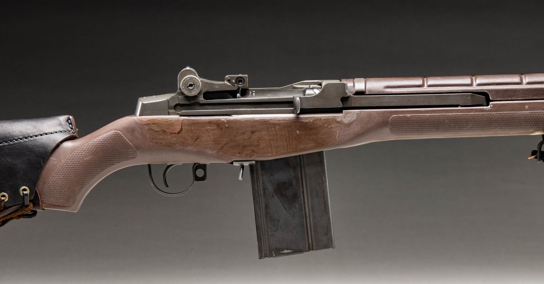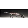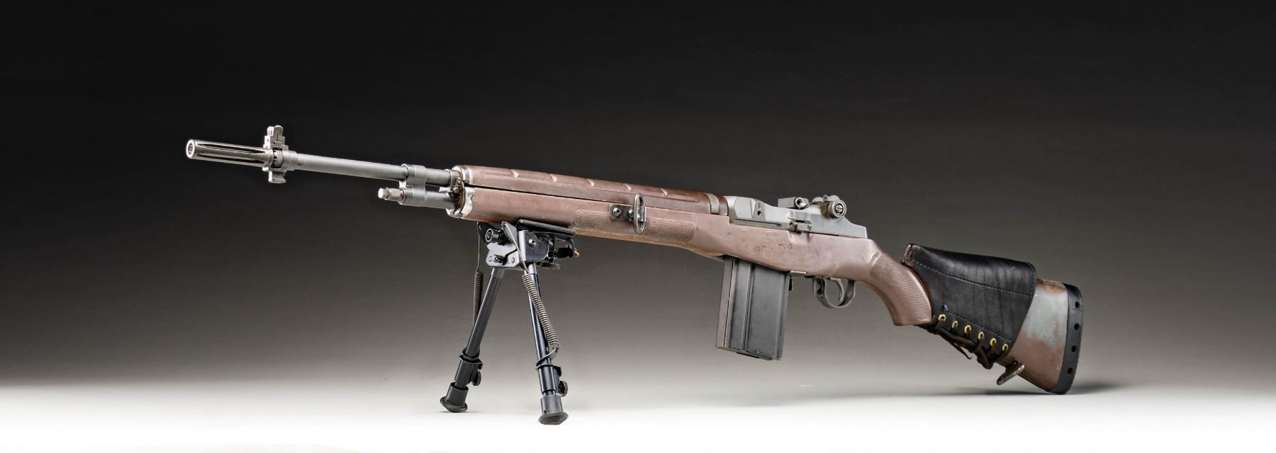 RIFLE. Cal. 308. S# 000001. Bbl. 22". XM21 (M1A) semi-automatic rifle mfg. by NMSAMA. Top rear of the receiver is marked "XM.21/ NMSAMA/ *000001". Metal components exhibit a reapplied parkerized finish overall. 1-piece bedded checkered brown M14 synthetic pistol grip stock with brown synthetic handguard and black rubber recoil pad. Left side of stock exhibits an area of replaced material where the M14 selector lever was cut. Left side of stock is fitted with a steel sling swivel. Buttstock is fitted with a Cabela's laced leather cheek rest, with a Harris SL folding bipod present on the underside of the forearm. Forearm ferrule has been unitized to the gas cyl. tube via an area of welding on either side. Long pattern flash hider with integral bayonet lug and dovetailed blade front sight. Standard M14/M1A adj. aperture rear sight. "TRW" marked bolt, trigger assembly, and op rod are matching to the receiver via "XM.21.01" on the bolt, and "M21-01" on the trigger housing and op rod. MAGS: 1 parkerized/phosphate finished steel 20-rd. marked with an upside down "BRW/ S-I". UNATTACHED ACCESSORIES: green canvas soft case. CONDITION: metal components retain virtually all of their reapplied parkerized finish, exhibiting a few light superficial handling marks overall. Brilliant mirror bore, retaining sharp and well defined rifling throughout. Proper manual mechanics. Stock shows scattered marks from handling and storage, but otherwise remains sound. (25-3024/MLW). MODERN. $800-1,200.