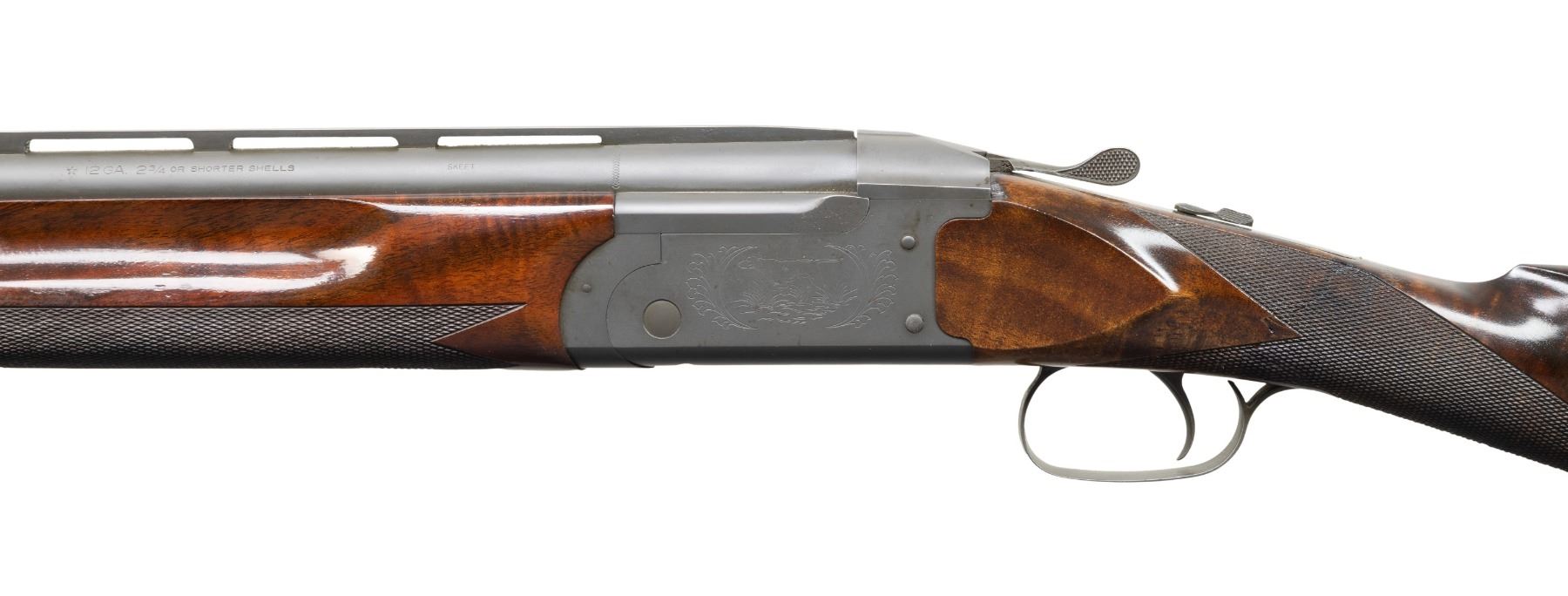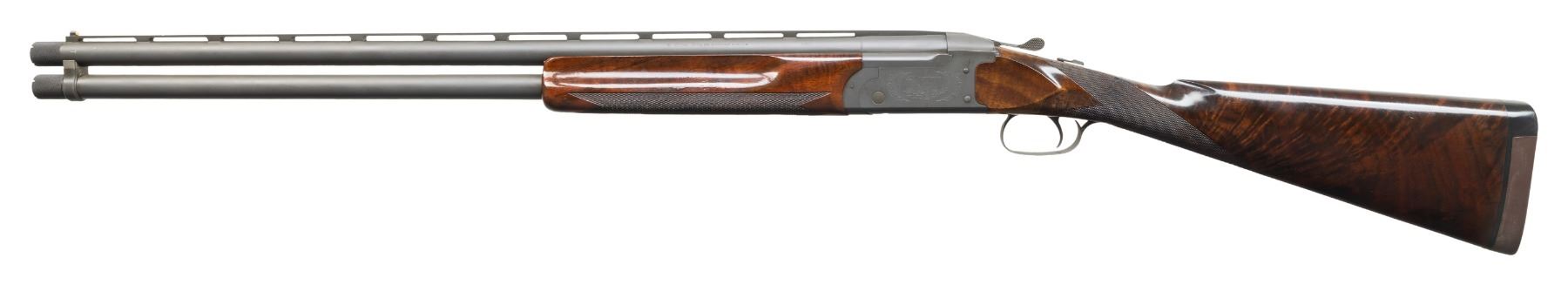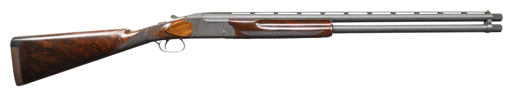 Cal. 12 Ga., 2 3/4". S# OU 22361. Originally mfg. March 1974 based on "AY" barrel code. Custom threaded for Briley extended Mod & Imp. Mod choke tubes. Custom parkerized style matte finish. Action has SST & ejectors. Custom made checkered walnut stock set w/ fine fiddle figure, straight grip & 15" LOP to brown pad. WEIGHT: 8 lbs., 9 oz. UNATTACHED ACCESSORIES: Full, Mod & IC Briley extended choke tubes. CONDITION: very good refinished metal. Very good wood finish showing light marks plus professional epoxy repair aligned with rear of tangs. Shiny bores with light fouling. (25-7022/MD). MODERN. $1,200-1,800.